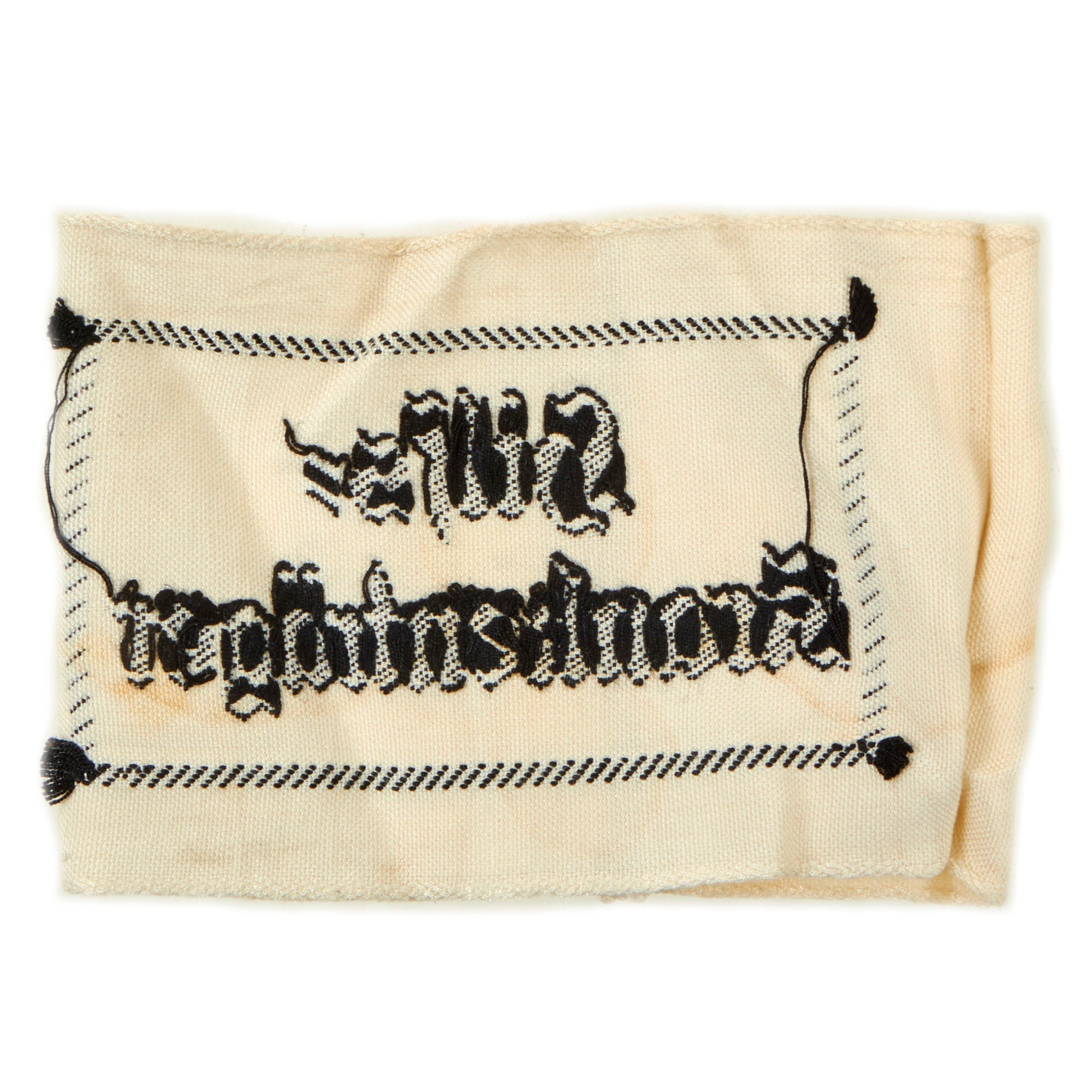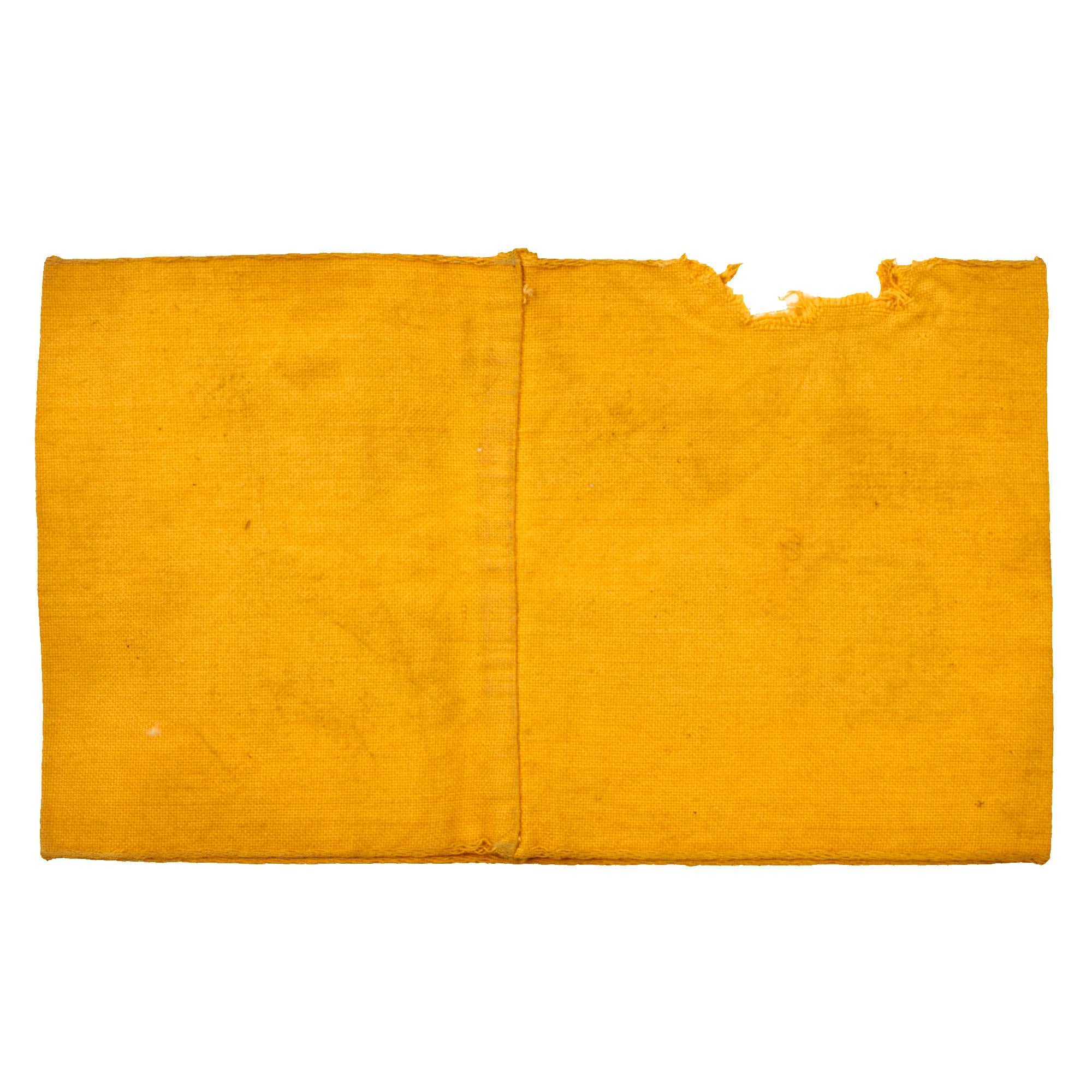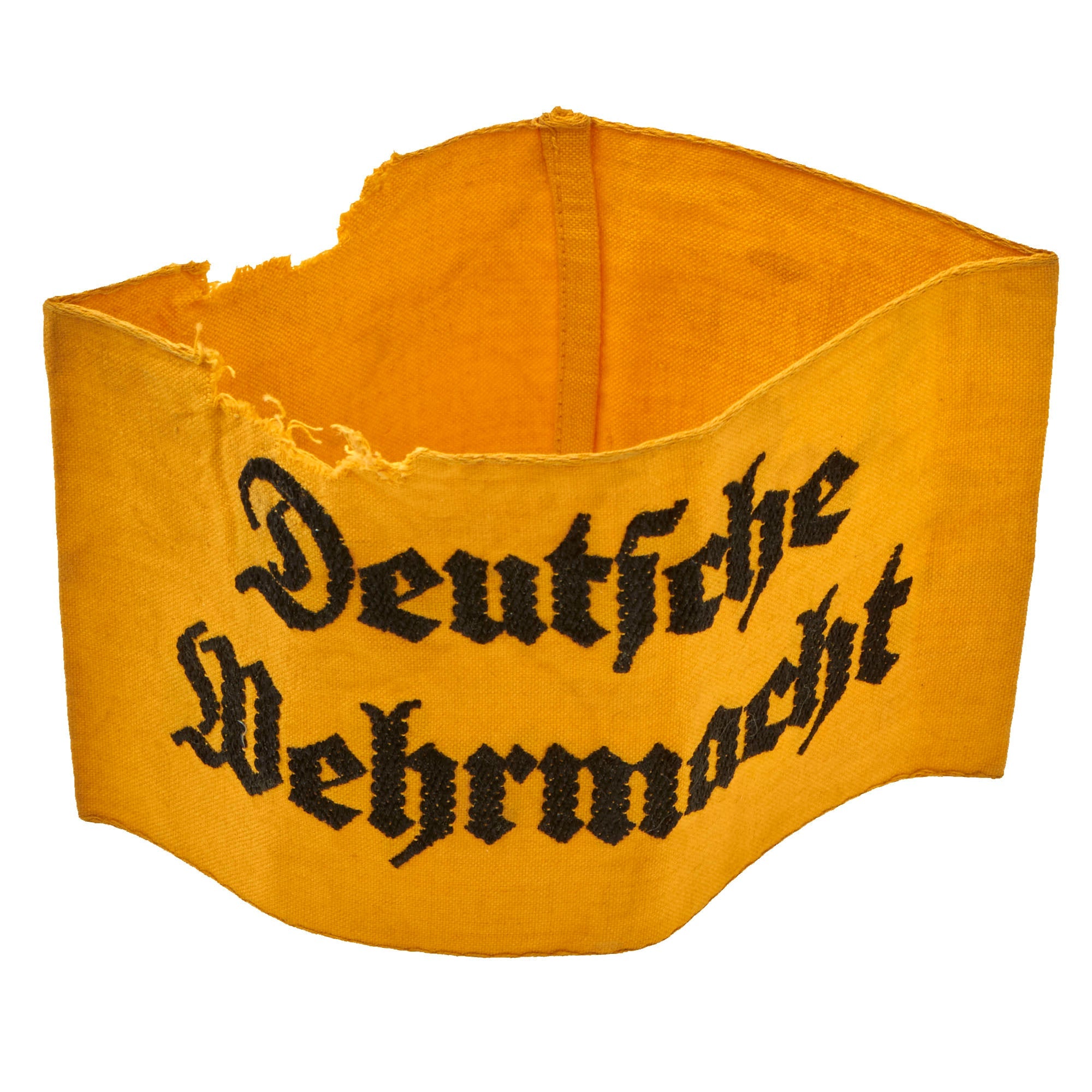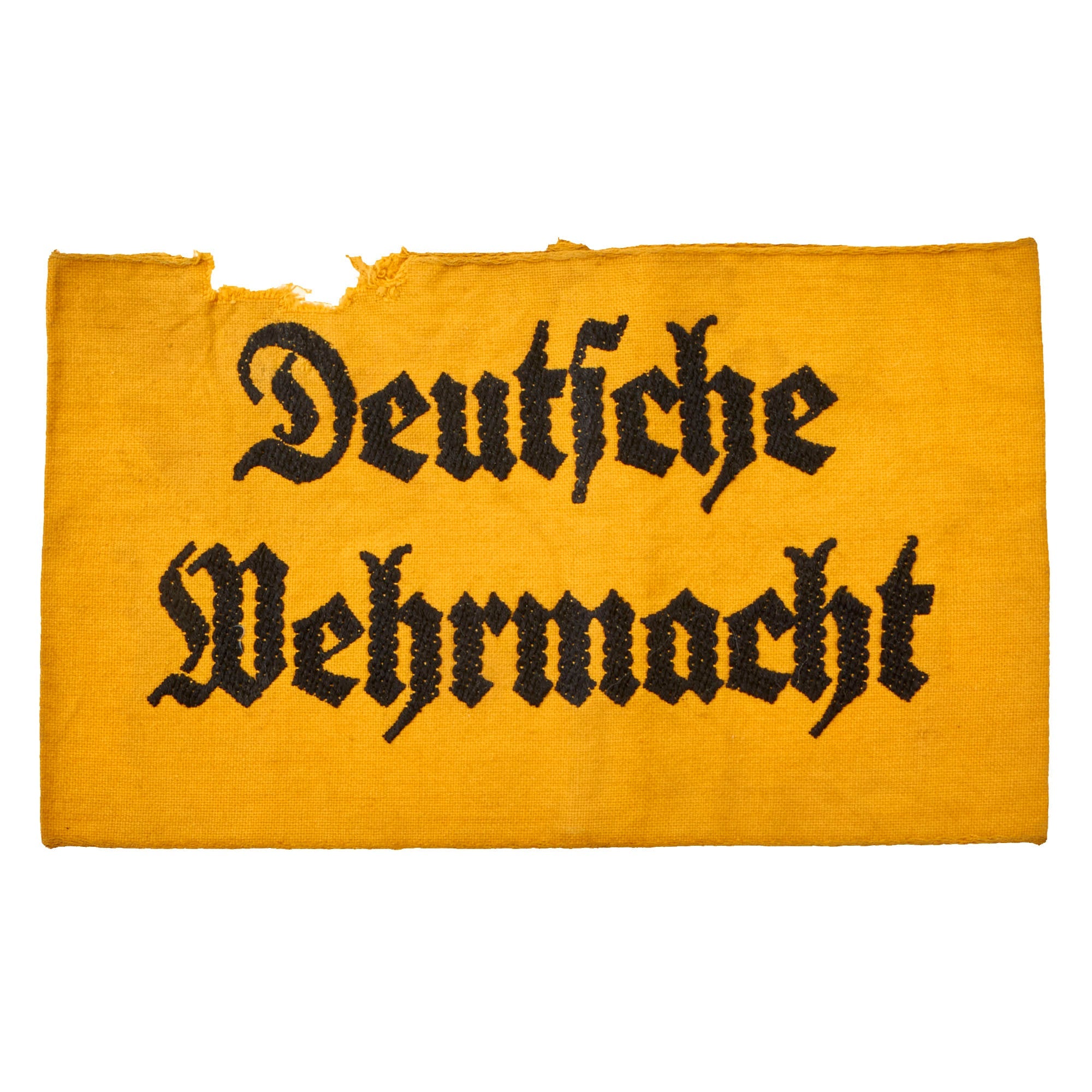 - Deutsche Wehrmacht Embroidered Armband: The yellow Deutsche Wehrmacht armband was worn by uniformed German personnel, who were attached to the Armed Forces during WWII. Often, these were worn by men of the Reichsarbeitsdienst and Reichsbahn who were operating with the German Army in the occupied countries. It has a textbook BeVO woven insignia, and measures 13 3/4" x 4", with the ends sewn together in the back. It does not have any depot stamps, and definitely has some staining from use, as well as some damage to the upper left edge as shown.