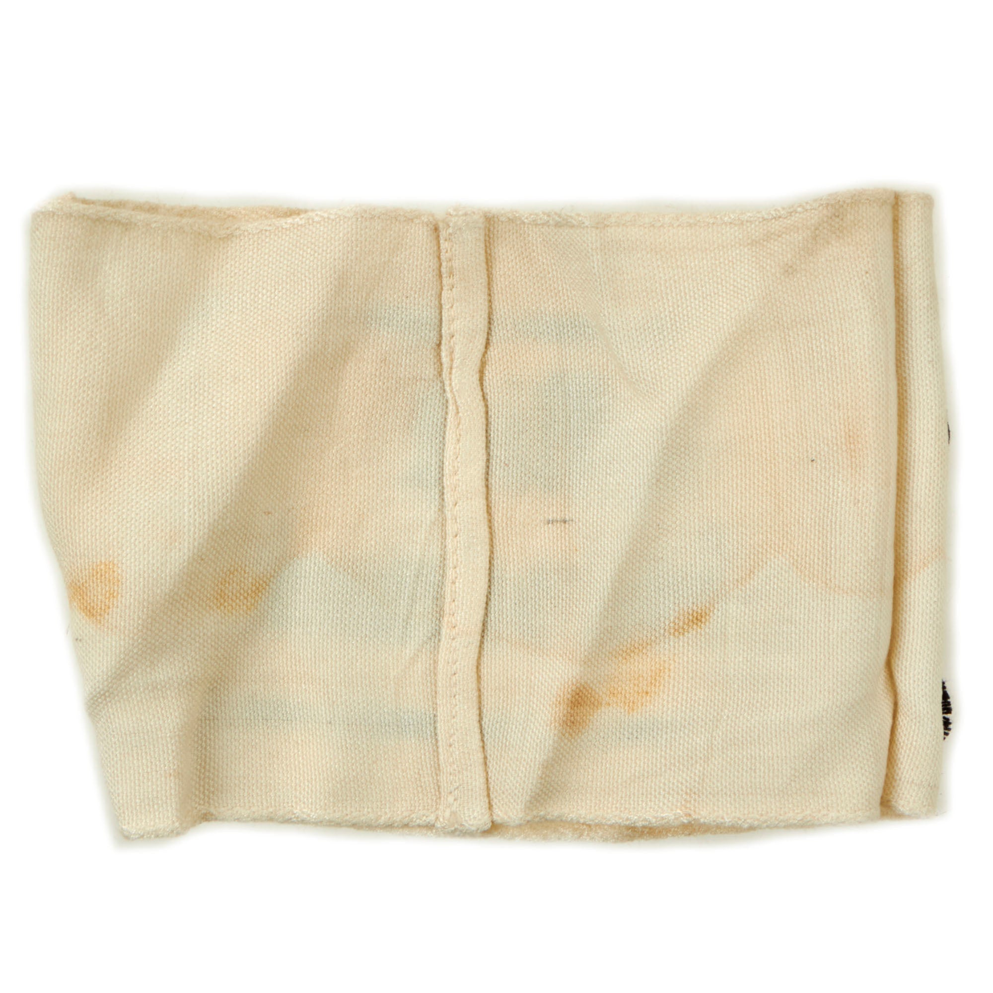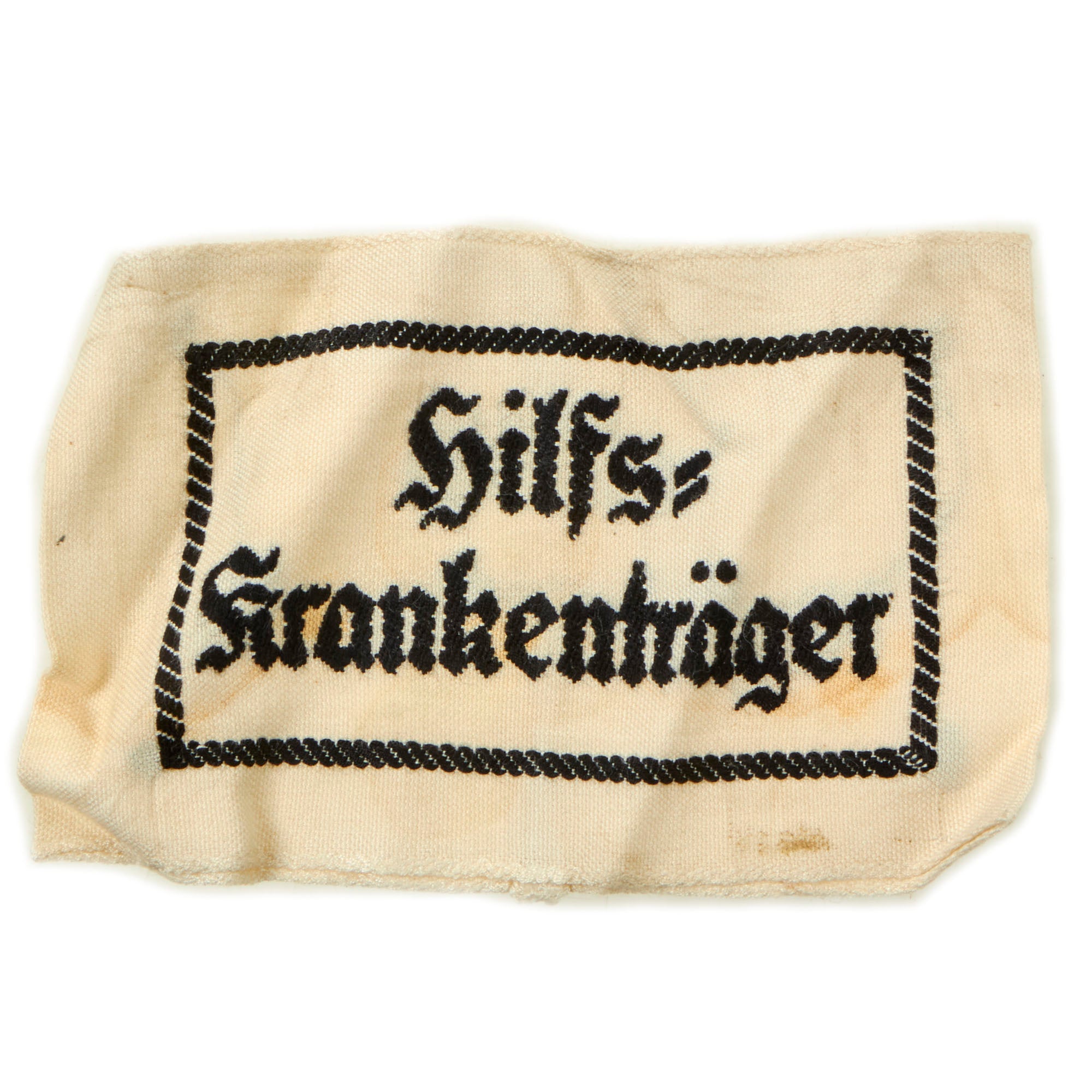 - Hilfs=Krankenträger (Stretcher Bearer) Embroidered Armband: This is a lovely example of a 1st pattern armband. It is made out of an off-white cotton base that has a black machine embroidered cotton inscription. The obverse reads: "Hilfs-Krankentrager" (Stretcher Bearers) in black, which is surrounded by a black rectangular border and all lies on the white base. Measures 13 1/2" x 4 1/8", and is sewn together in the back. It shows some light staining, but no damage.