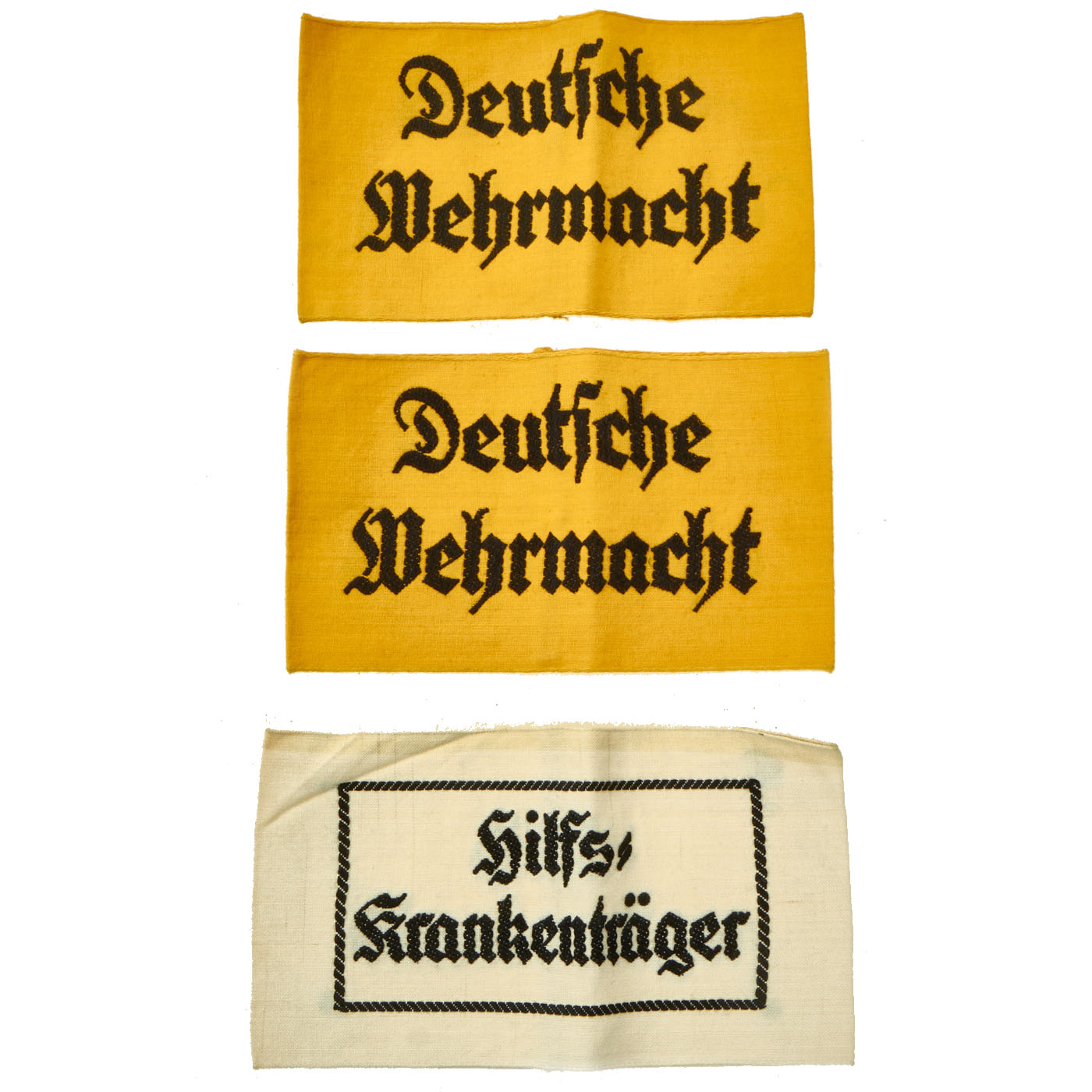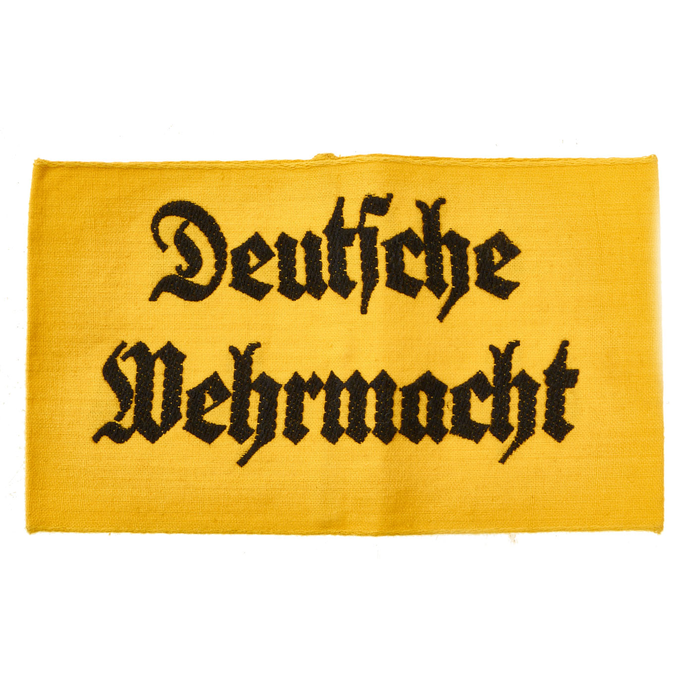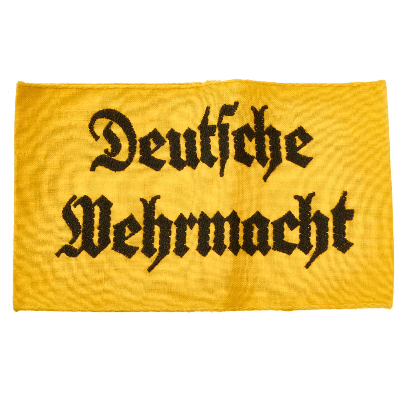 - x2 Deutsche Wehrmacht Embroidered Armbands: The yellow Deutsche Wehrmacht armband was worn by uniformed German personnel, who were attached to the Armed Forces during WWII. Often, these were worn by men of the Reichsarbeitsdienst and Reichsbahn who were operating with the German Army in the occupied countries. It has a textbook BeVO woven insignia. There are no stamps on either armband and they are both in wonderful condition.
