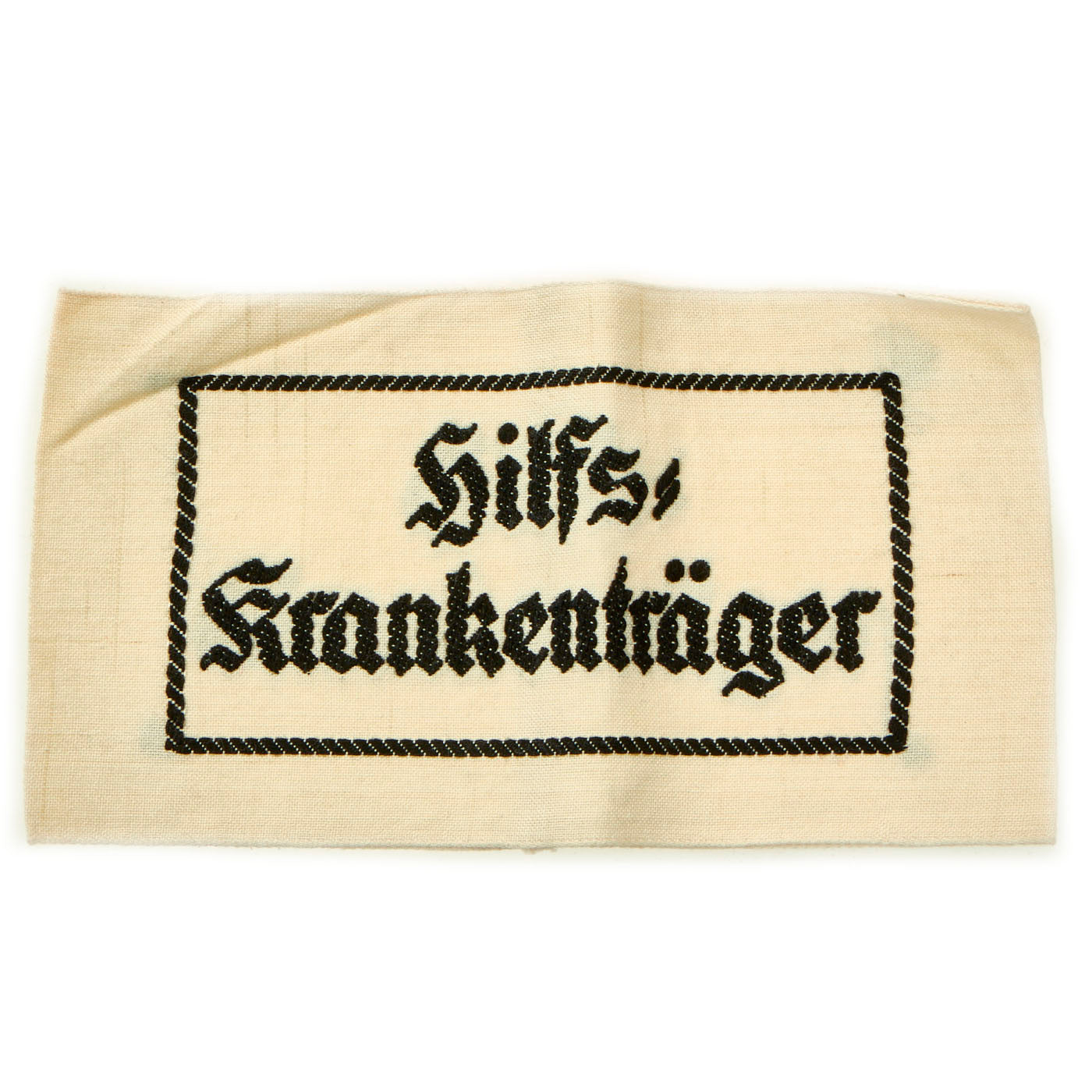 - Hilfs-Krankenträger (Stretcher Bearer) Embroidered Armband: This is a lovely example of a 1st pattern armband. It is made out of an off-white cotton base that has a black machine embroidered cotton inscription. The obverse reads: "Hilfs-Krankentrager" (Stretcher Bearers) in black, which is surrounded by a black rectangular border and all lies on the white base.