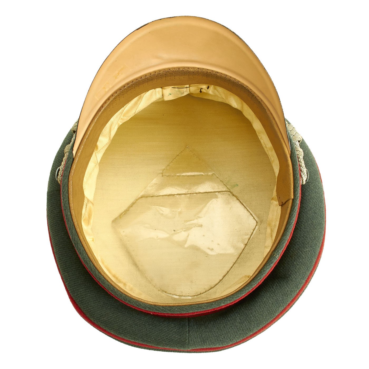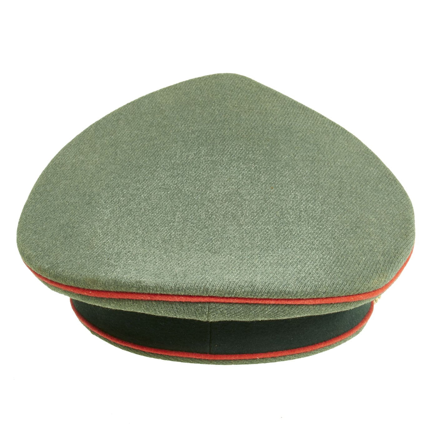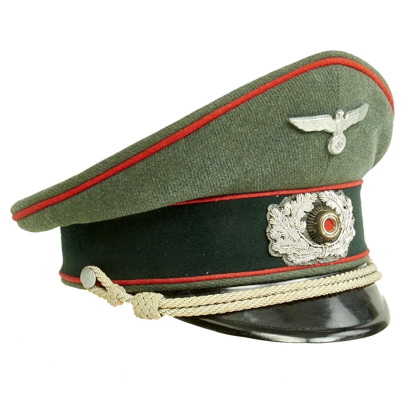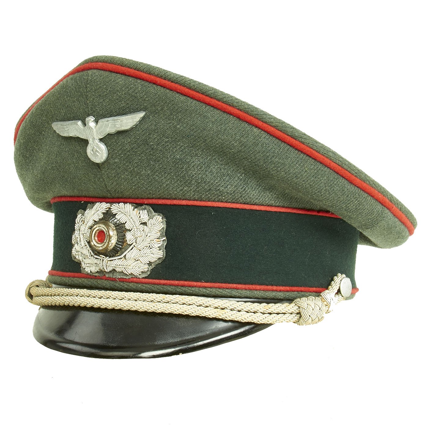 Original Item: Only One Available. This cap is a excellent example of a German WWII Wehrmacht Heer Army Officer Schirmmütze visor cap, and it really is in great shape. It features the typical green wool gabardine construction with a forest green band and a traditional high forward crown. The also has matching Hochrot (Deep Red) piping along the top edge and flanking either side of the band, the Corps Color (Waffenfarbe) for Artillery, as well as General Level Officers. It has the correct silver bullion chin strap, indicating that it is for an officer.
