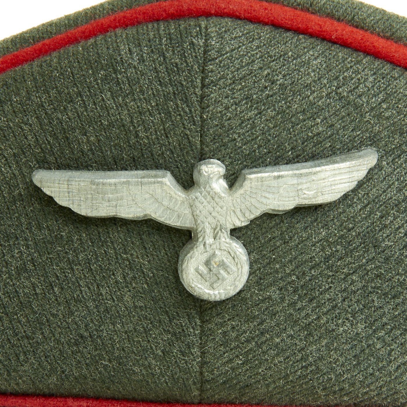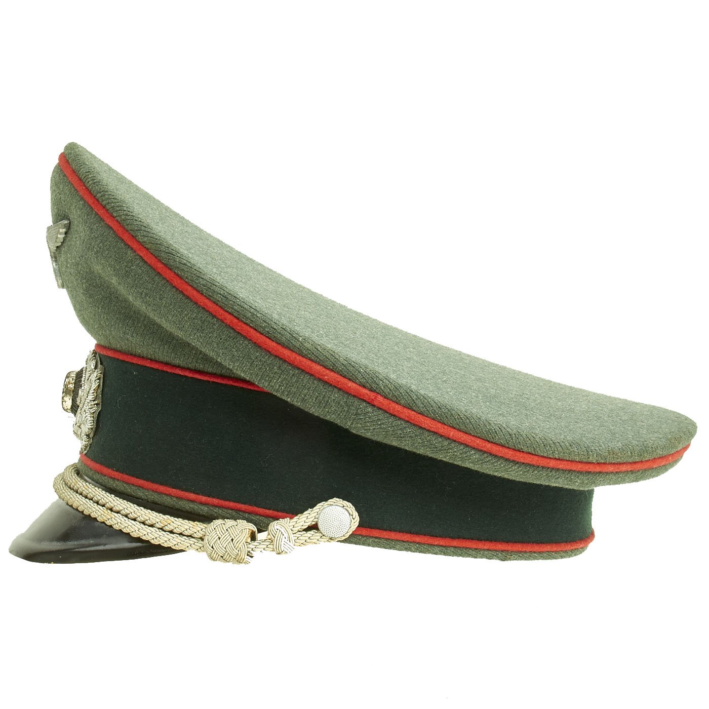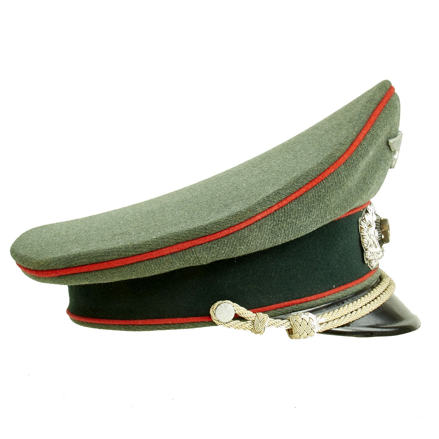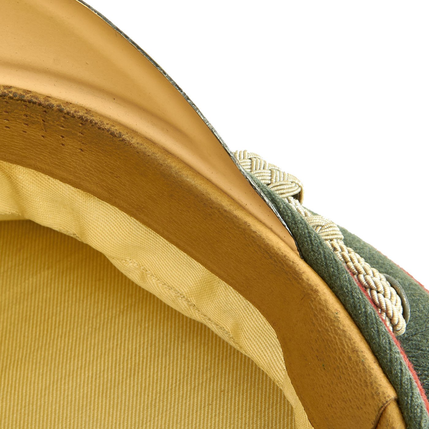 Original Item: Only One Available. This cap is a excellent example of a German WWII Wehrmacht Heer Army Officer Schirmmütze visor cap, and it really is in great shape. It features the typical green wool gabardine construction with a forest green band and a traditional high forward crown. The also has matching Hochrot (Deep Red) piping along the top edge and flanking either side of the band, the Corps Color (Waffenfarbe) for Artillery, as well as General Level Officers. It has the correct silver bullion chin strap, indicating that it is for an officer.