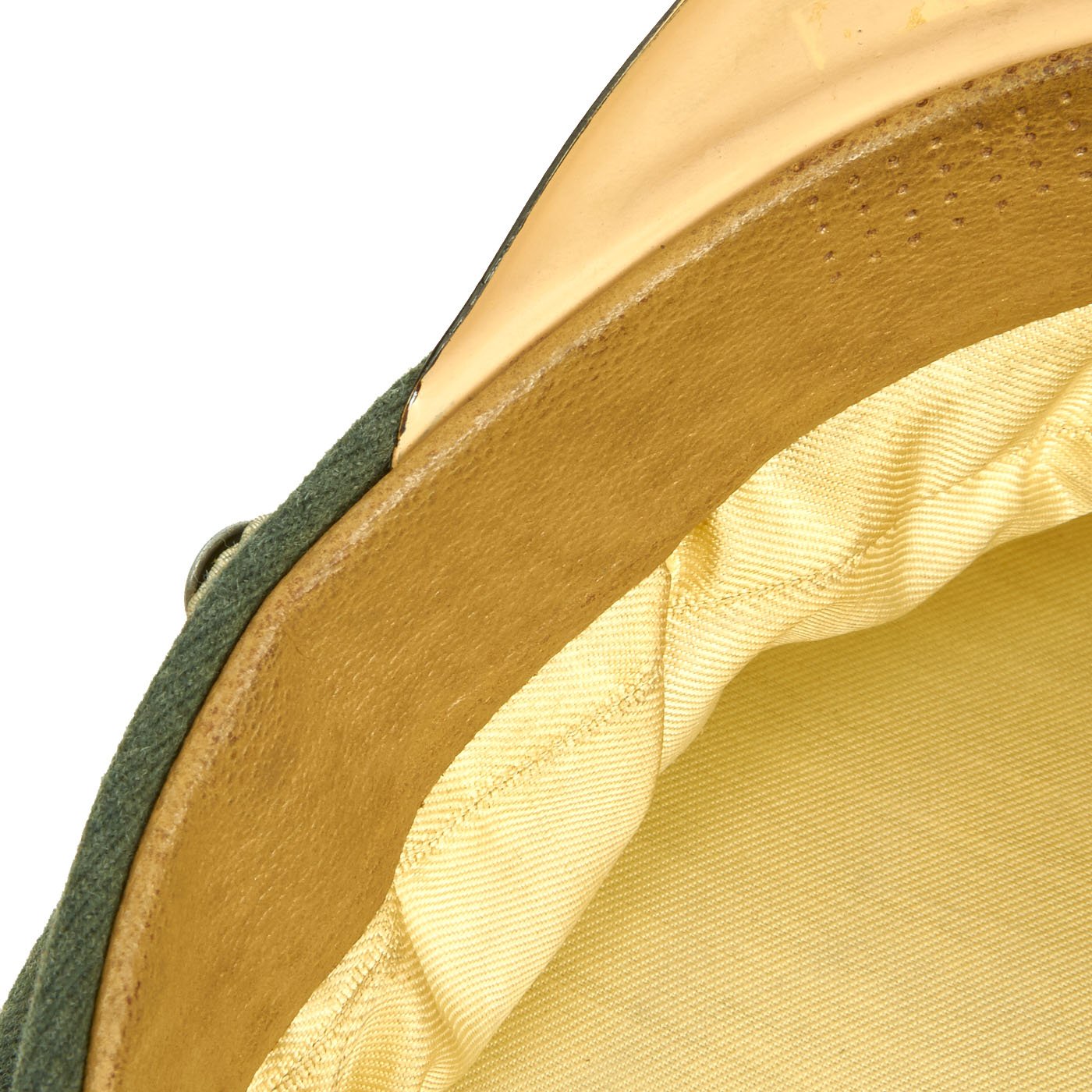 On the underside, it is ink stamped with P.P. Berlin / G8, though it is not entirely clear. We do not know if this is a maker marking, or some type of unit marking. The inside of the cap is lined with cream sheer fabric. The top plastic shield is mostly present, though some of the stitching has pulled, and there is no maker name or logo on the crown.