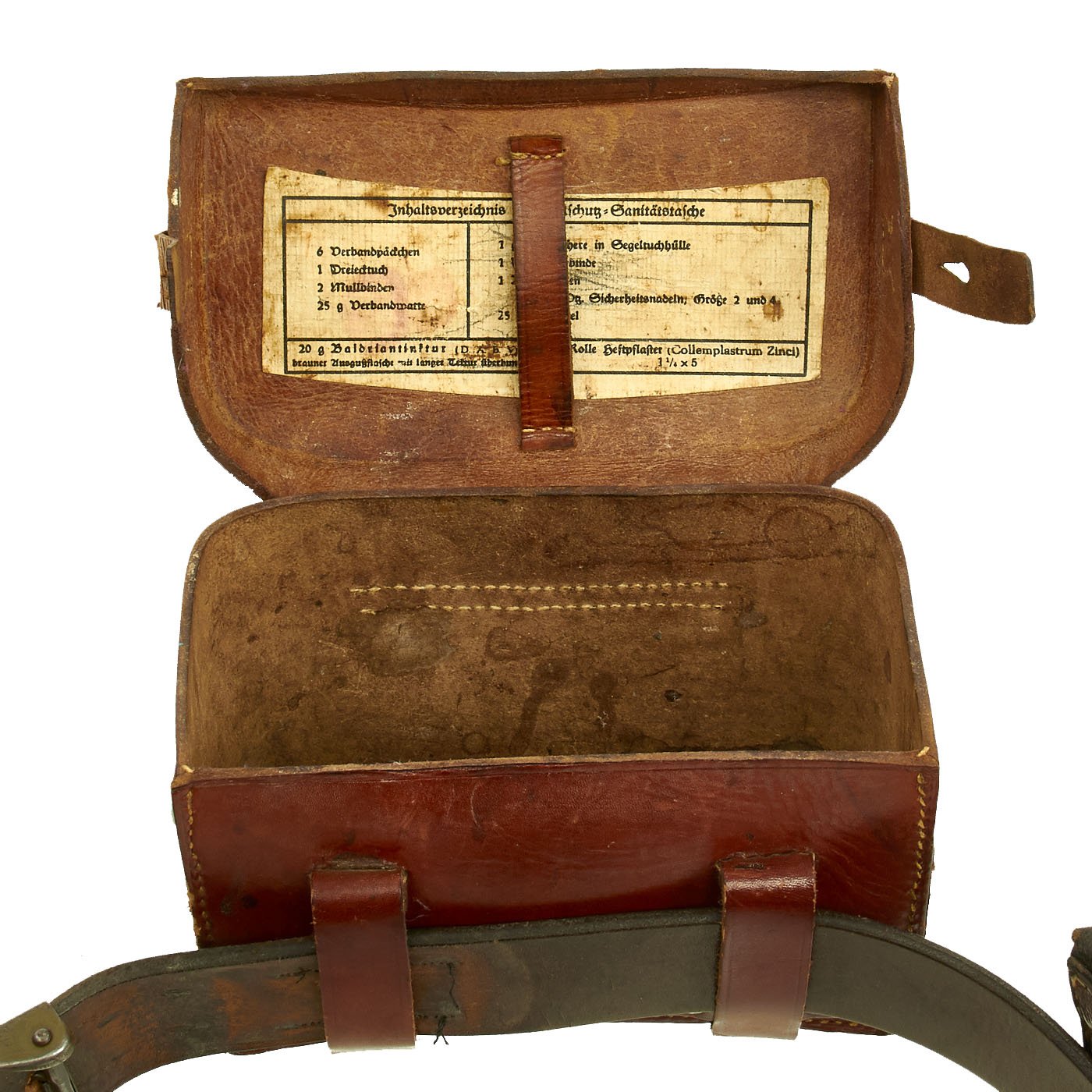 Below this it is marked with a Waffenamt WaA100 inspection stamp. Inside the lid there are some ink markings as well as a label that reads Inhaltsverzeichnis Luftschutz=Sanitätstasche (Contents Air Raid Medical Bag), and a list of contents is given below that. Condition is very good, with just a bit of staining from age, and a lovely red color.