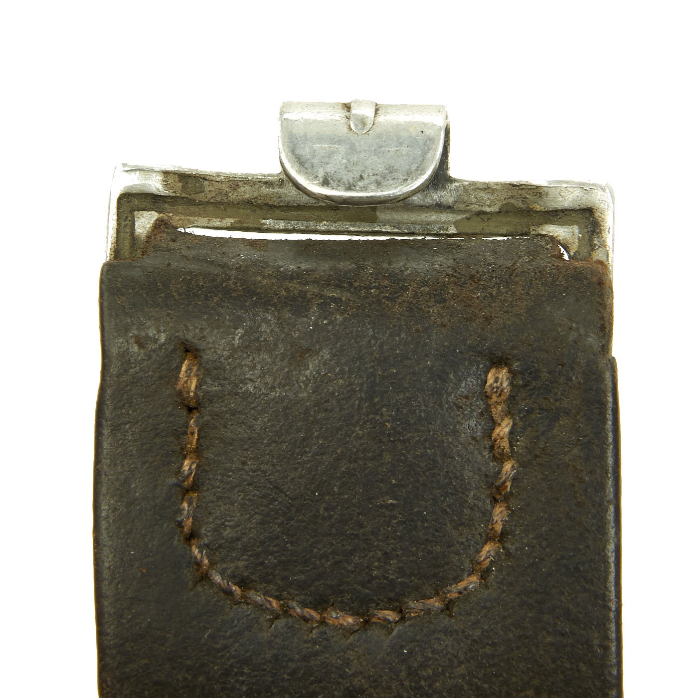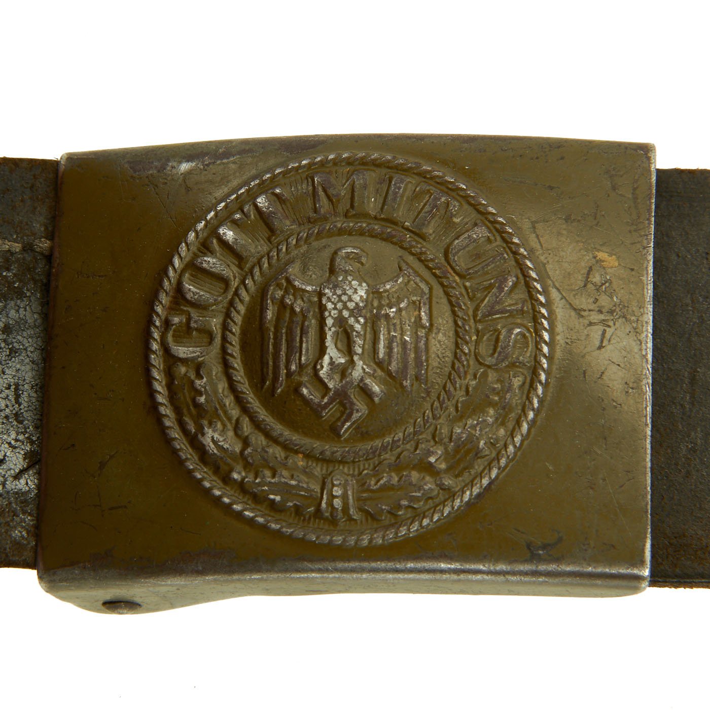 The set is held together with an EM/NCO's Steel Belt Buckle (Koppelschloß) with correct leather belt. The buckle is embossed with the Heer motto GOTT MIT UNS ("God with us") surrounding a NSDAP Party Eagle. Nice fieldgrey painted steel construction box buckle with a smooth background. The buckle is in good condition, with probably about 75% of the original paint remained, and wear on the edges. There is also some oxidation where the paint has worn off. The maker mark R.S. & S. can still be seen inside the buckle which represents Richard Sieper & Söhne of Lüdenscheid, a German city with a large garment accessories industry.