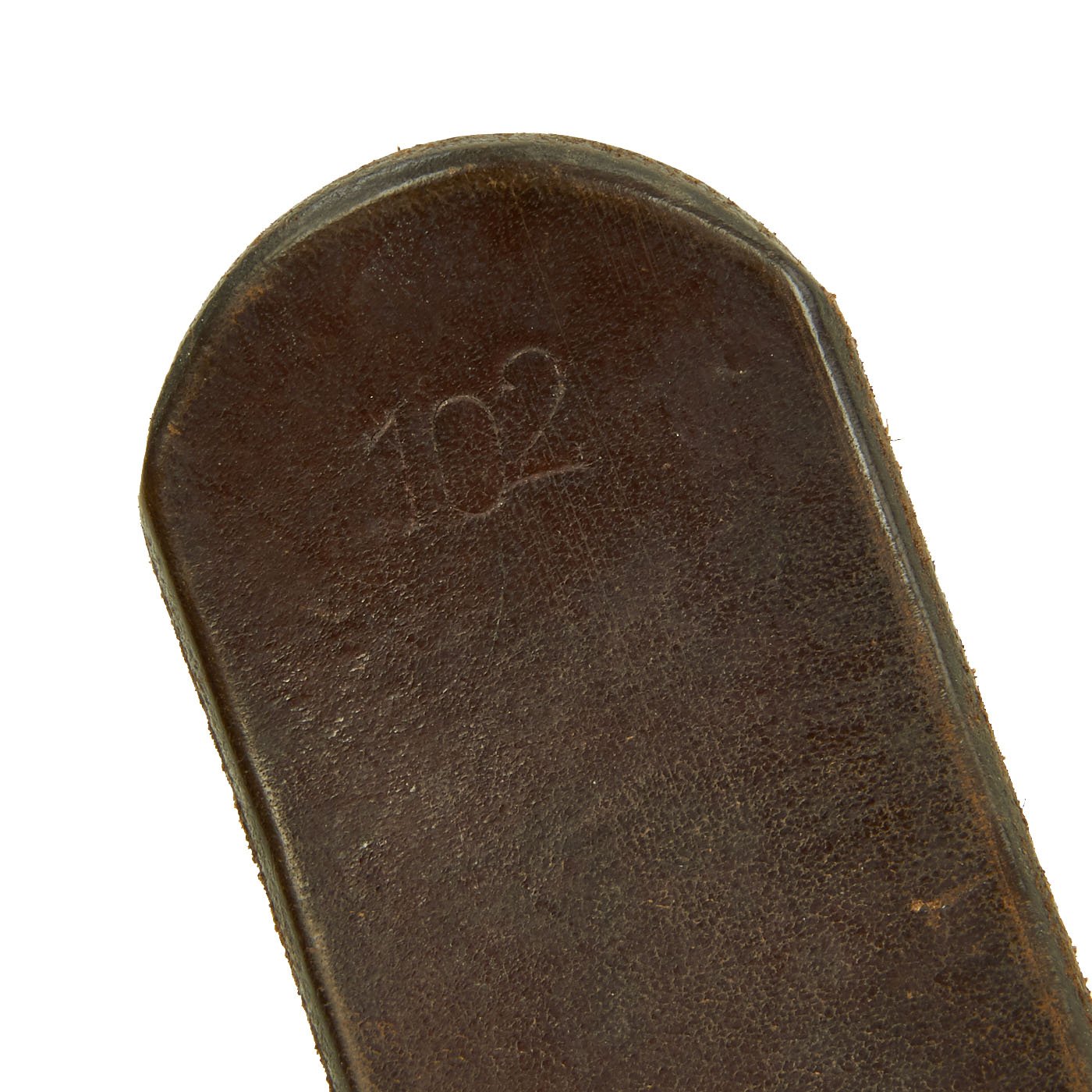 The belt itself measures 41” when fully extended, and is in good service worn condition. The black finish on the exterior is quite worn, but still visible, and the leather is soft, with no major cracking. The leather tab for size adjustment looks to have been moved once, and then removed altogether, with holes added to directly mount the buckle to the belt. It is also stamped 102 at one end, for a length of 102cm.