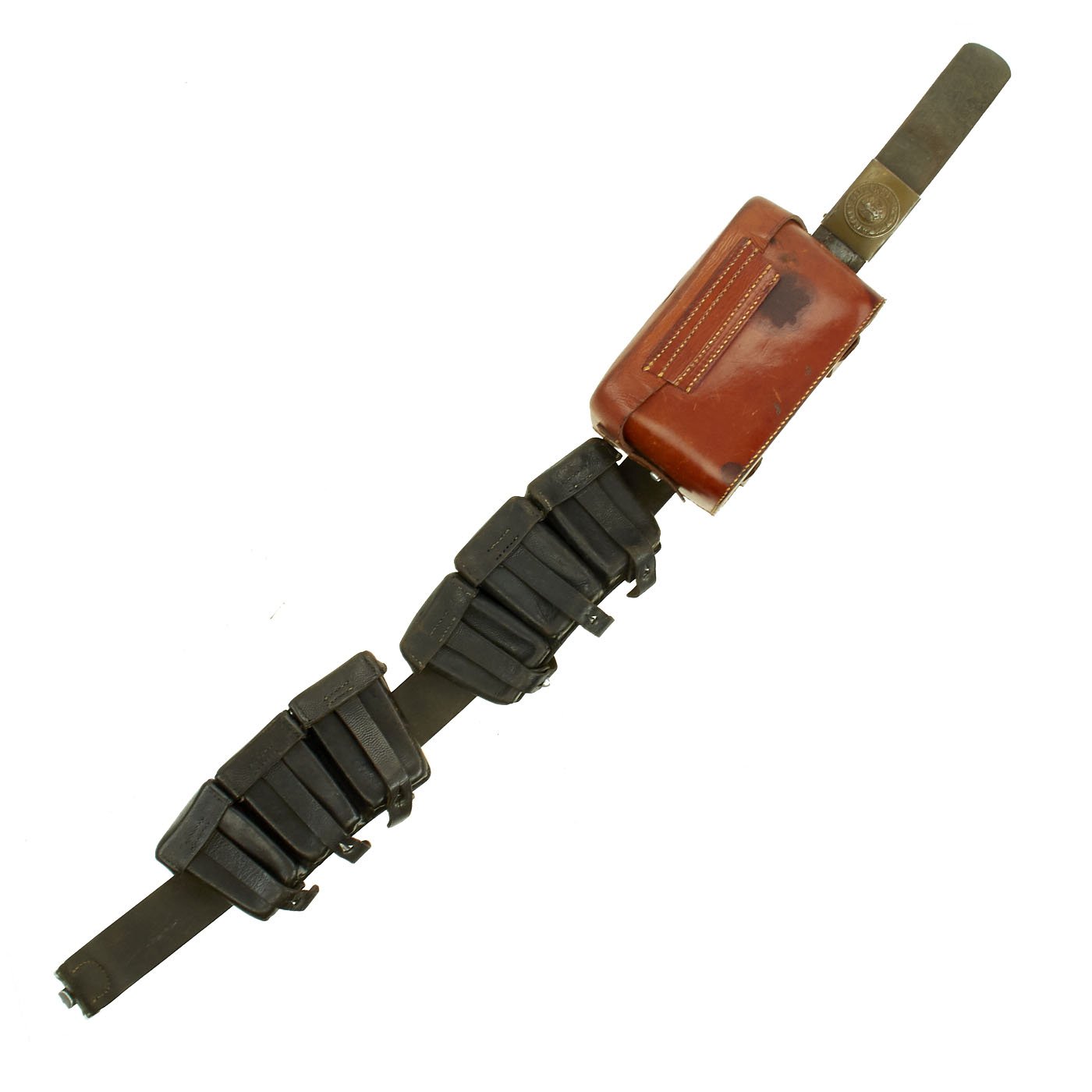 The two pebble-grain leather pouches included are in good used condition, and do not have any major leather issues, though one has some stitching pulled. The finish is somewhat worn, and they definitely show age, but they are in solid condition. Both look to originally have been brown, and then dyed black on the front. The internal separators are still present in 5 of 6 pockets, and most of the rivets and snaps are sound. Both are fitted with aluminum D-rings on the back, and aluminum rivet studs on the bottom. Both have maker markings on the back, however the pebble grain texture makes them hard to read. We can see that one is dated 1940, and the other 1942, below their maker marks.
