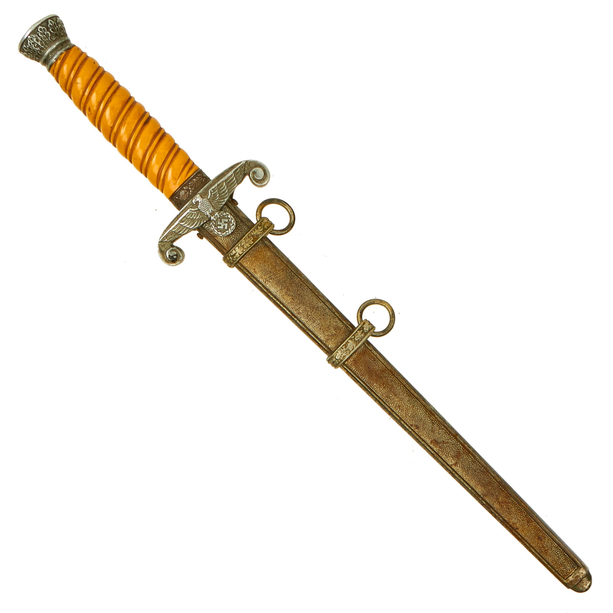 The pommel depicted oak leafing around the outer circumference. The scabbard had panels of pebble designs. Later produced examples were plated with nickel, and late war-made pieces were unplated, finished in a gray color metal. These daggers are often encountered with an aluminum portepee.