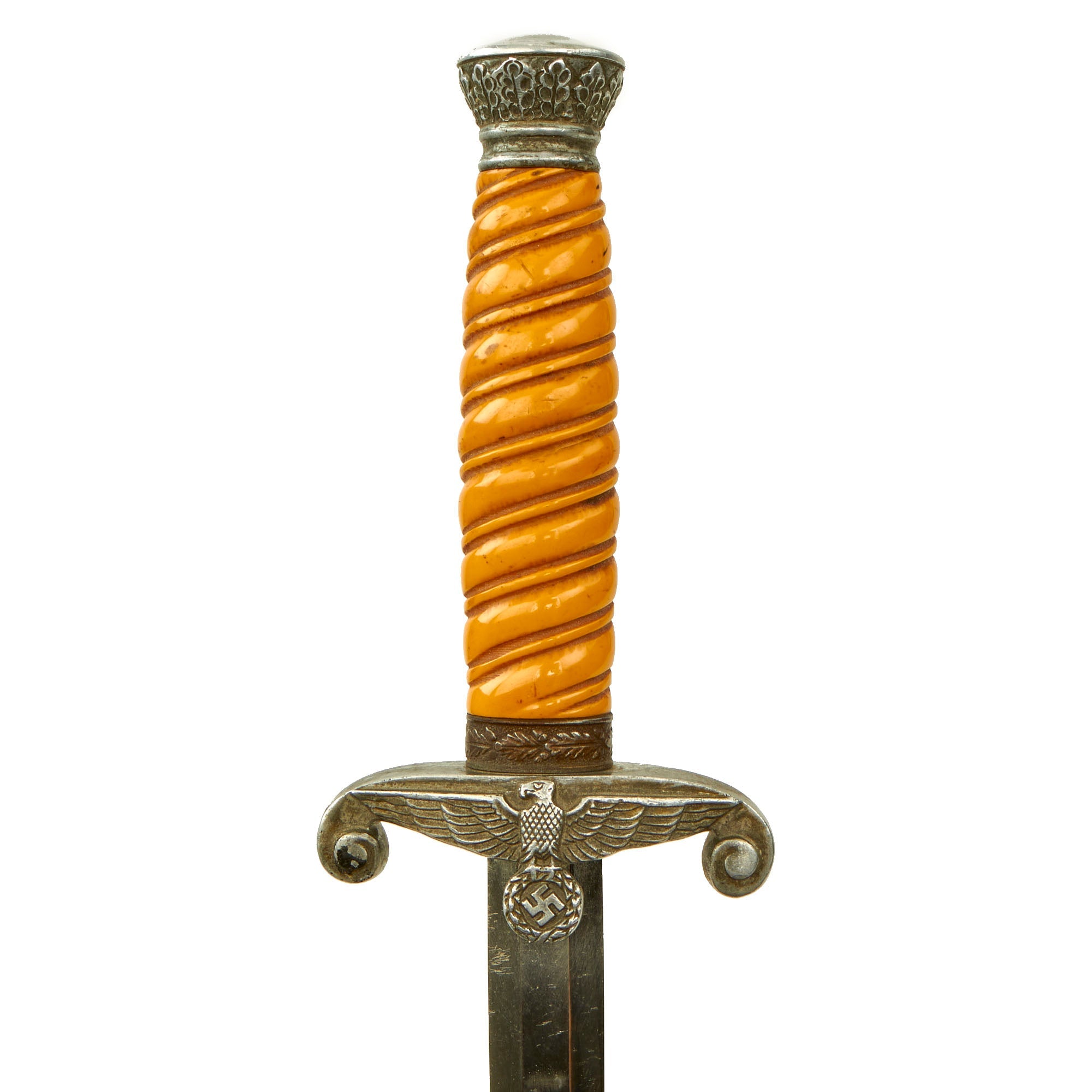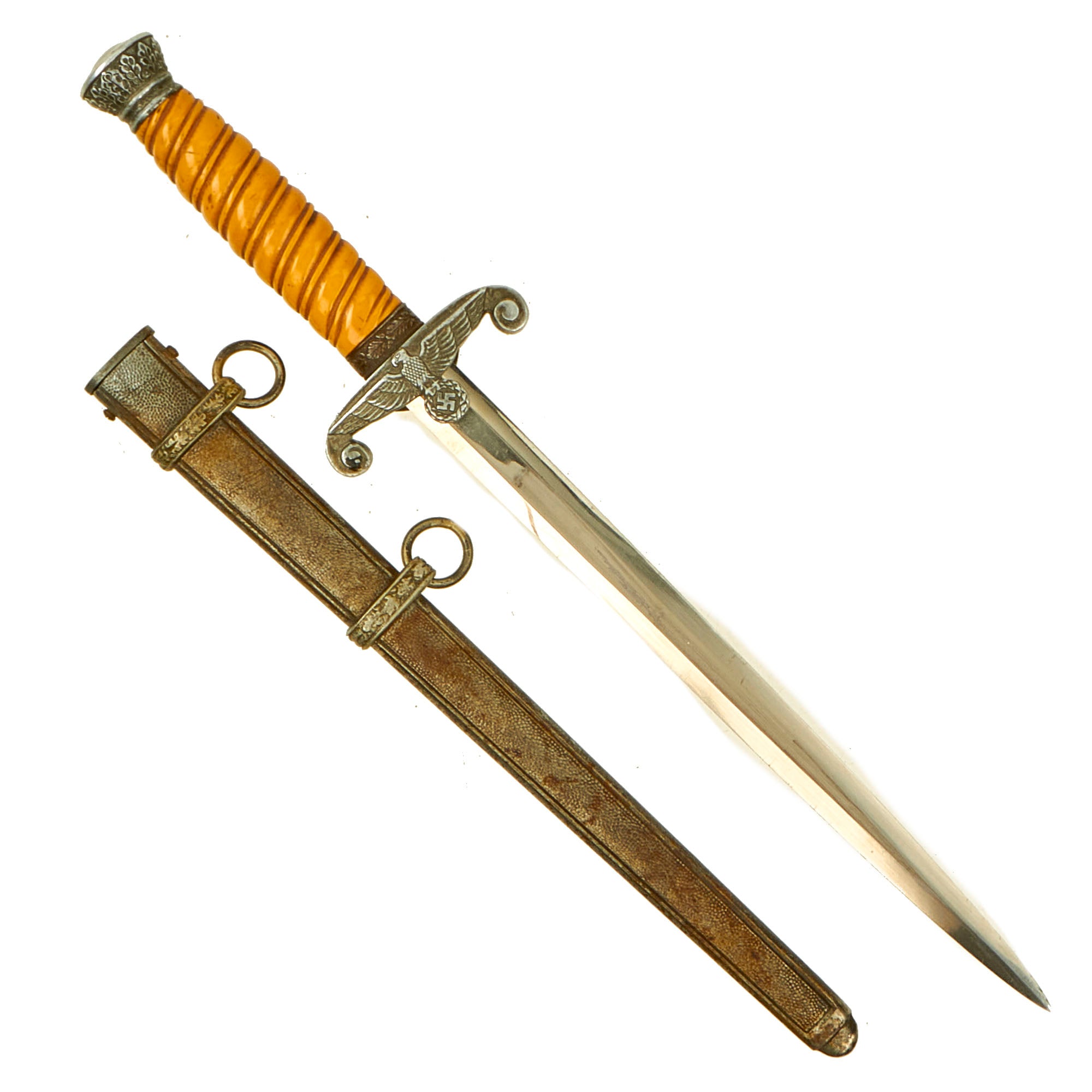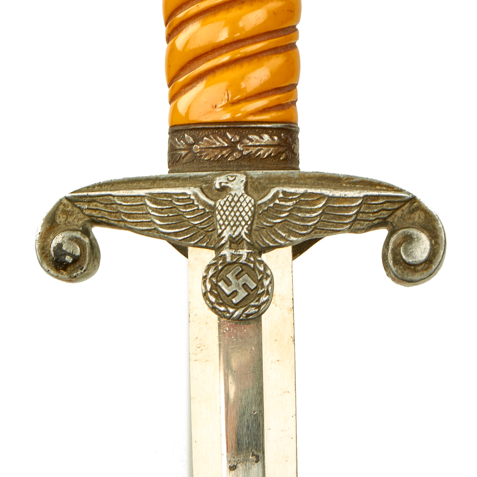 The German Army (Heer) first carried a dagger beginning in 1935. The weapon was worn in lieu of occasions not demanding the wearing of a more formal sword. The dagger design was quite attractive featuring silvered heavy fittings with white or colored grip. The crossguard depicted a Wehrmacht open-winged eagle clutching a wreathed swas.