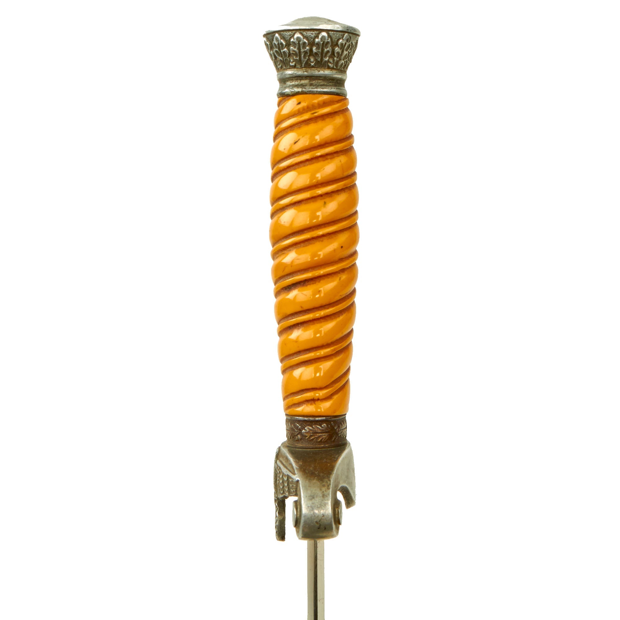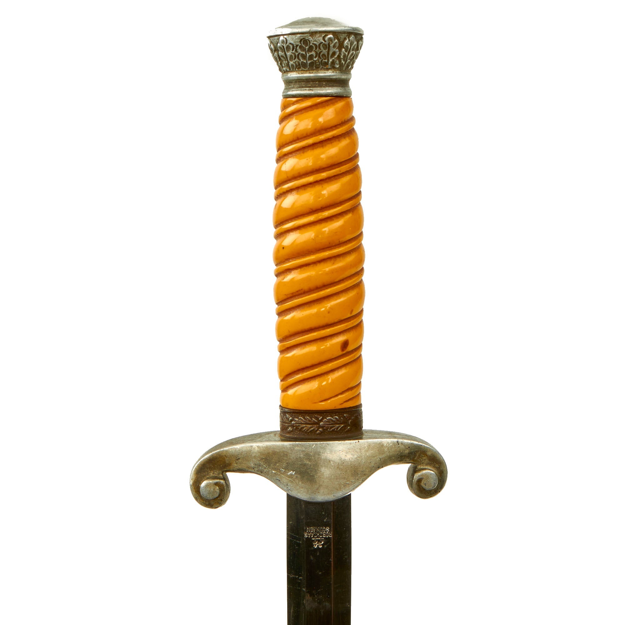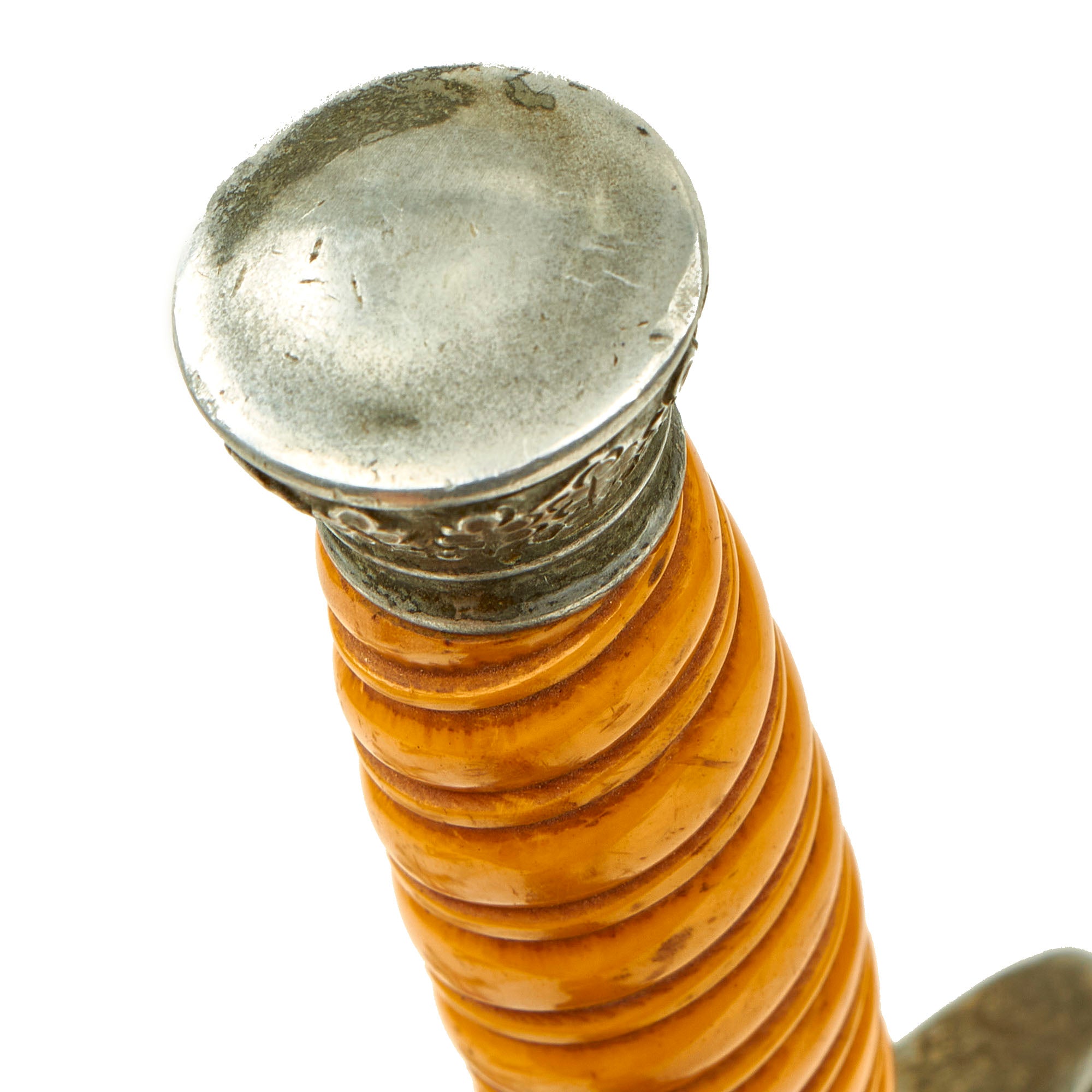 The celluloid grip on this dagger has faded just a bit from the original ivory color to a lovely amber color, with no major deterioration present. The grip is in great shape, showing just a bit of light staining and wear, with the antiquing in the grooves still present. The grip is definitely loose, even though the pommel fitting is firmly tightened, as the celluloid shrinks over time. The leather blade buffer is still present in the recesses of the cross guard.