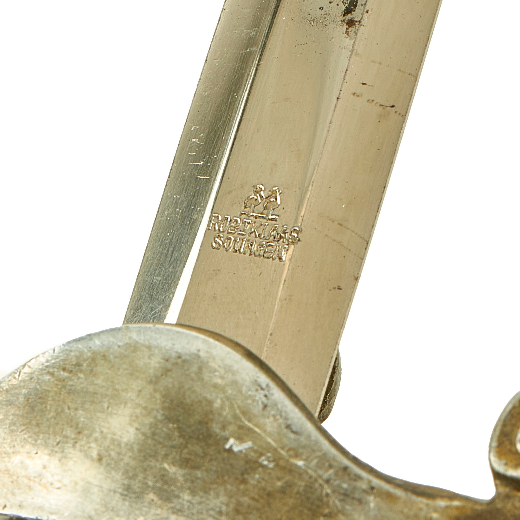 The reverse ricasso is maker marked with a trademark logo that reads ROB'T KLAAS / SOLINGEN under the trademark Klaas "Kissing Storks" trademark emblem. This is a well-known maker from Solingen, the famous "City of Blades" in Western Germany, which produced many fine edged weapons. The company was originally founded by Friedrich Robert Klaas, who married the daughter of knife maker Peter Daniel Pauls. After his father-in-law passed away, all was left to Klaas and his wife, so he merged his scissor business with the knife business, and registered with Solingen authorities in 1869. The company passed to his sons, and then his son-in-law. It survived WWI, WWII, and still exists today, per J. Anthony Carter's fine work GERMAN SWORD AND KNIFE MAKERS.