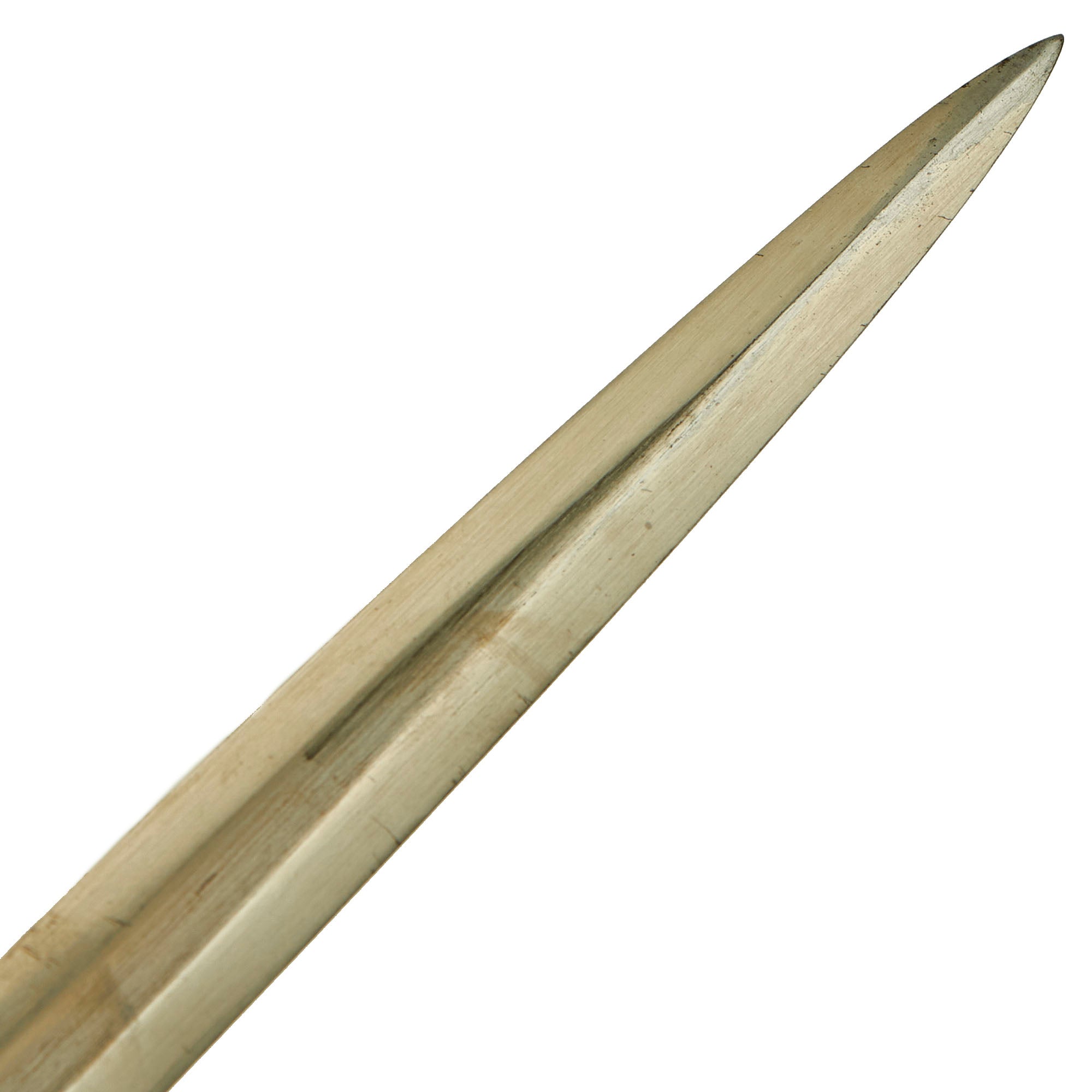 The rare nickel-plated blade is in very good condition, showing some minor plating loss on the blade flats due to runner wear. Everywhere else the plating is well preserved, with minimal oxidation. The needle-like tip is intact and unbent, and the edges have correctly not been sharpened. Definitely a very nice example!