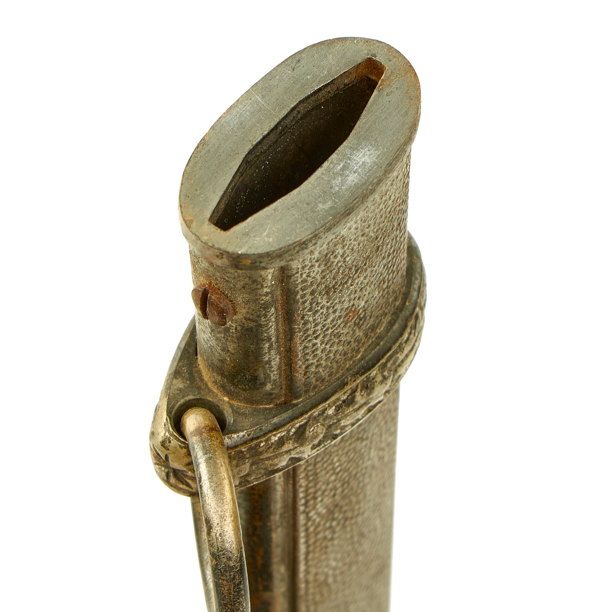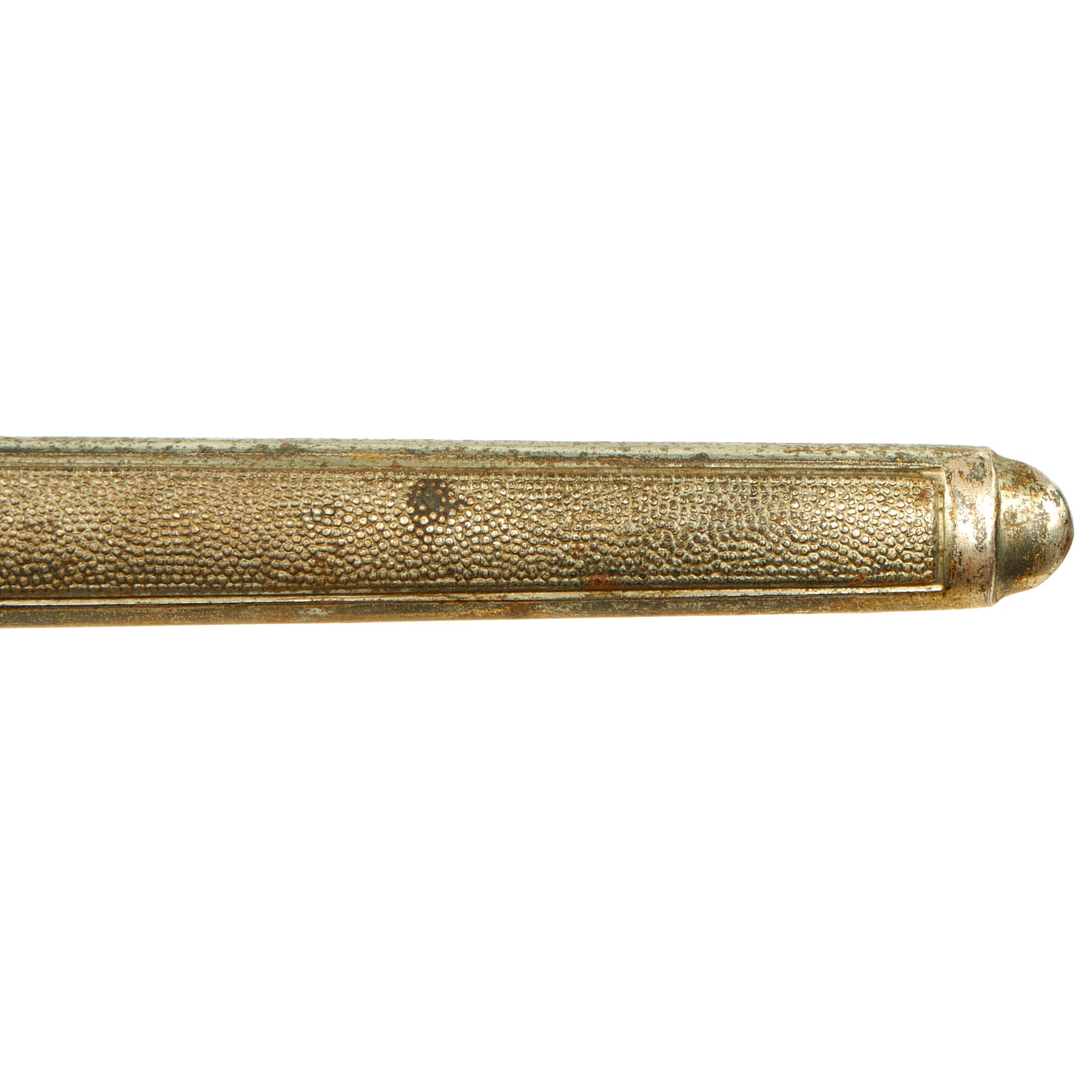 The scabbard is a fine example, and is nickel plated steel. This straight scabbard has very crisp, finely grained panels. The carrying bands have an excellent pattern of overlapping oak leaves and acorns, which are nicely enhanced, though they do show wear removing some of the design. The throat is the thinner style, retained by "cheese head" screws on the thinner sides of the scabbard. The scabbard has a lovely patinated look, with some oxidation where the plating is missing.
