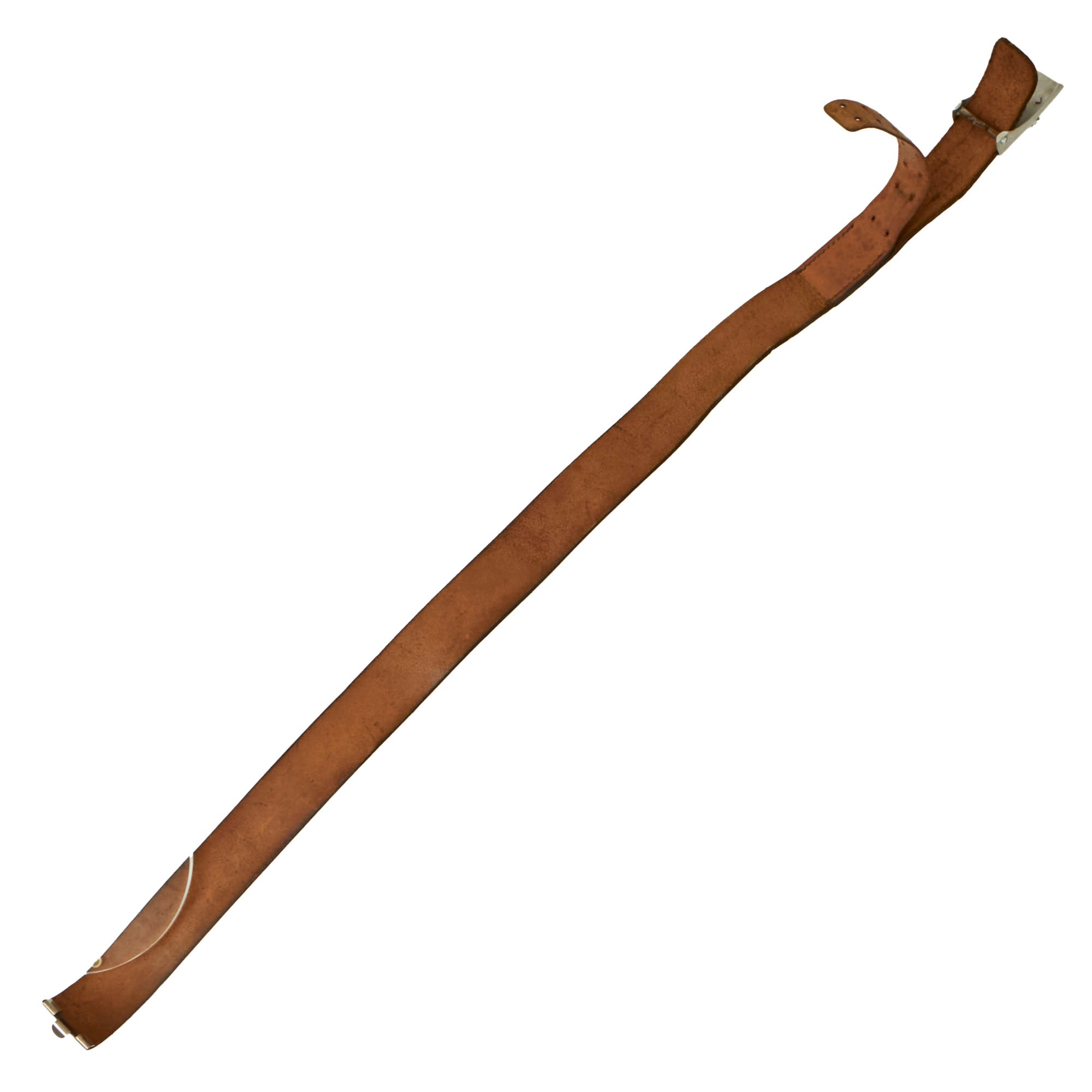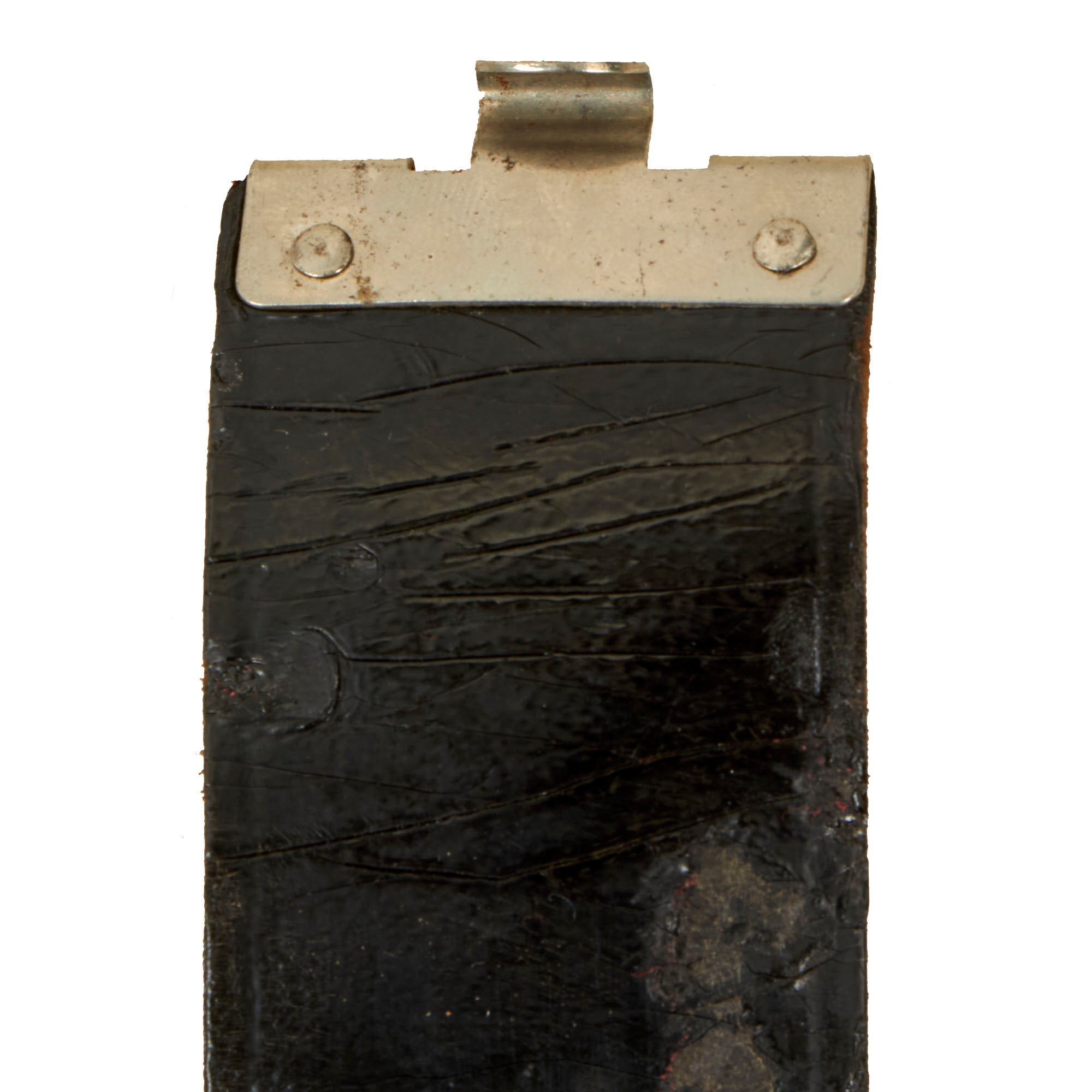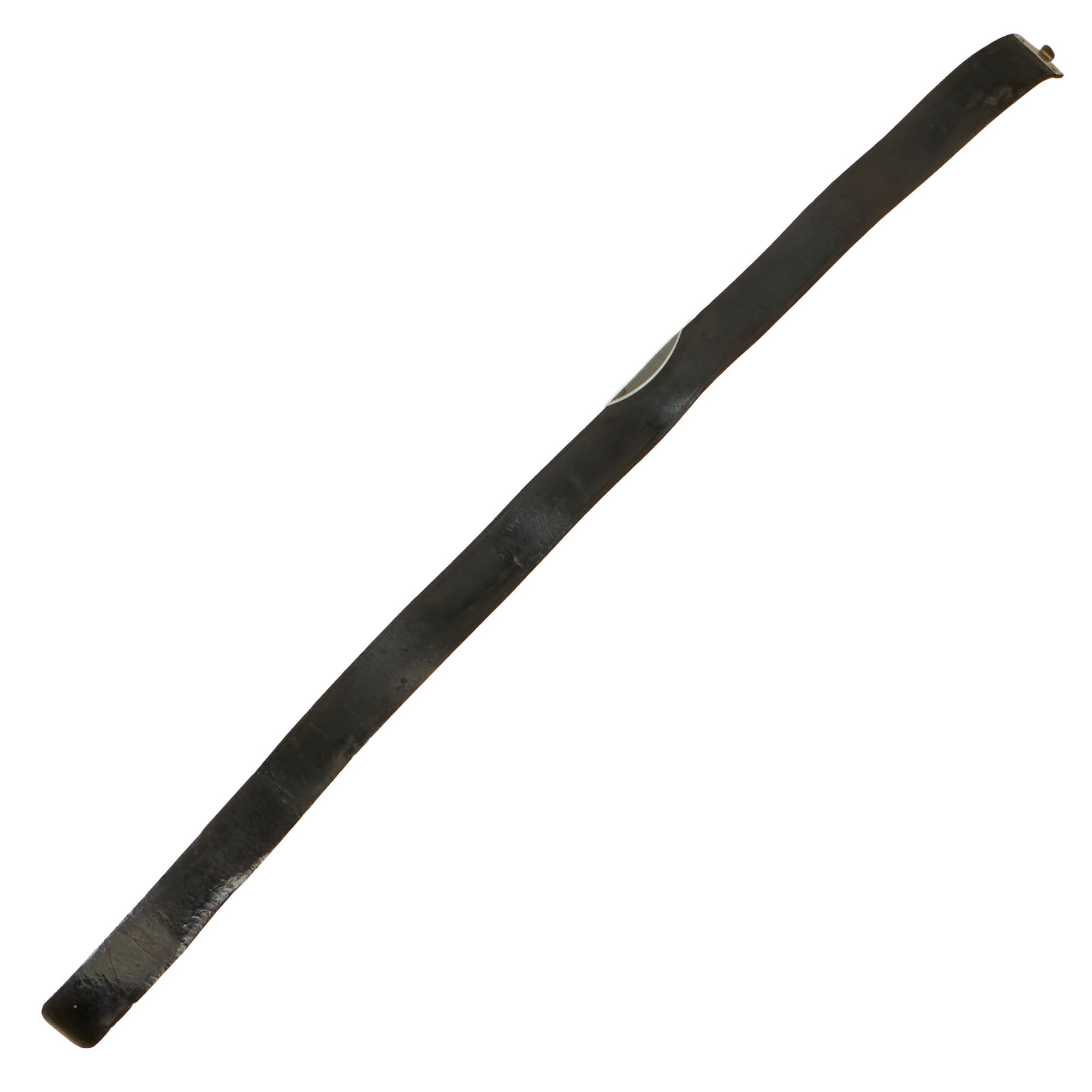 The leather belt is in very good condition, and measures about 37.5” when fully extended. It has a lovely gloss black finish on the leather, and still retains the adjustment tab with double rows of 8 holes. This has had an additional set of holes added near the attachment point, and it is attached using hidden stitches. The securing hook on the end is plated steel. Condition is very good, but the belt is definitely stiff. The gloss black finish shows age related degradation including cracks, wrinkles, and other issues, but there are no tears in the leather.