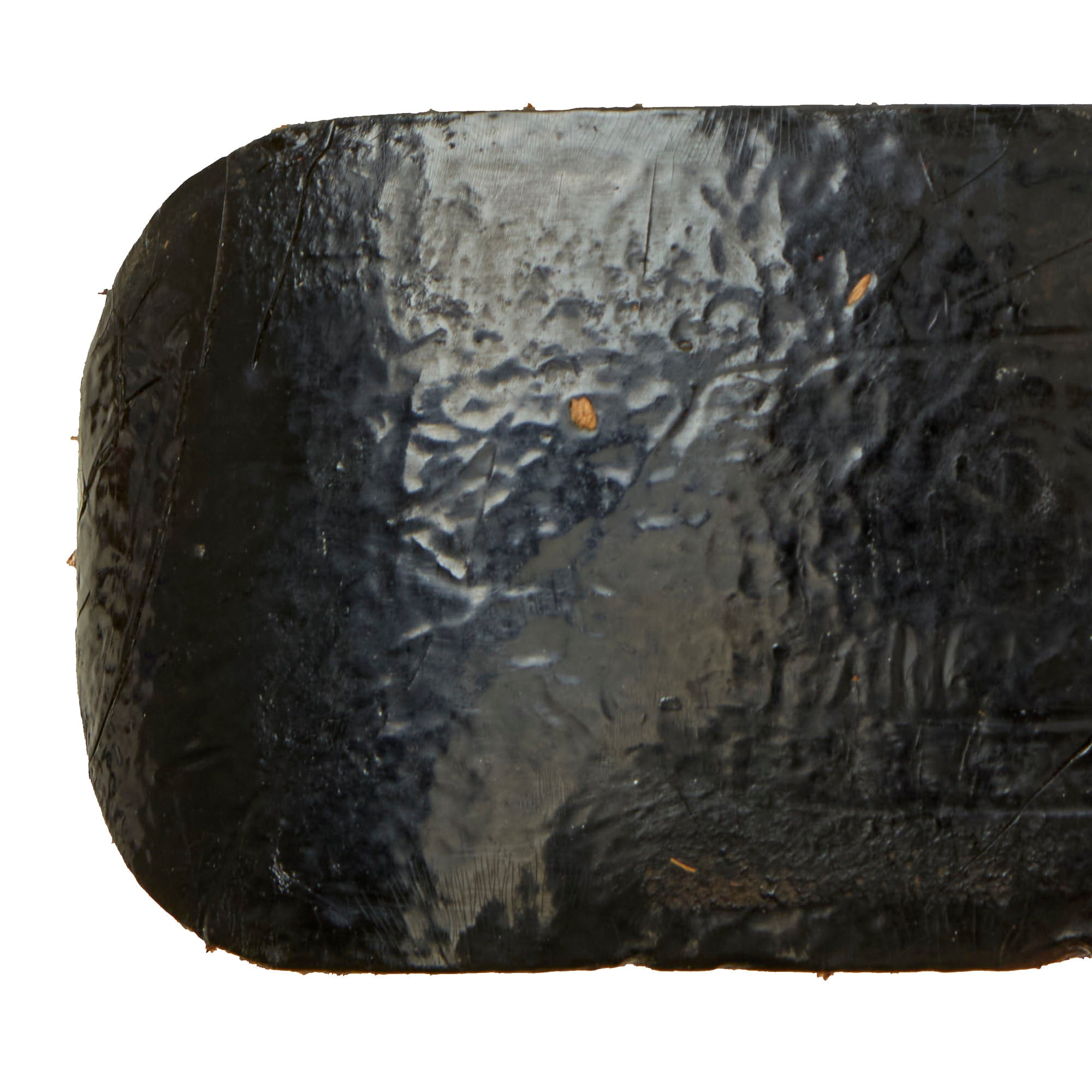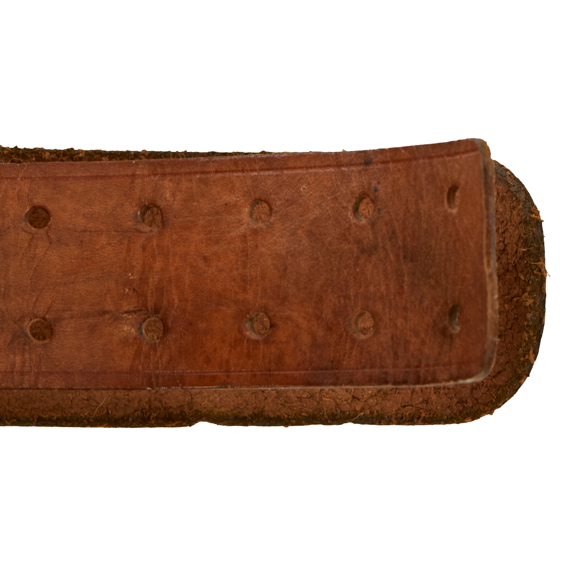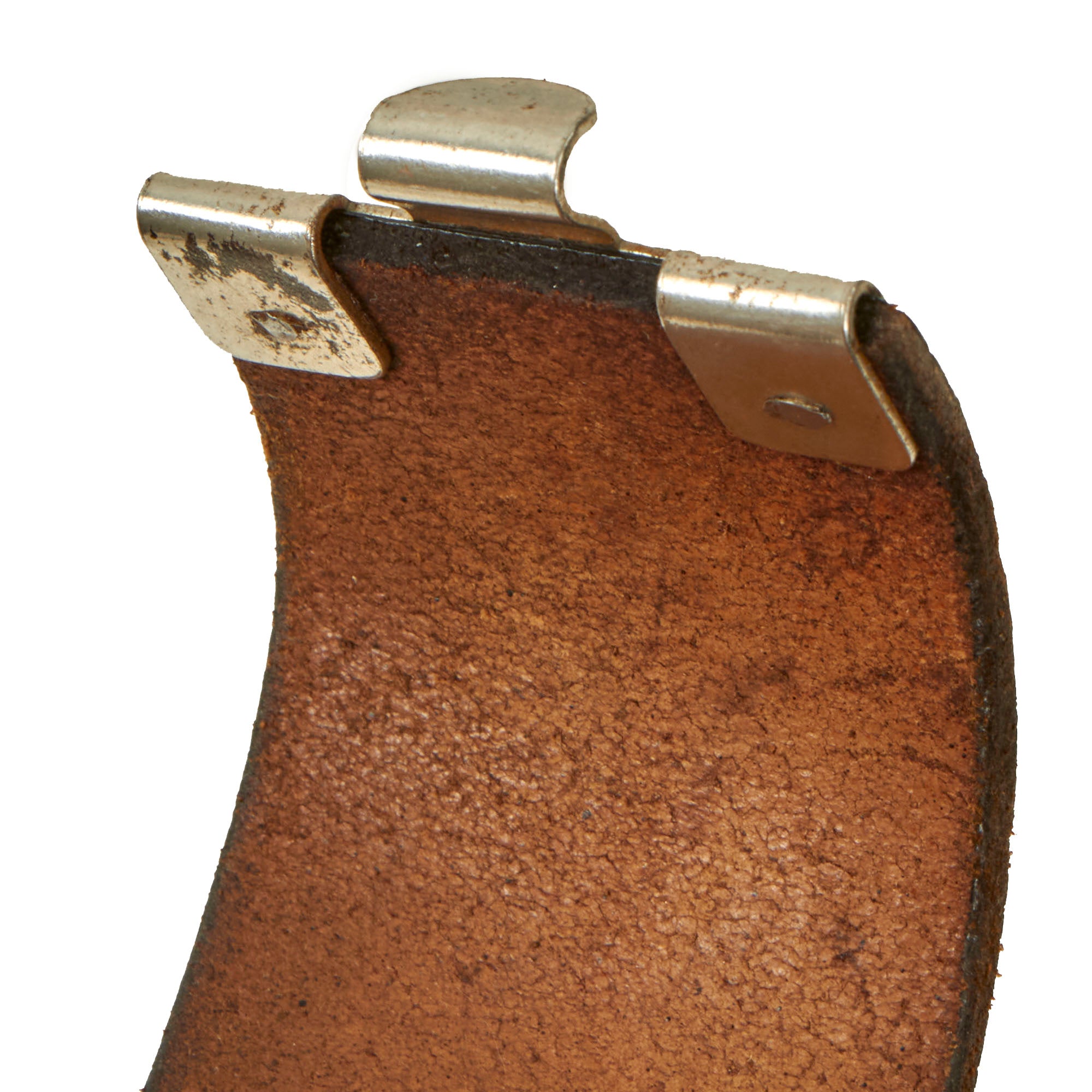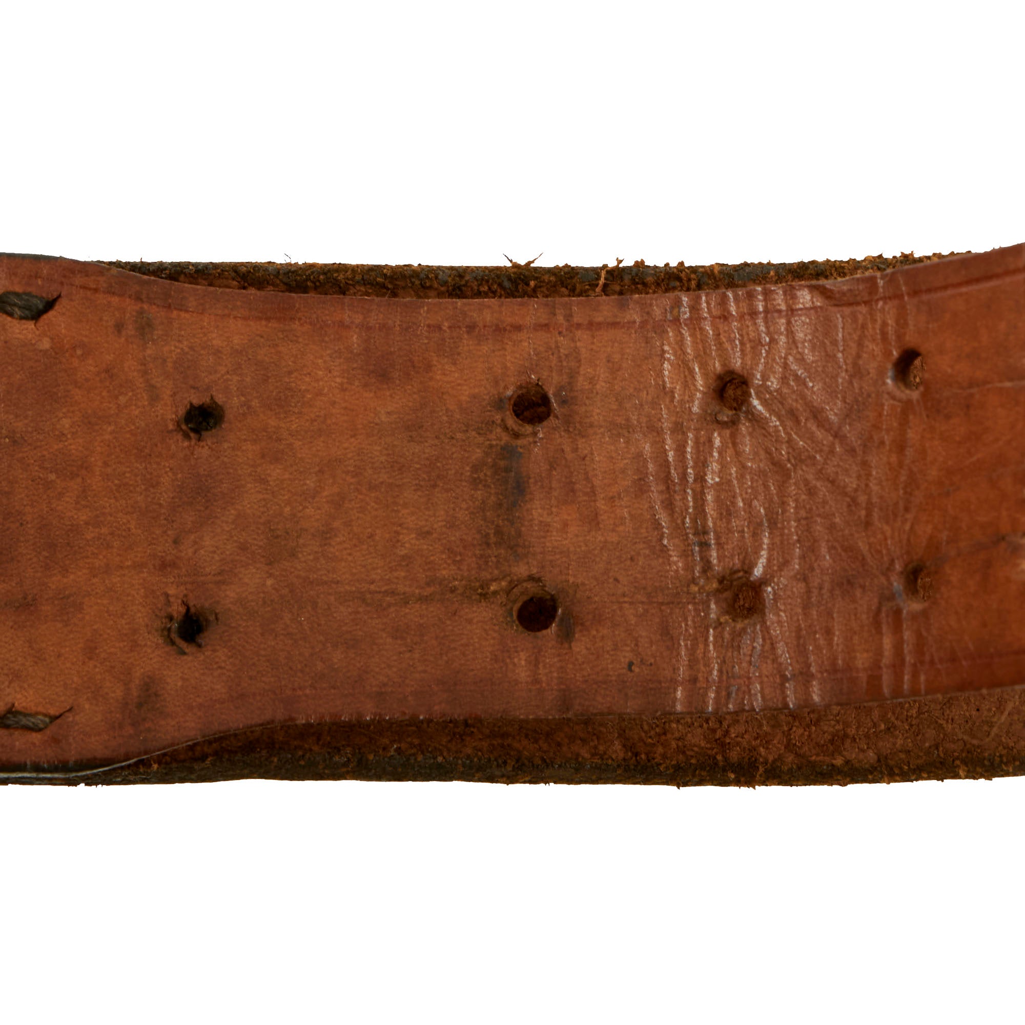 The leather belt is in very good condition, and measures about 37.5” when fully extended. It has a lovely gloss black finish on the leather, and still retains the adjustment tab with double rows of 8 holes. This has had an additional set of holes added near the attachment point, and it is attached using hidden stitches. The securing hook on the end is plated steel. Condition is very good, but the belt is definitely stiff. The gloss black finish shows age related degradation including cracks, wrinkles, and other issues, but there are no tears in the leather.