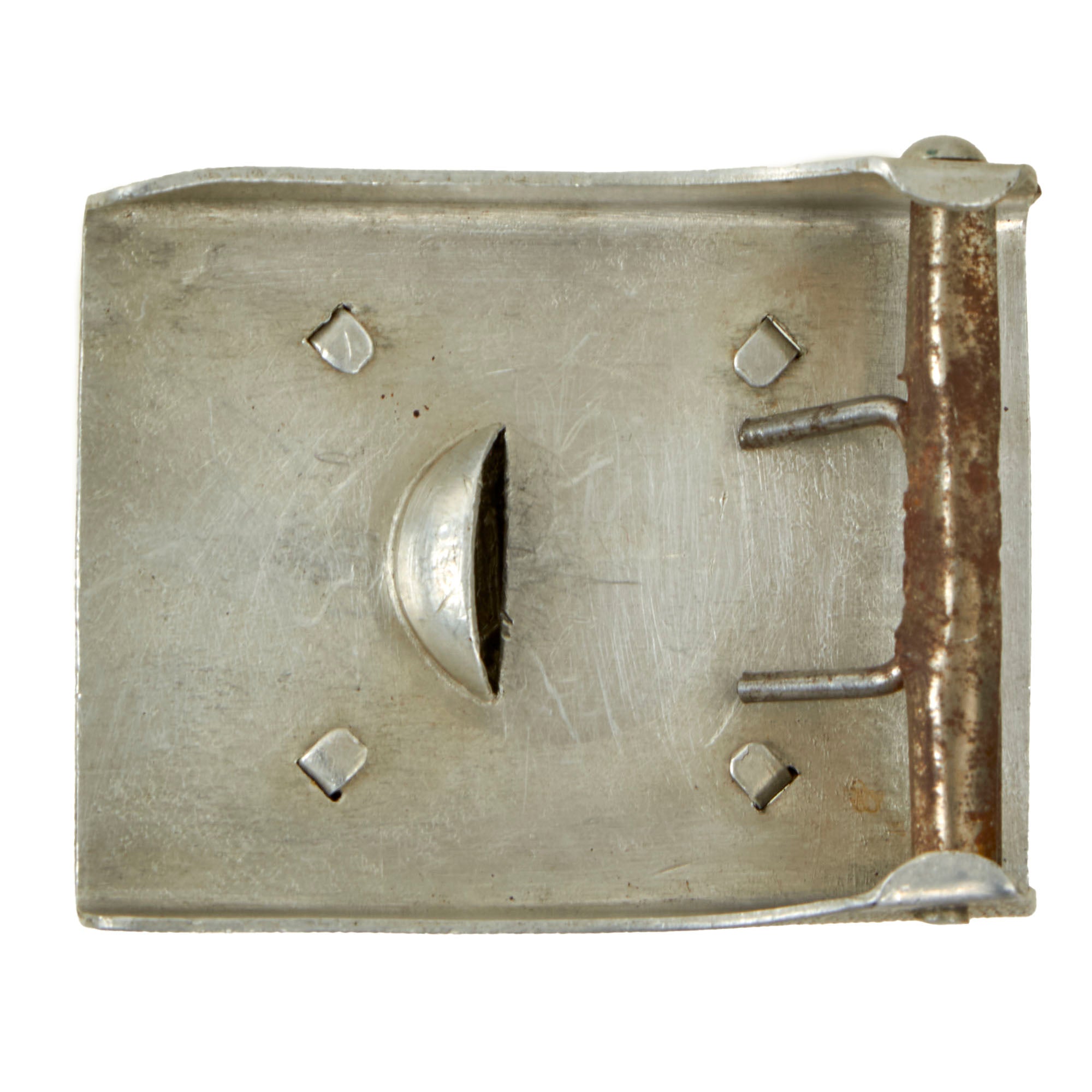 Original Item: Only One Available. This is a very nice WWII German Wehrmacht (Heer) Aluminum EM/NCO's Belt Buckle (Koppelschloß) with an original black finished leather belt. The buckle is embossed with the Heer motto GOTT MIT UNS ("God (is) with us") around the Wehrmacht Reichsadler (State Eagle). Nice aluminum construction box buckle with a pebbled background. The buckle is in good condition, and is a two piece crimped example with an attached front insignia. The buckle is unfinished aluminum, not painted at any time, indicating that it was for parade use. It does show some surface wear, common due to the softer aluminum alloy, and there also is a small bend on one corner.