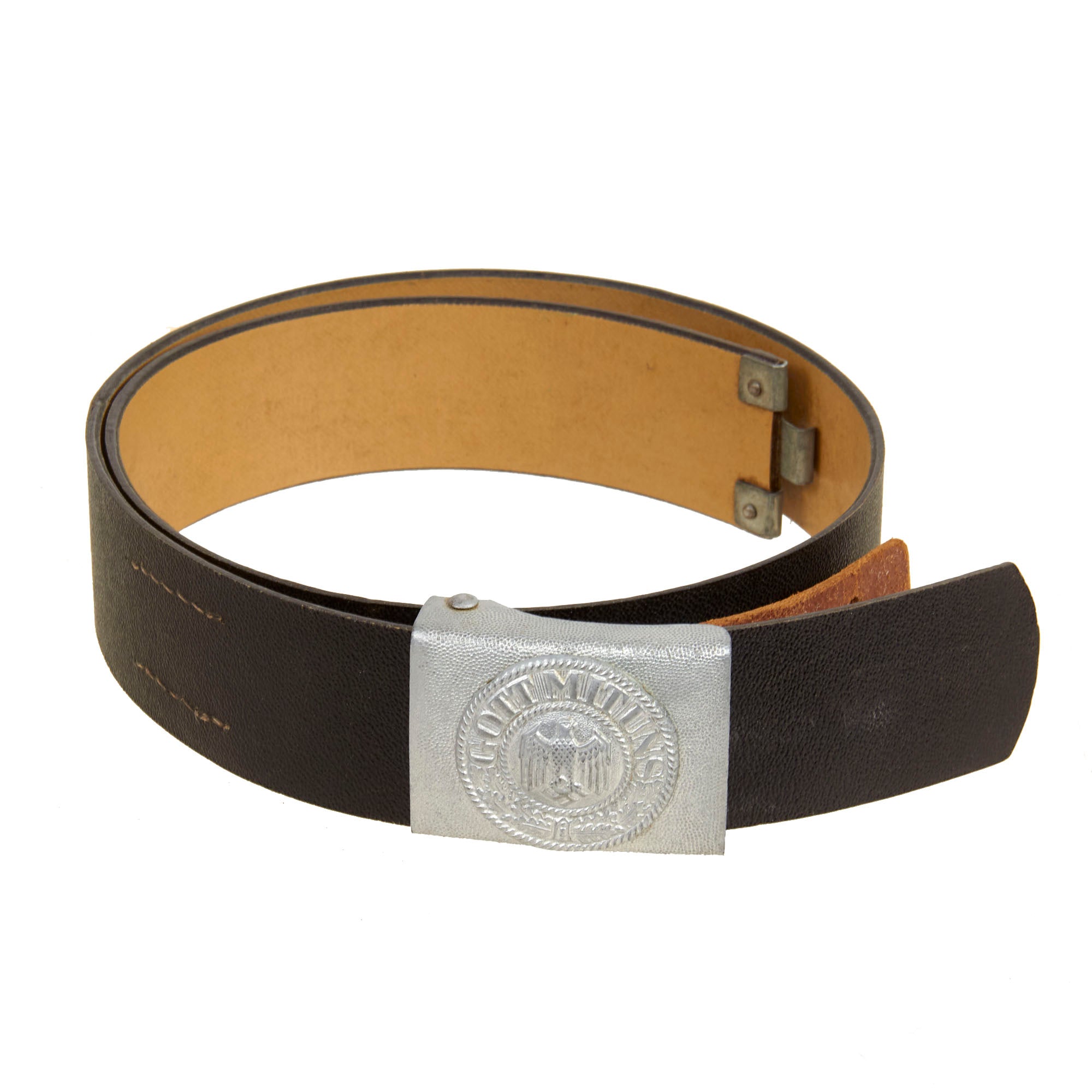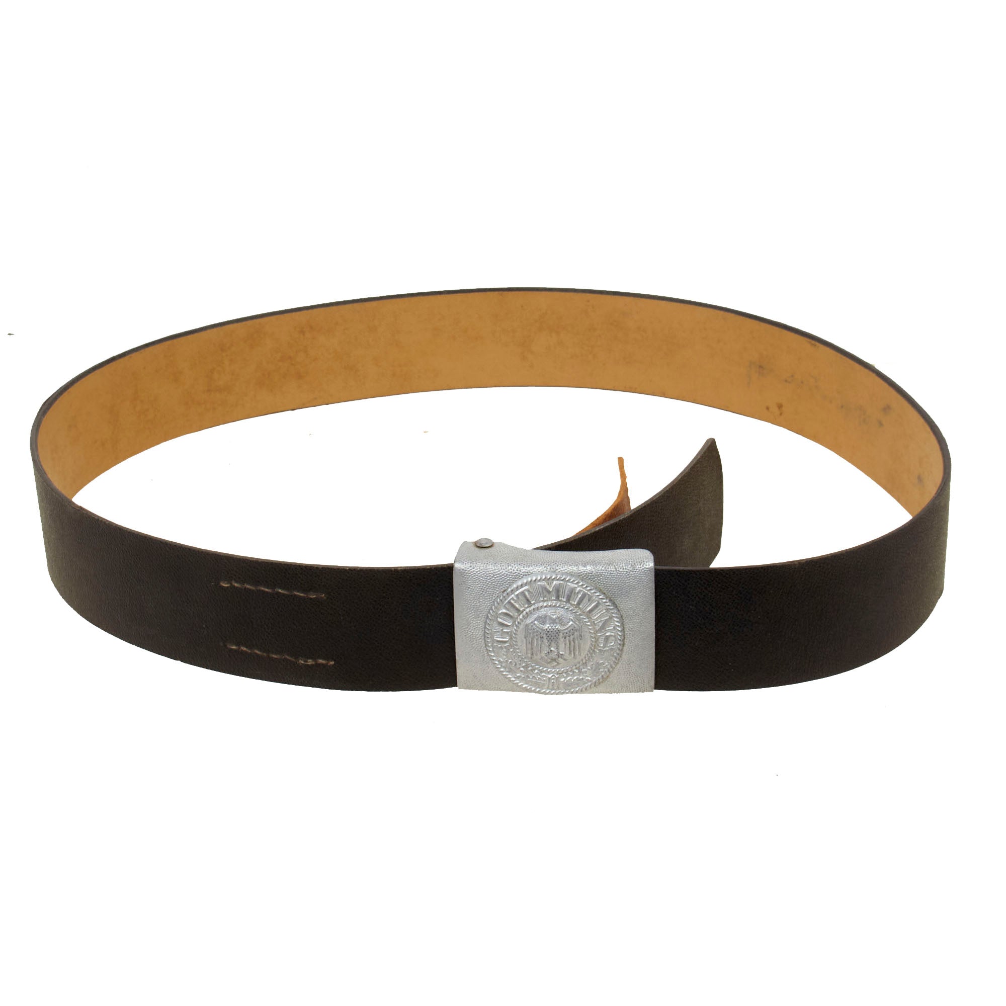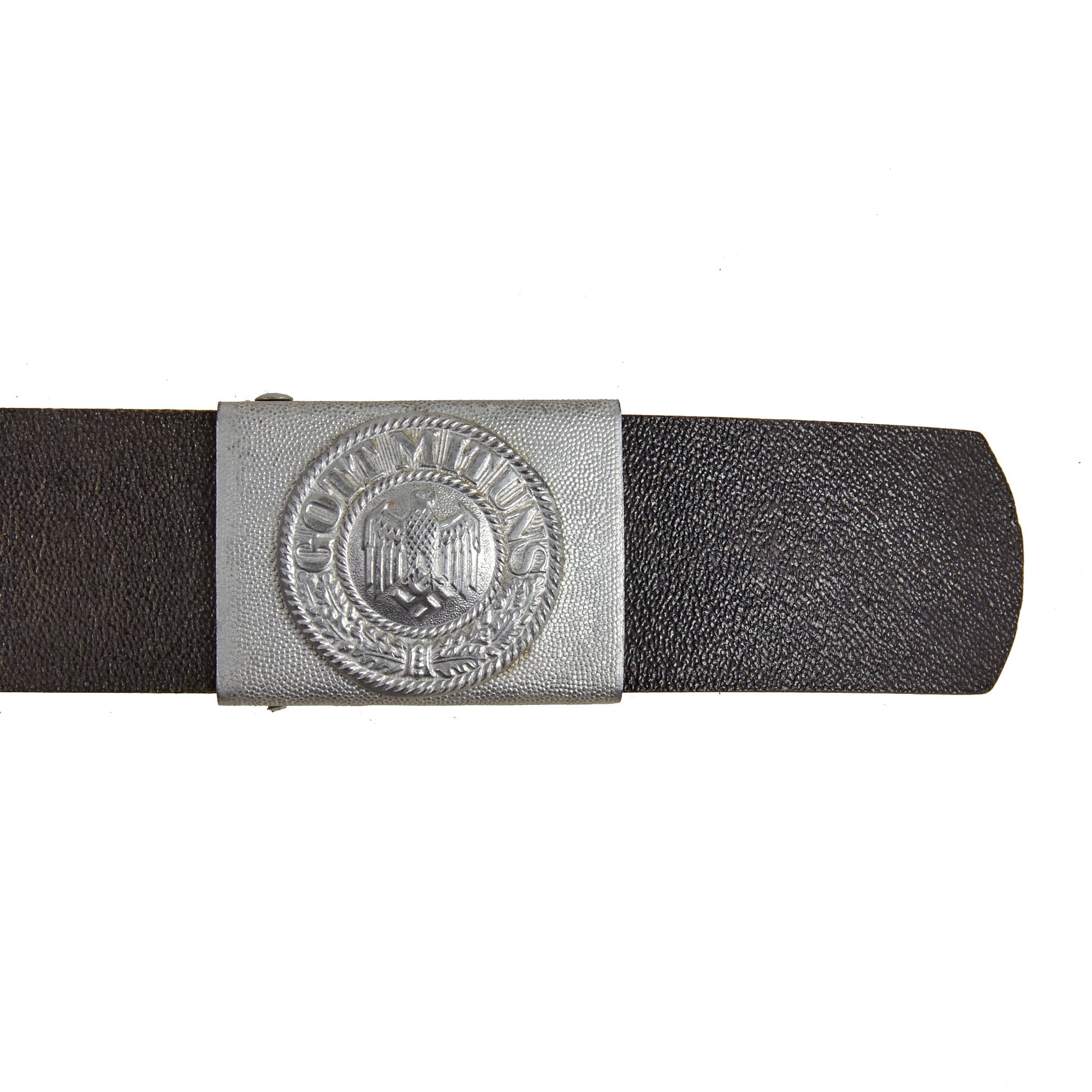 Original Item: Only One Available. This is an excellent condition late WWII German Wehrmacht (Heer) Aluminum EM/NCO's Dress Belt Buckle (Koppelschloß) with an original black finished Preßstoff faux leather belt. The buckle is embossed with the Heer motto GOTT MIT UNS ("God (is) with us") around the Wehrmacht Wehrmachtsadler (Armed Forces Eagle). Nice aluminum construction box buckle with a pebbled background. The buckle is in excellent condition, and is a two piece example, with a stamped and crimped body and attached Heer insignia. It shows little to no wear, and has a lovely silvered finish on the exterior for dress use. There is no maker marking on the buckle itself which is without a leather tab.