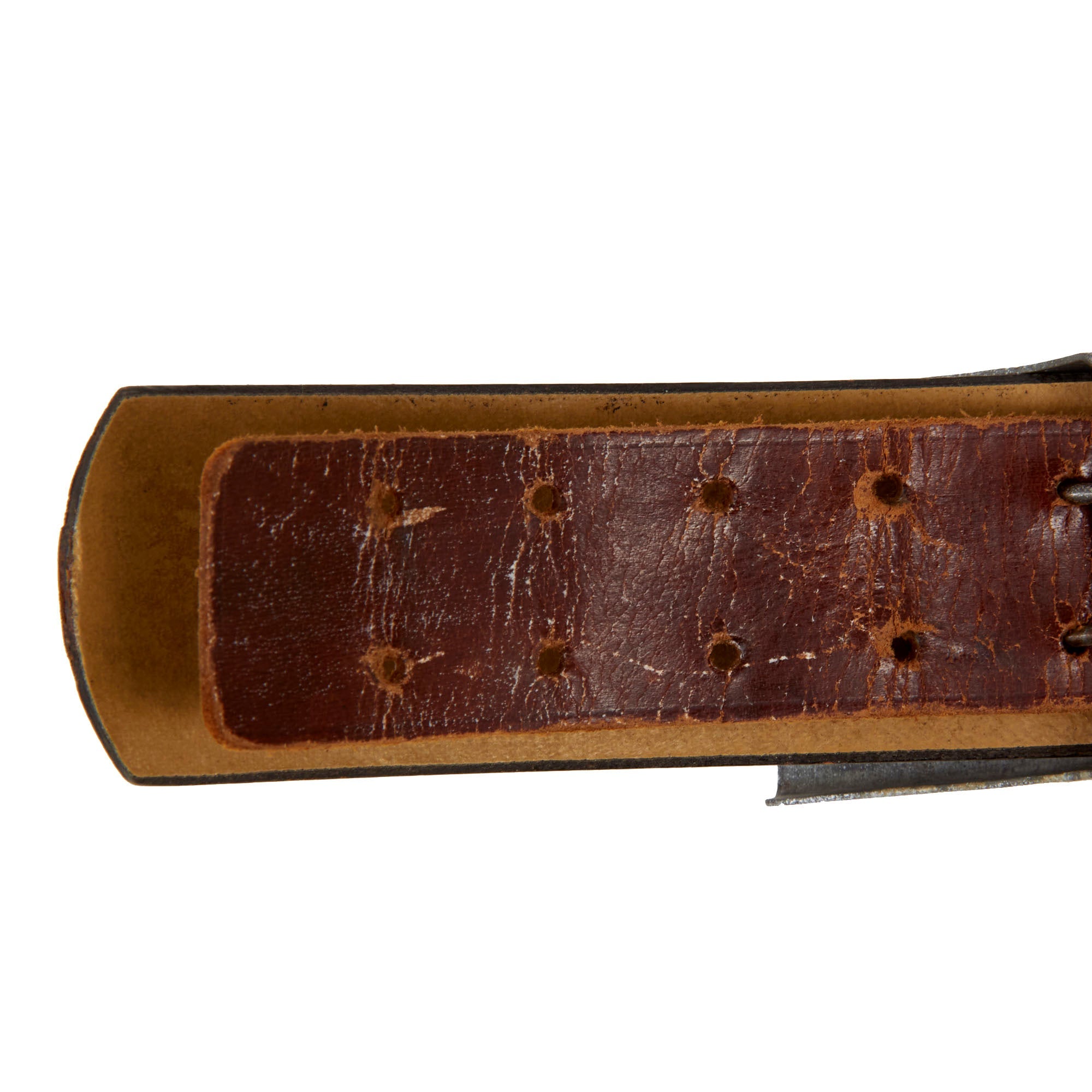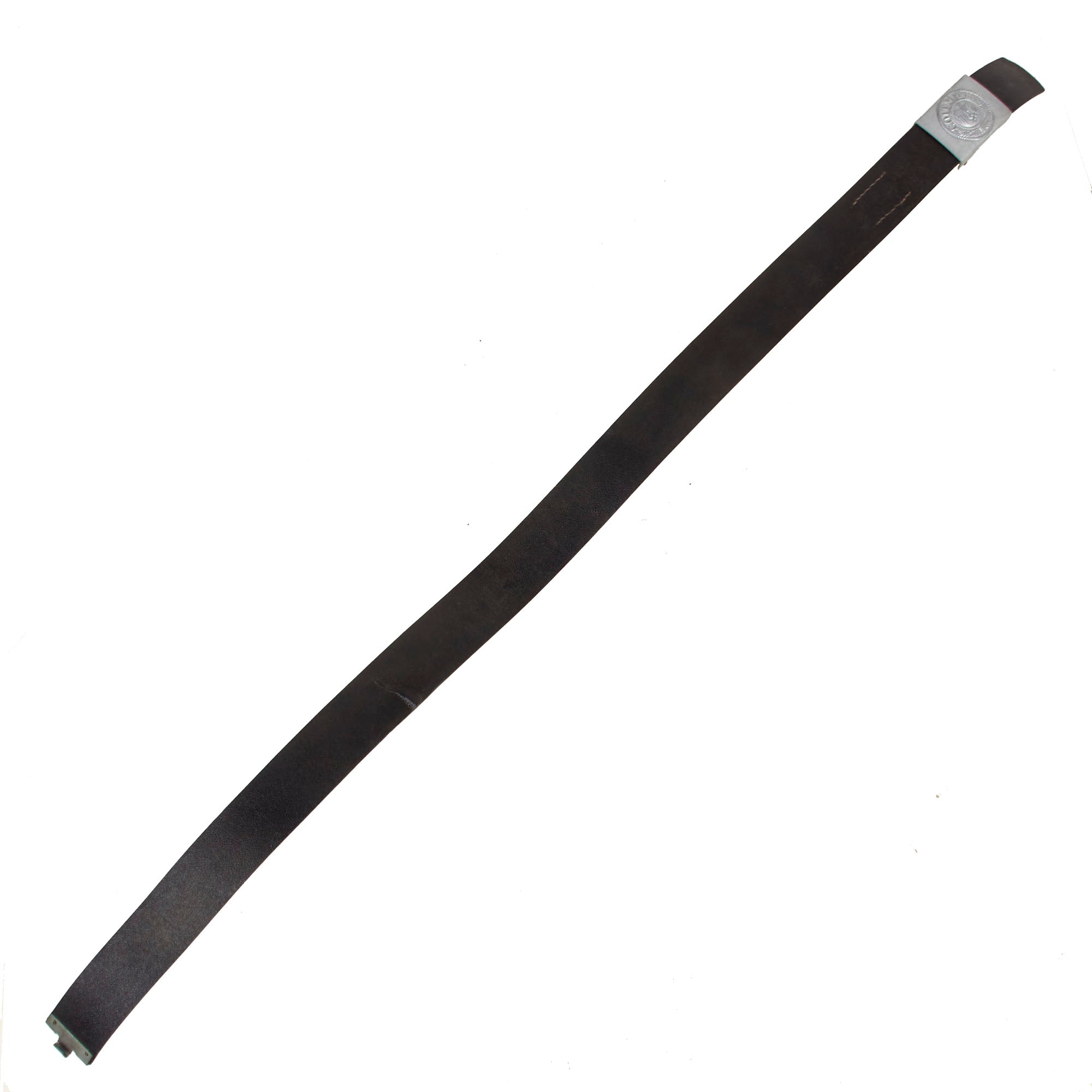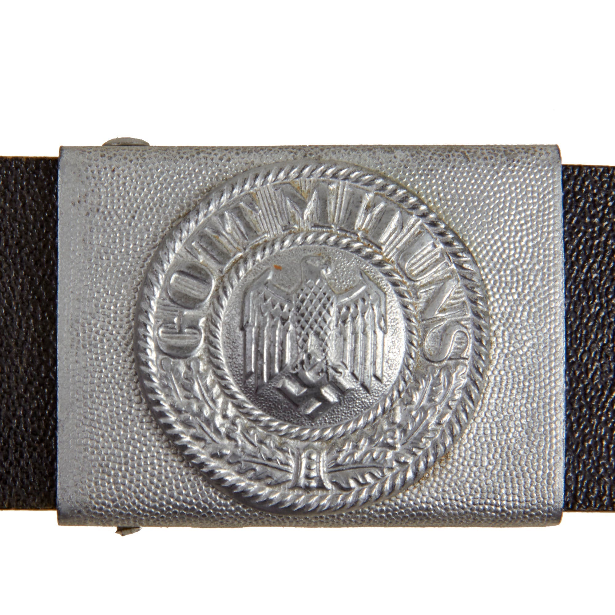 Original Item: Only One Available. This is an excellent condition late WWII German Wehrmacht (Heer) Aluminum EM/NCO's Dress Belt Buckle (Koppelschloß) with an original black finished Preßstoff faux leather belt. The buckle is embossed with the Heer motto GOTT MIT UNS ("God (is) with us") around the Wehrmacht Wehrmachtsadler (Armed Forces Eagle). Nice aluminum construction box buckle with a pebbled background. The buckle is in excellent condition, and is a two piece example, with a stamped and crimped body and attached Heer insignia. It shows little to no wear, and has a lovely silvered finish on the exterior for dress use. There is no maker marking on the buckle itself which is without a leather tab.