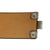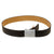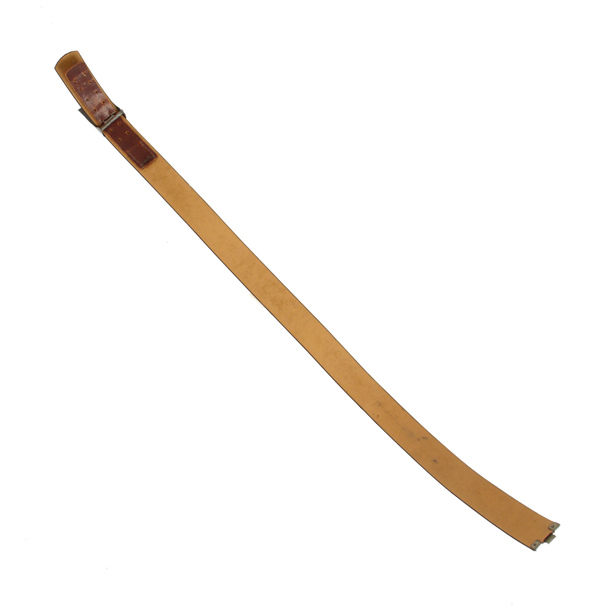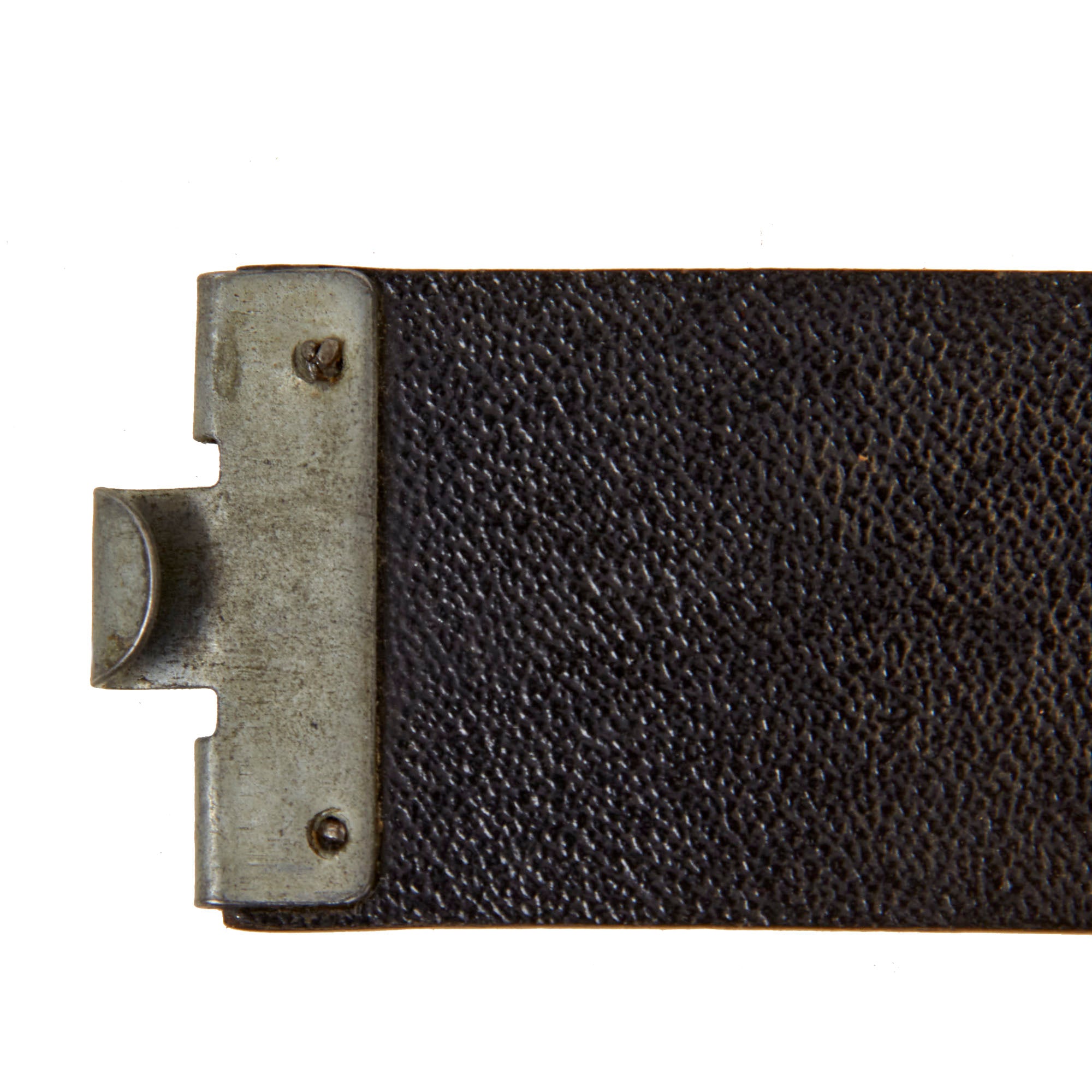 The Preßstoff faux leather belt is in excellent condition, with a lovely black pebble grain finish on the exterior, and a beige color on the interior. It retains the leather size adjustment tab with a double row of 7 holes, which does show some finish degradation. The belt itself measures about 42 inches in overall length, and shows just a few edge dents and minor delamination. It is definitely quite stiff, and we do not recommend trying to straighten out, as it may damage the material.