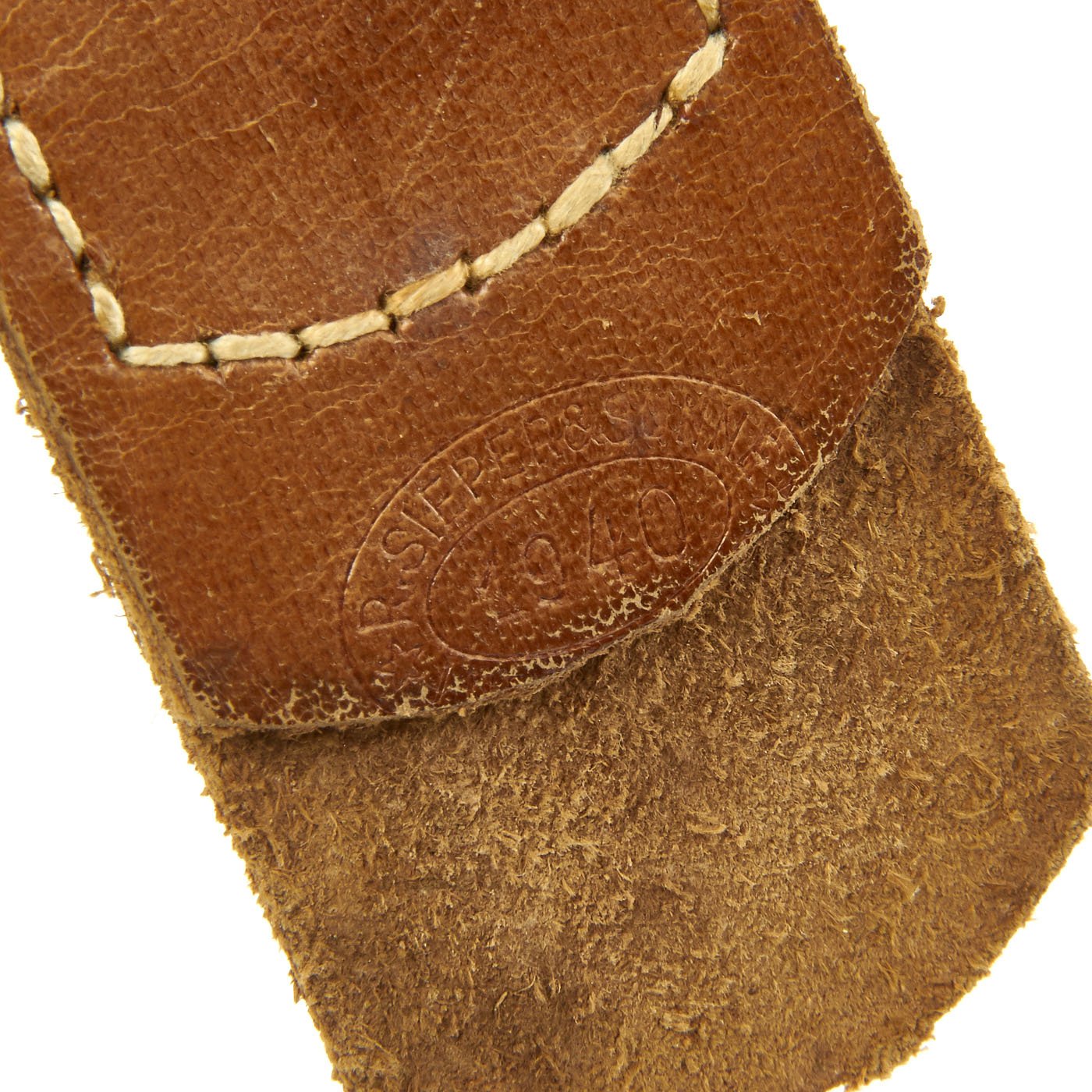 The back of the buckle is nicely stamped with maker mark R. S. & S., for R. Sieper & Sohne of Lüdenscheid, Germany, a city with a very large garment accessories industry. The buckle also still retains its original leather pull tab, which has a clear maker marking, although the bottom with the city is cut off: