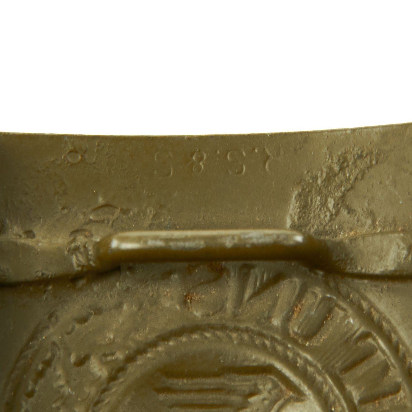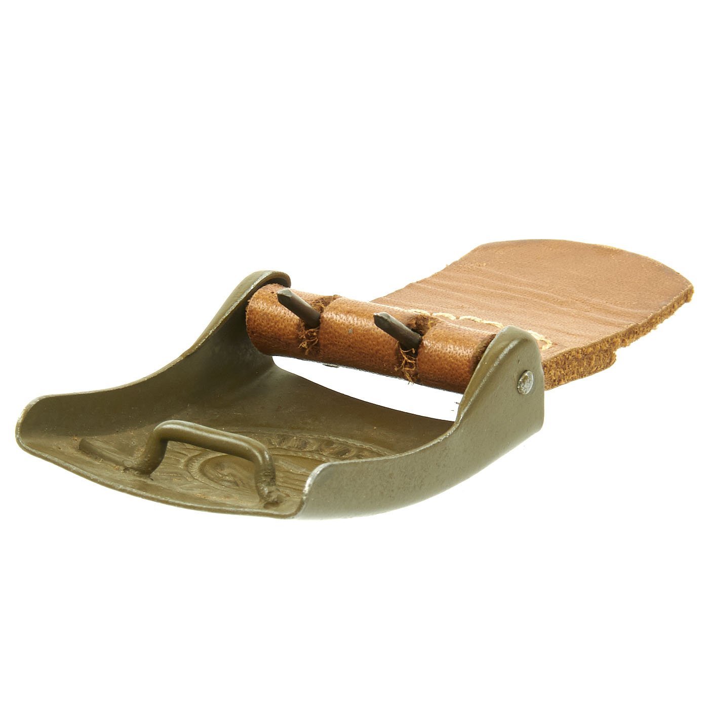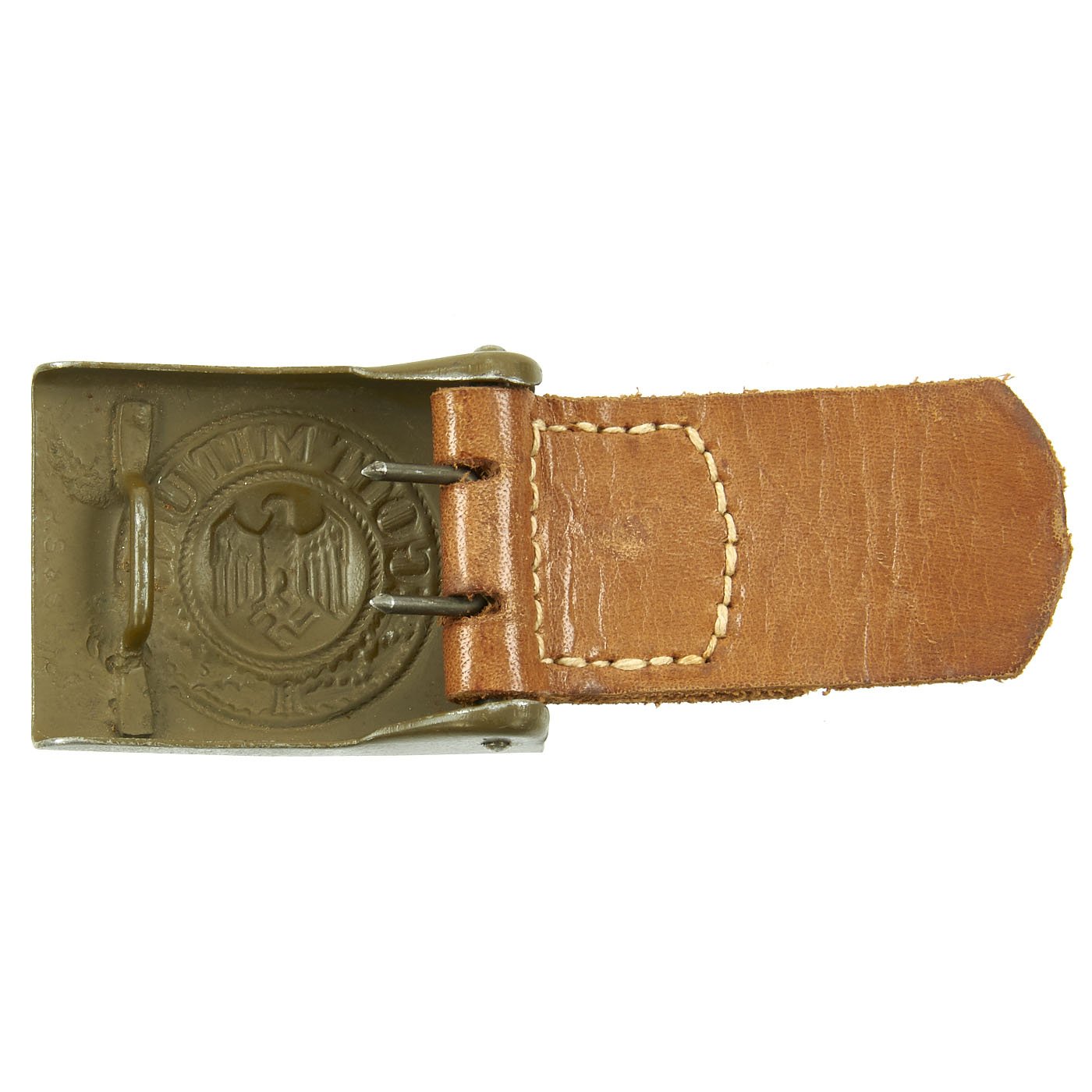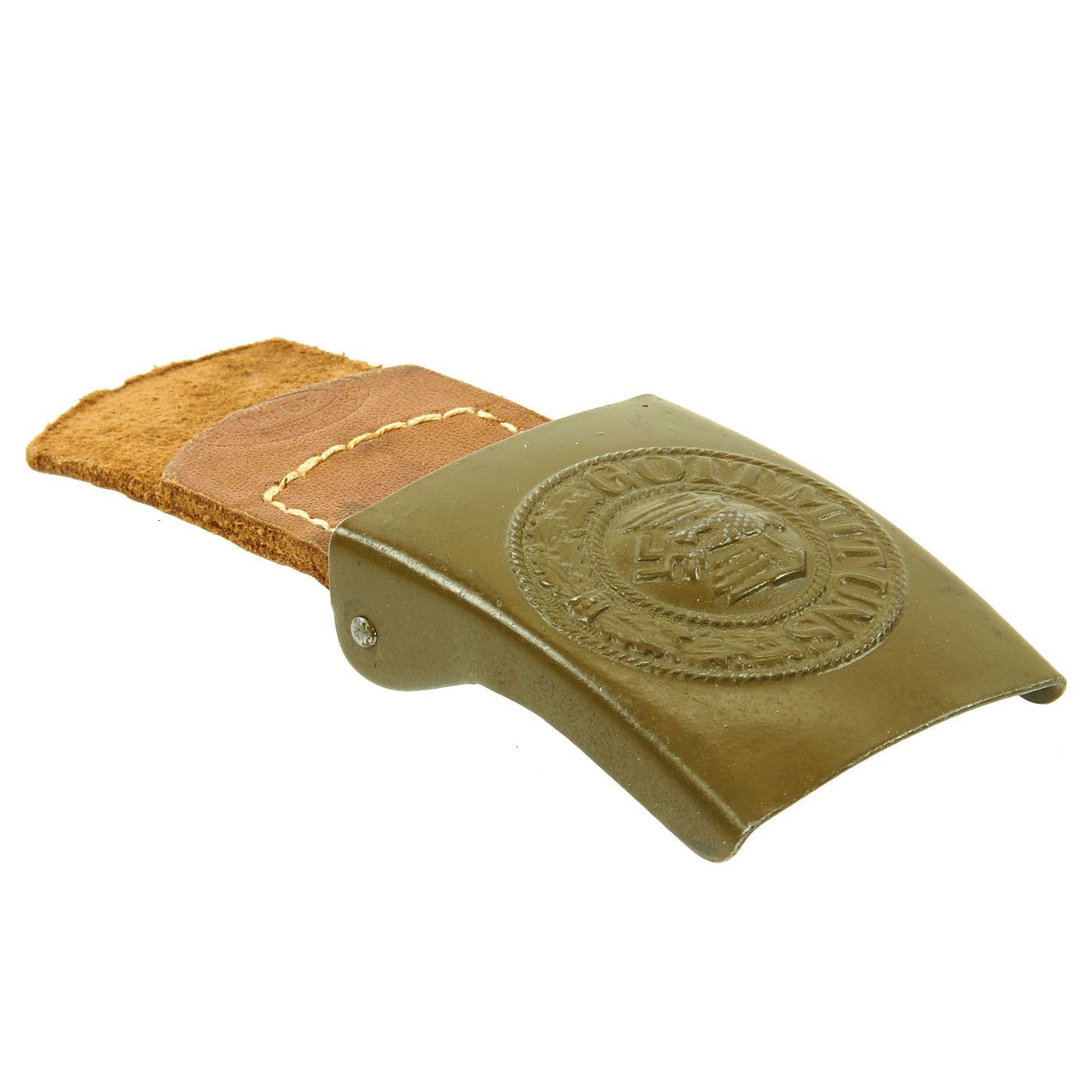 Original Item: Only One Available. This is an excellent condition WWII German Wehrmacht (Heer) EM/NCO's Belt Buckle (Koppelschloß). The Buckle design features a smooth outer field with central, high relief, embossed Wehrmacht eagle with down swept wings to slightly domed center, encompassed by an oak-leaf cluster to bottom and bears the Heer motto GOTT MIT UNS, (God with us), on the top. The oak-leaf cluster and script are on a ribbed background and encircled by an inner and outer simulated twisted rope border. This is a great early war olive field grey painted steel construction box buckle with a smooth background. The buckle is in great condition, with almost all of the original paint, and just some oxidation and wear from storage. It does not appear to have been used on a belt for any significant amount of time.