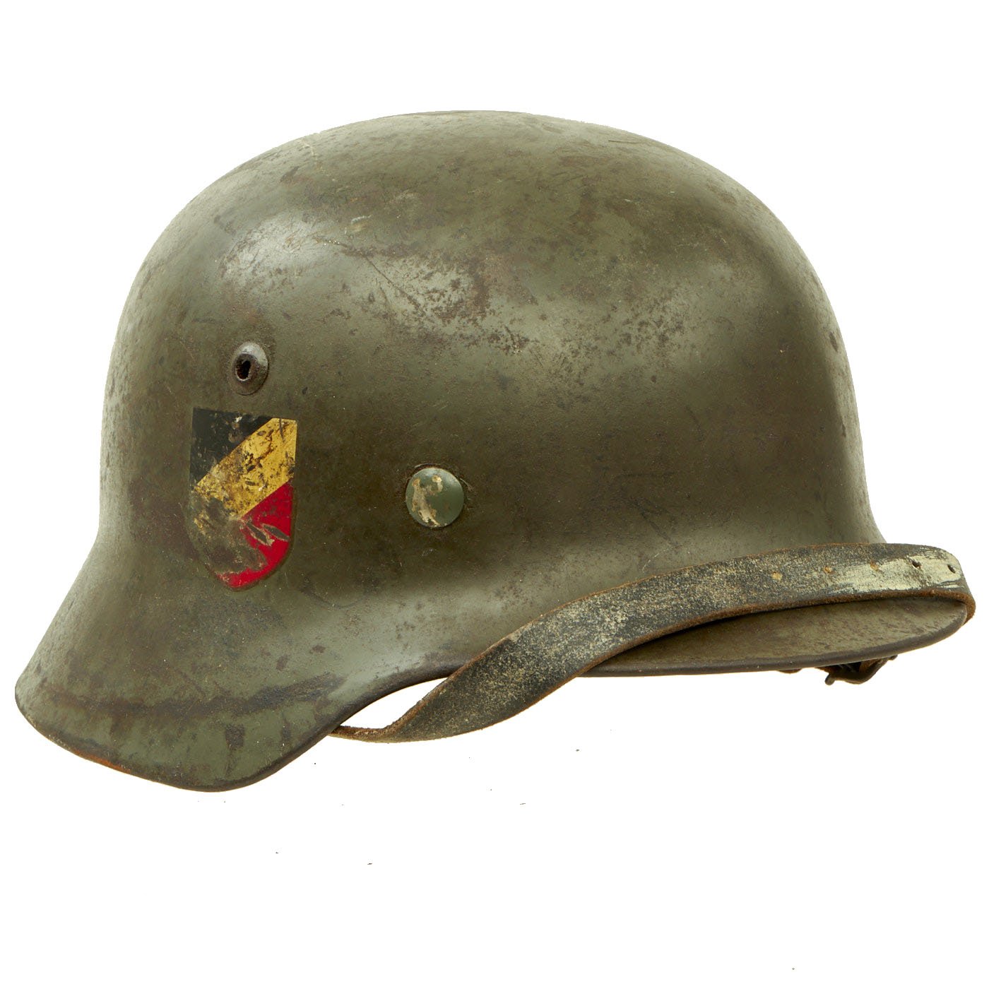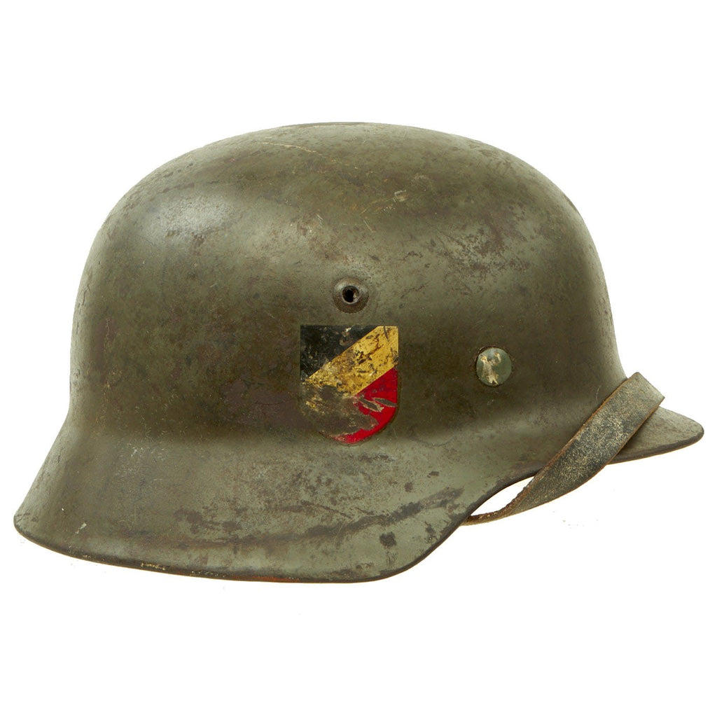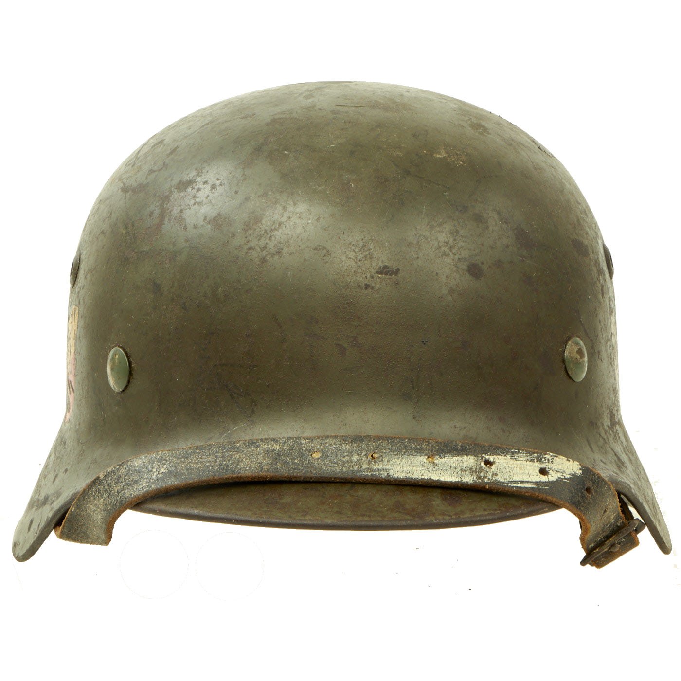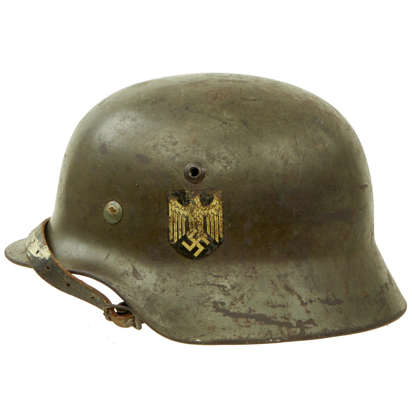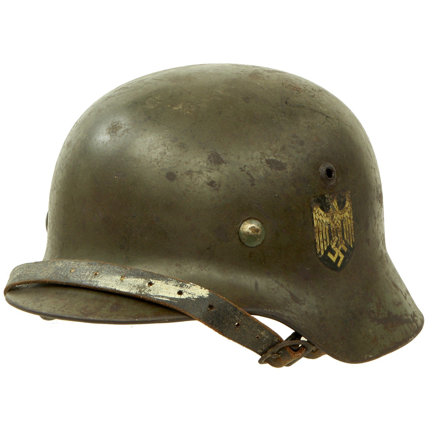 Original Item: Only One Available. This is an incredible excellent condition all original example of a German WWII M35 helmet, issued to the Heer (Army). This stamped sheet steel construction helmet retains about 65% of its original paint, and definitely shows service wear. It is painted in a very nice early Apfelgrün (apple green) paint, which is the early war color with more green in the mix. The use of the second decal was discontinued in 1940, and in 1943 it was ordered that helmets with the national colors have them removed. The decal on this helmet however escaped that fate, so it still has both decals.