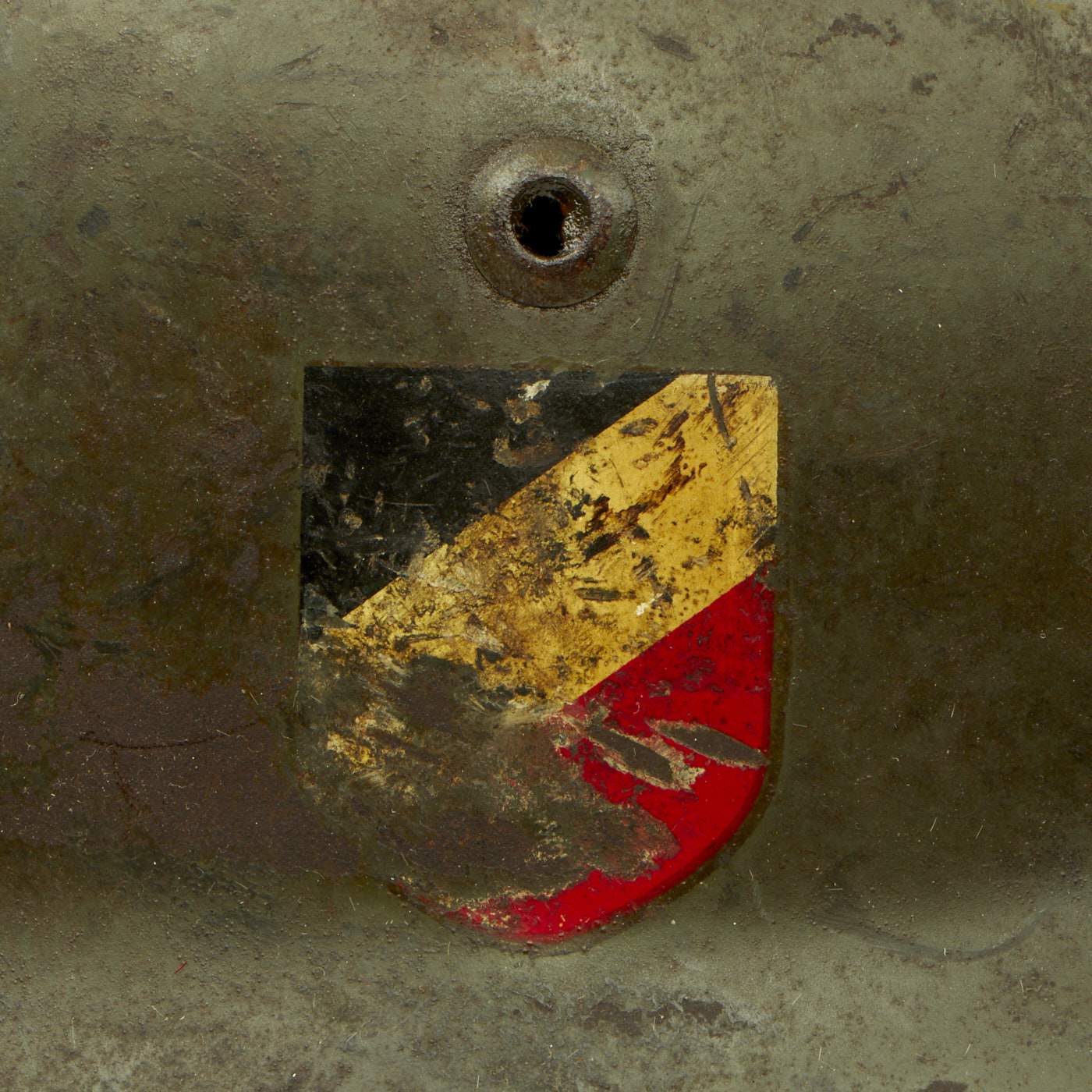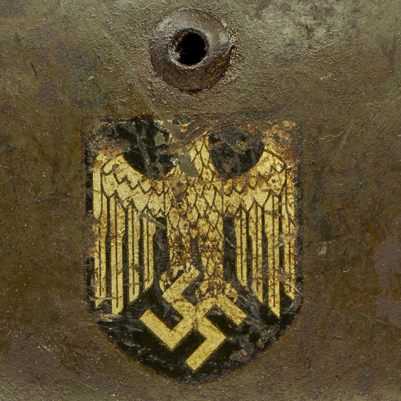 The left side of the helmet features a Heer eagle decal, which is retained about 75%, still bright and reflective, with some chipping near the top. The right side of the helmet features a national colors decal, which is retained about 60%, with a good amount of the bottom half removed. This is a really nice example of an original helmet with lots of patina!