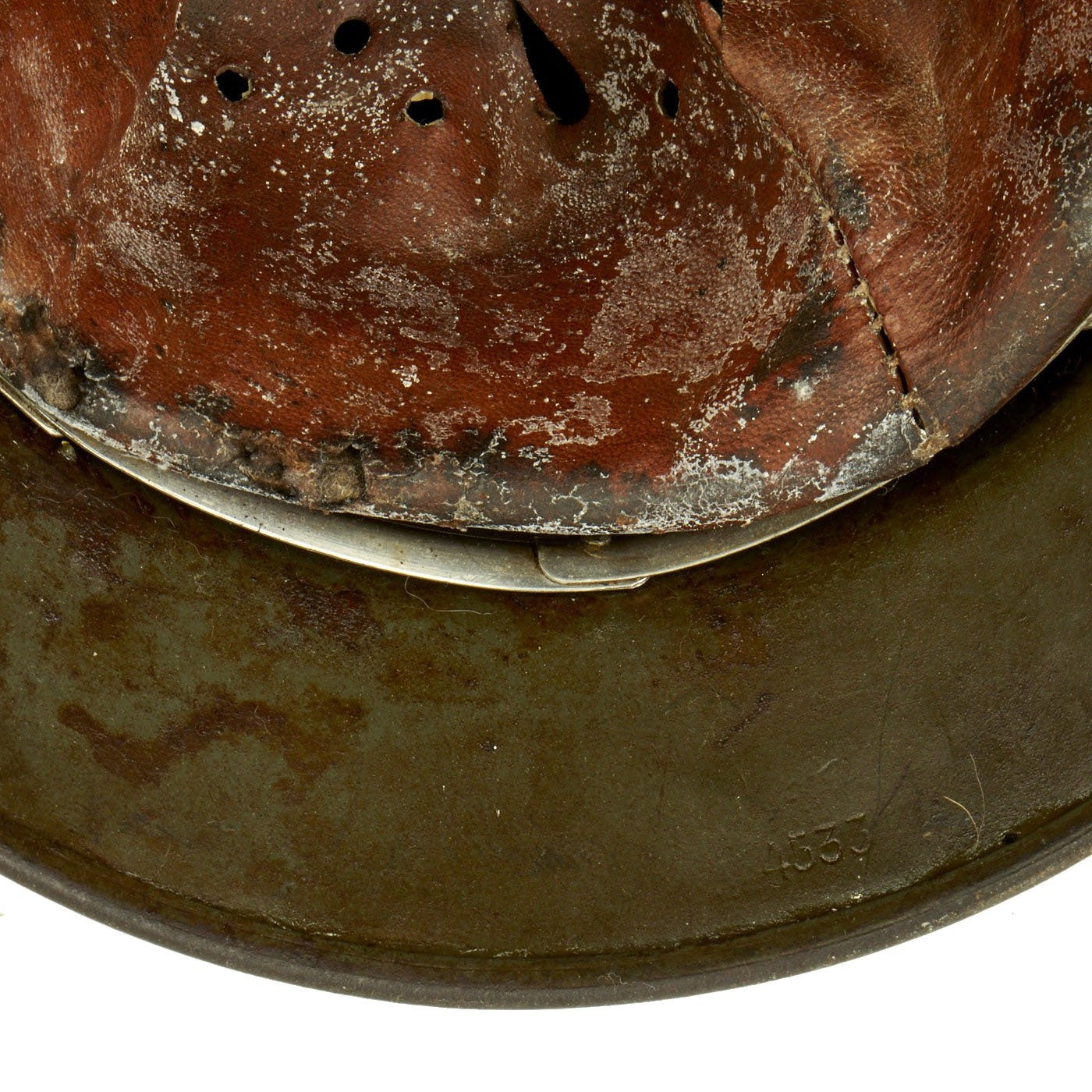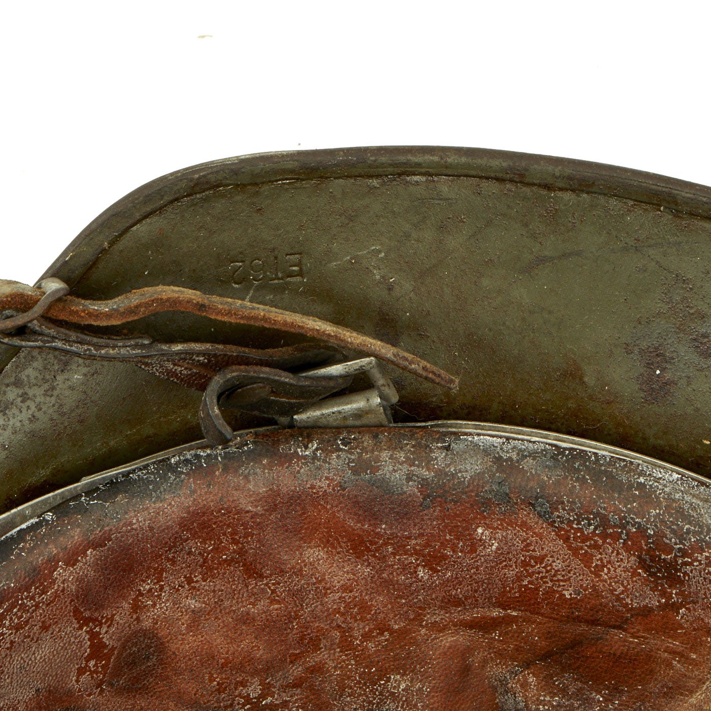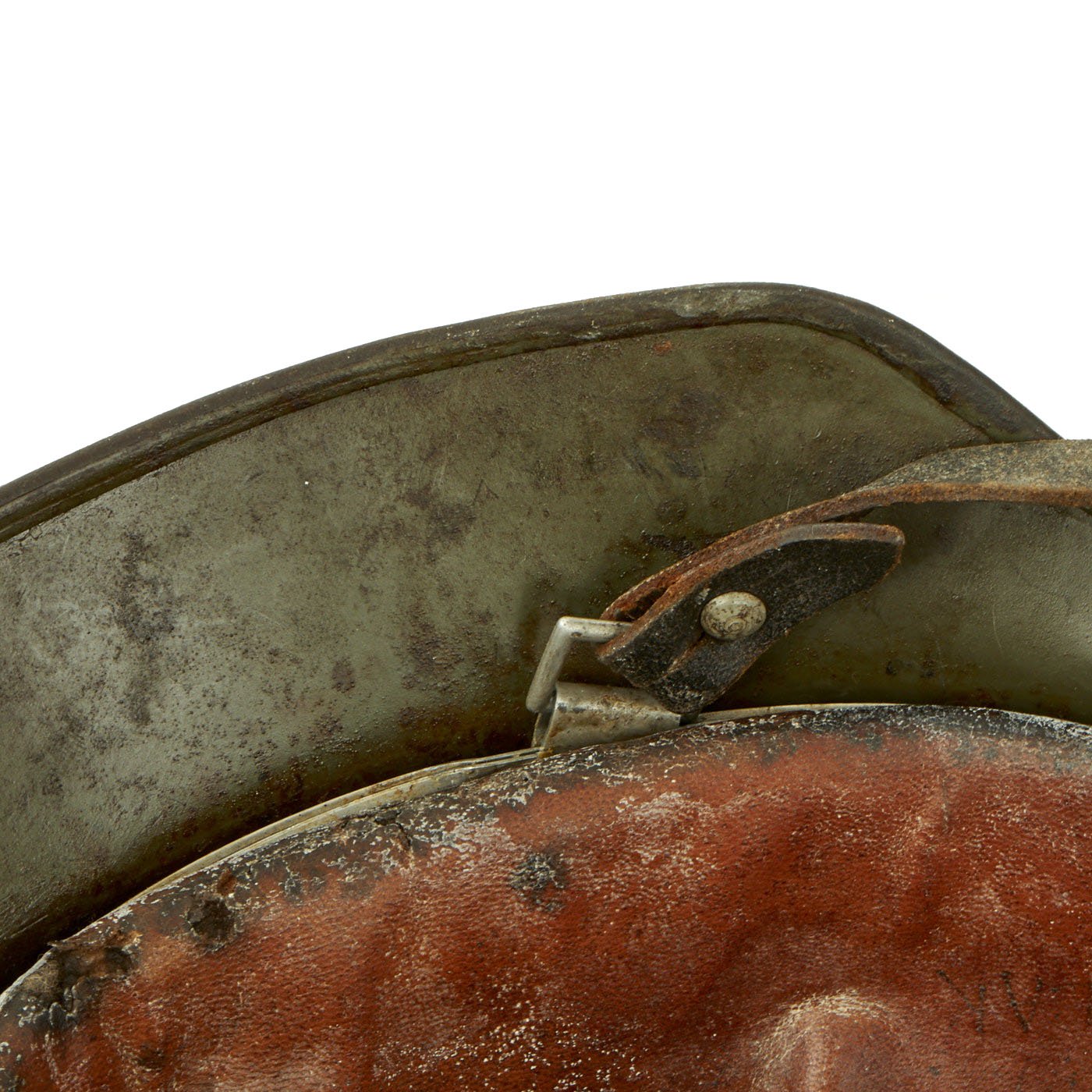 Attached to the liner is a very nice original chin strap, with is the mid war issue type with galvanized steel buckles and studs. It may be a wartime replacement, but it definitely shows wear that matches the rest of the helmet and liner, so we feel that it is probably original.