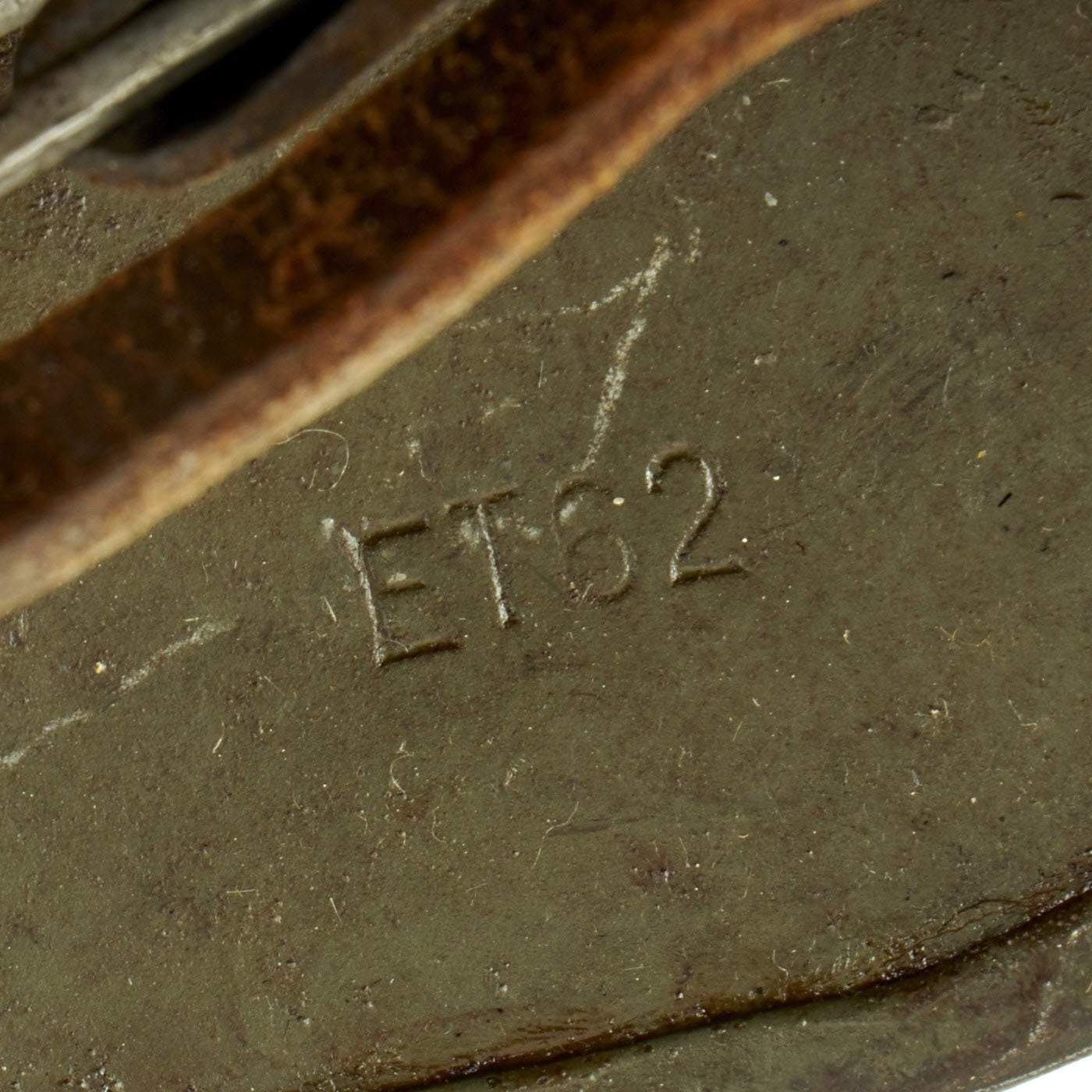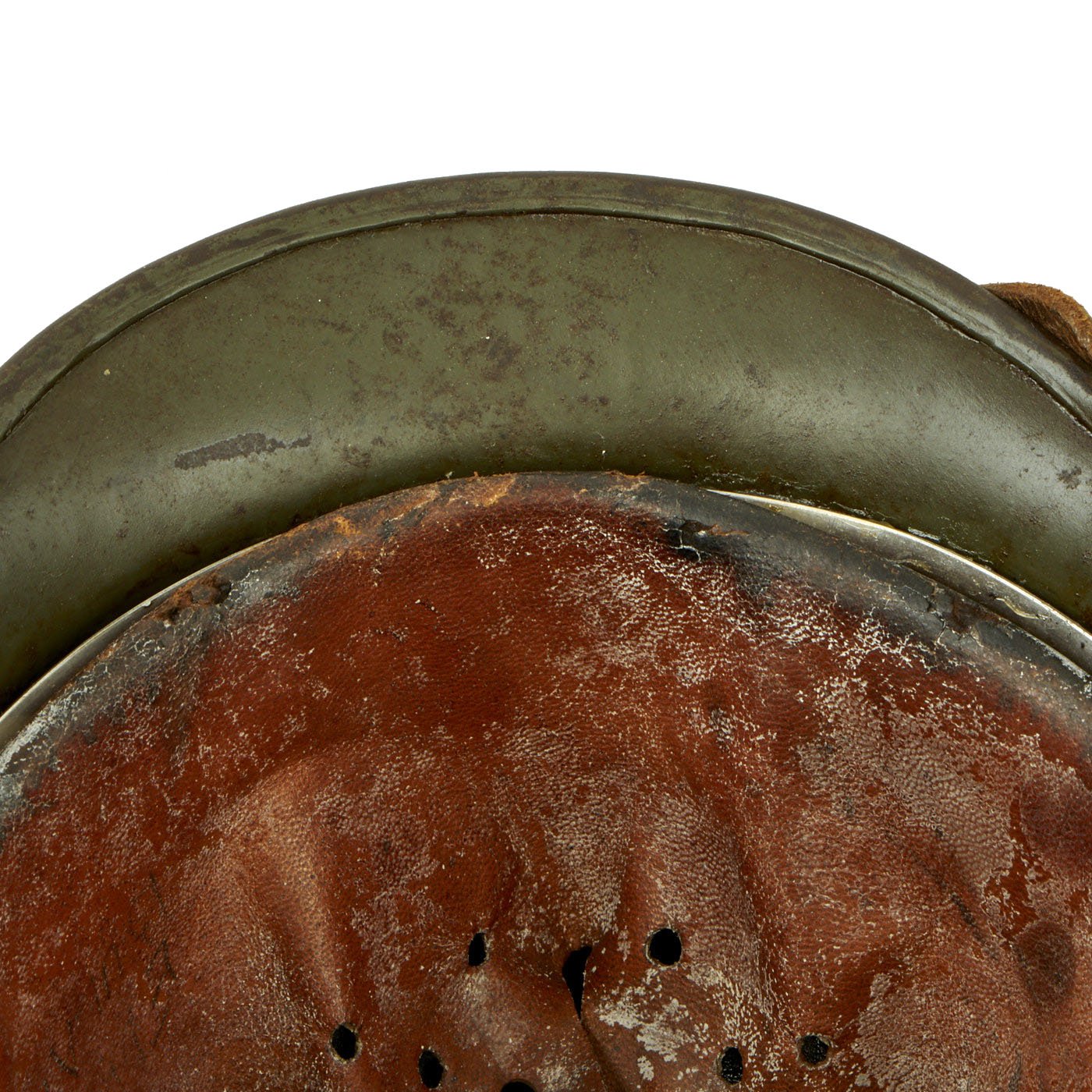 All three liner retaining pins are intact, with exterior paint retained to a varying extent. The interior of the helmet still has the original M31 leather liner with all eight of its fingers intact, with the original top tie. The liner leather is in good shape and still supple, though there is sweat staining as well as salt crusting from use. There is also some cracking around the rim. The correct early issue aluminum liner band is marked on the left side with 62 n.A. / 54, indicating a size of 54cm for a shell sized 62.