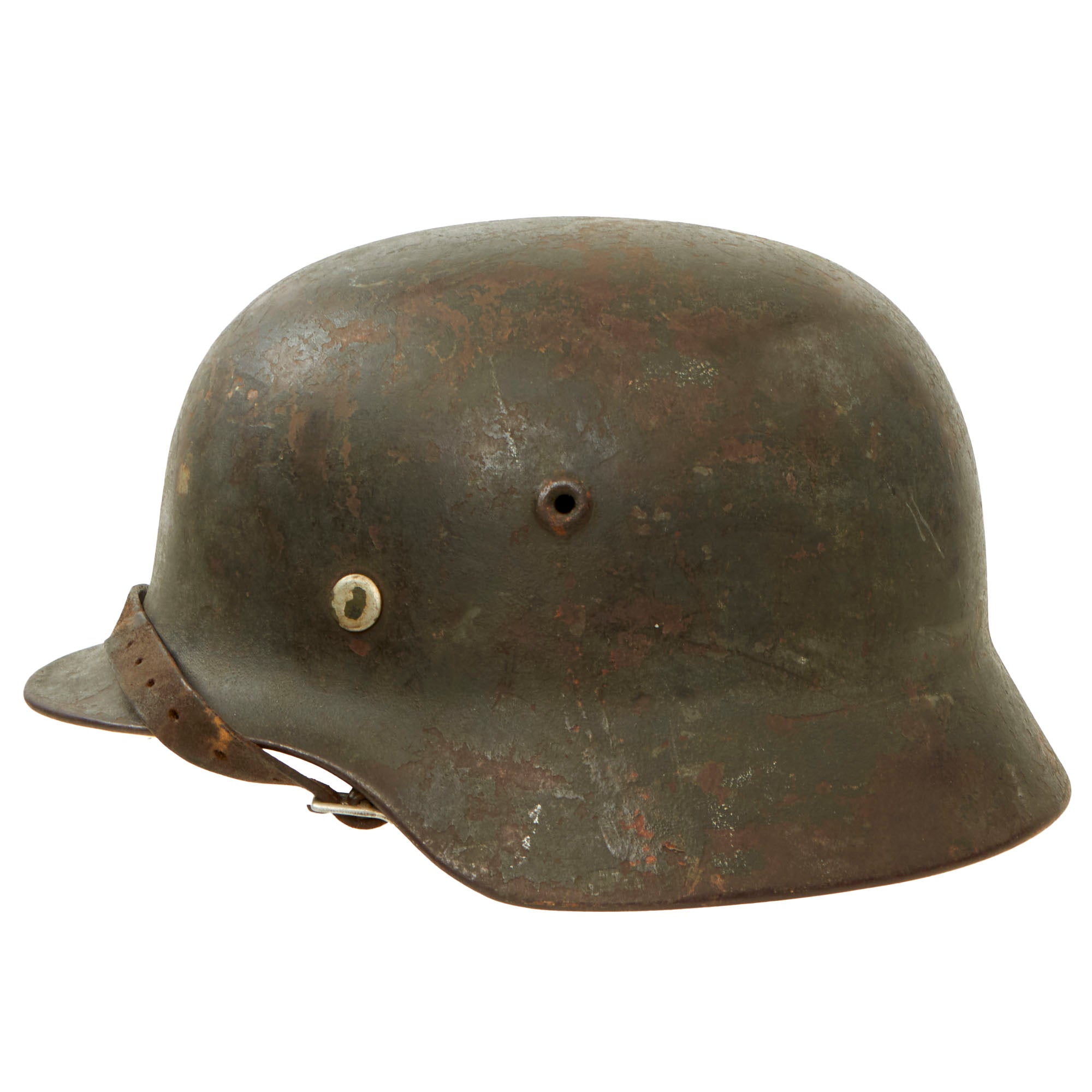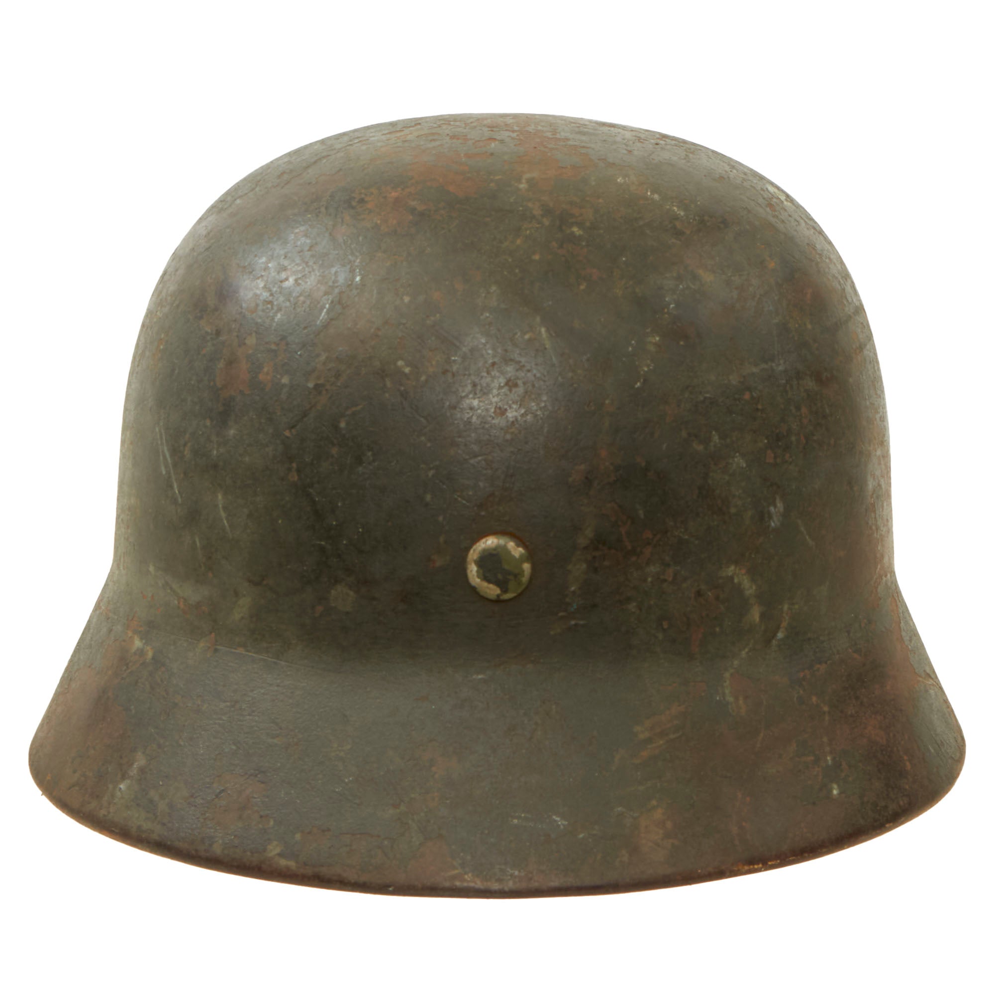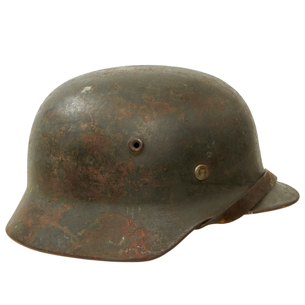 Original Item: Only One Available. This is a lovely service used all original example of a German Model 42 Steel helmet, as issued to the Wehrmacht Heer (army). This stamped sheet steel construction helmet saw a lot of service during the war, and the original paint is worn and chipped, with the exposed metal showing a lovely oxidized patina. We do not see that any decal was ever applied to the helmet, but it is always possible that it completely wore away. It is also possible that the helmet was originally early war Apfel-grün (apple green), and then was repainted lightly textured panzergrau (armored gray) during the war, and saw additional wear after that. The helmet was most likely picked up later in the war, and shows no signs of having had any restoration. A lovely "untouched" example with a lovely "been there" patina!