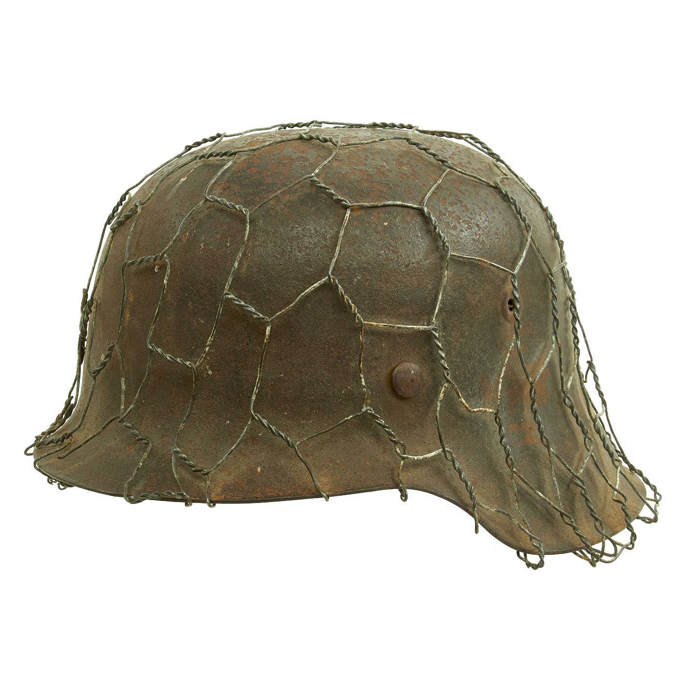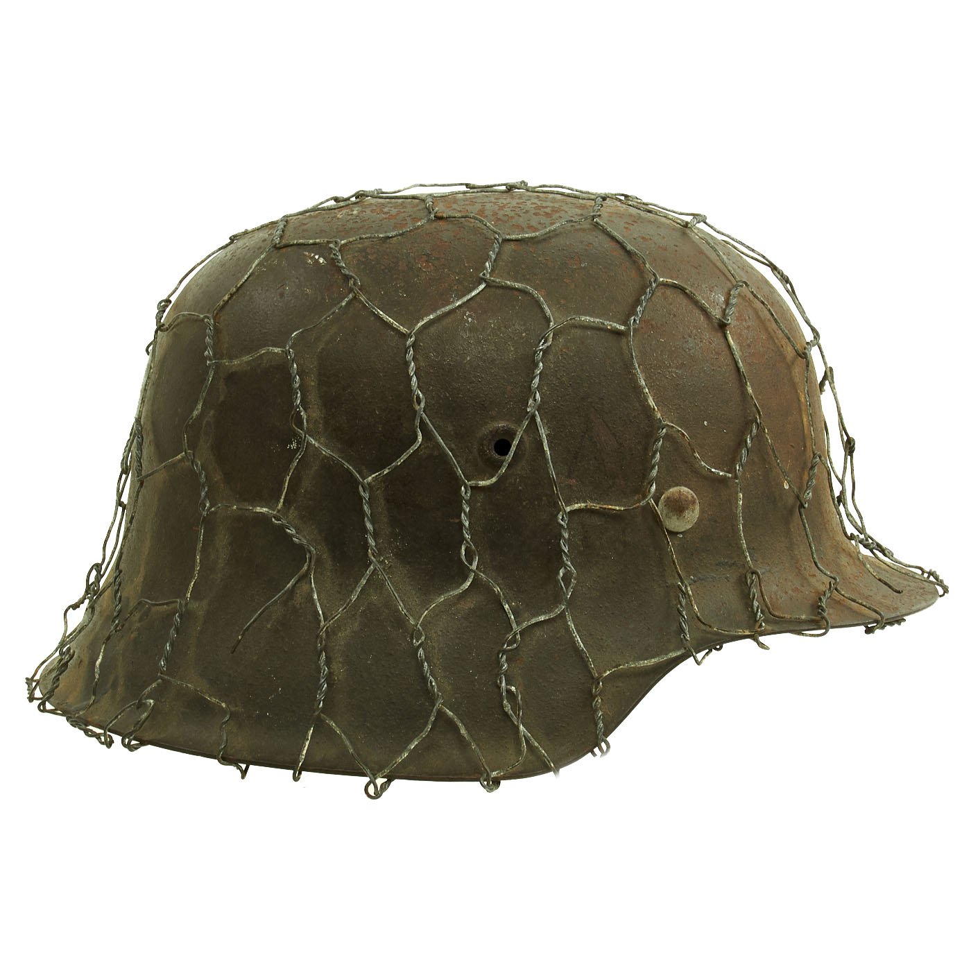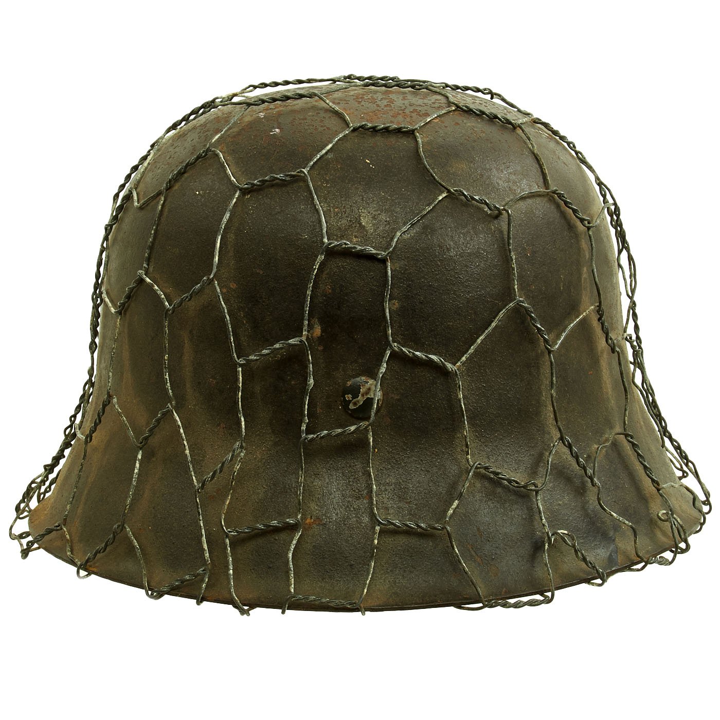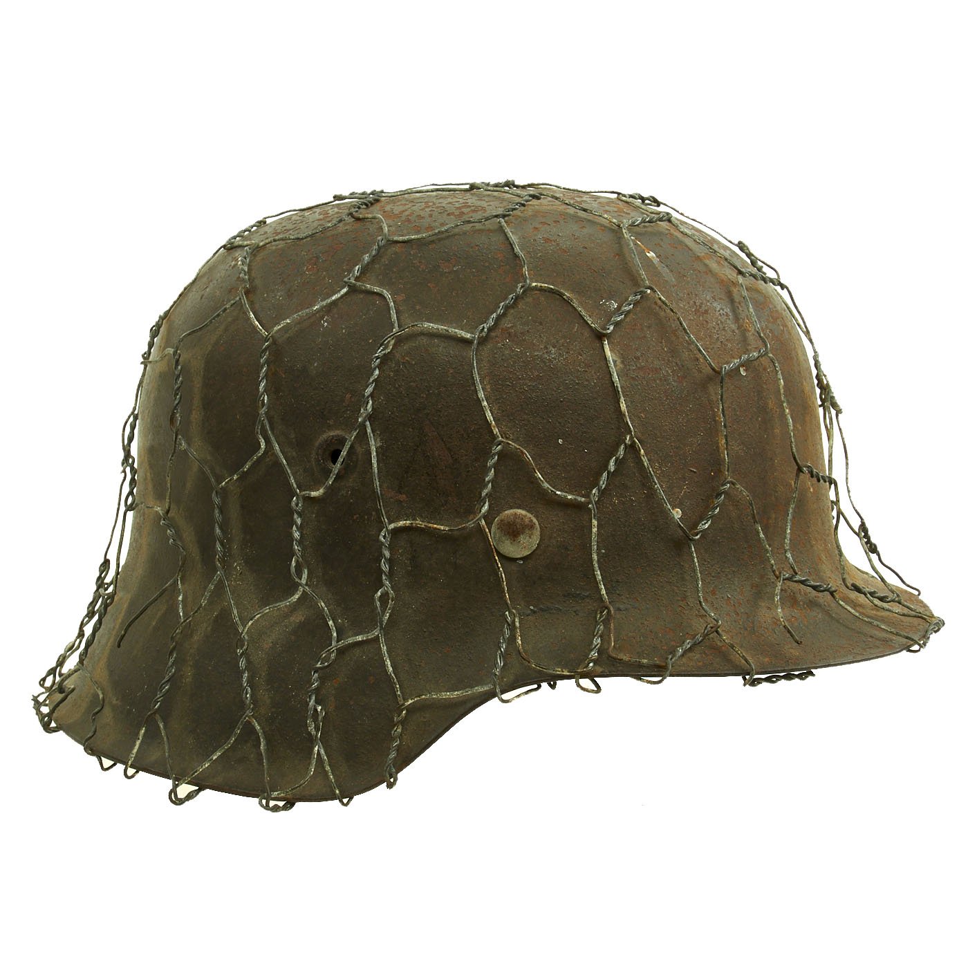 Original Item: Only One Available. This is a very nice all original example of a German WWII M42 helmet, issued to the Heer (Army), with a lovely original Chicken Wire Cover. The wire was used to easily attach foliage and other camouflage items from the area, and could easily be redecorated for a new season. The wire has the correct zinc soldered twist joints, which indicates this is definitely period correct wire. This stamped sheet steel construction helmet retains much of its original paint but does show some chipping, scratches, and rust, typical of a helmet that was used in the field. You can see how the chicken wire has worn the paint itself, showing that the wire has been on the helmet for a long period of use.