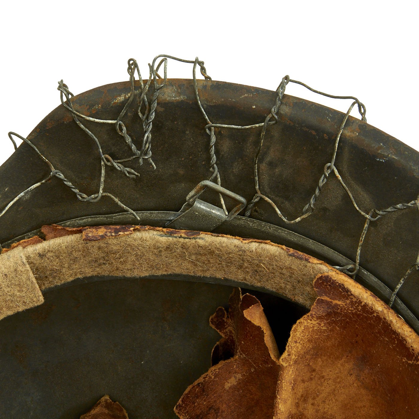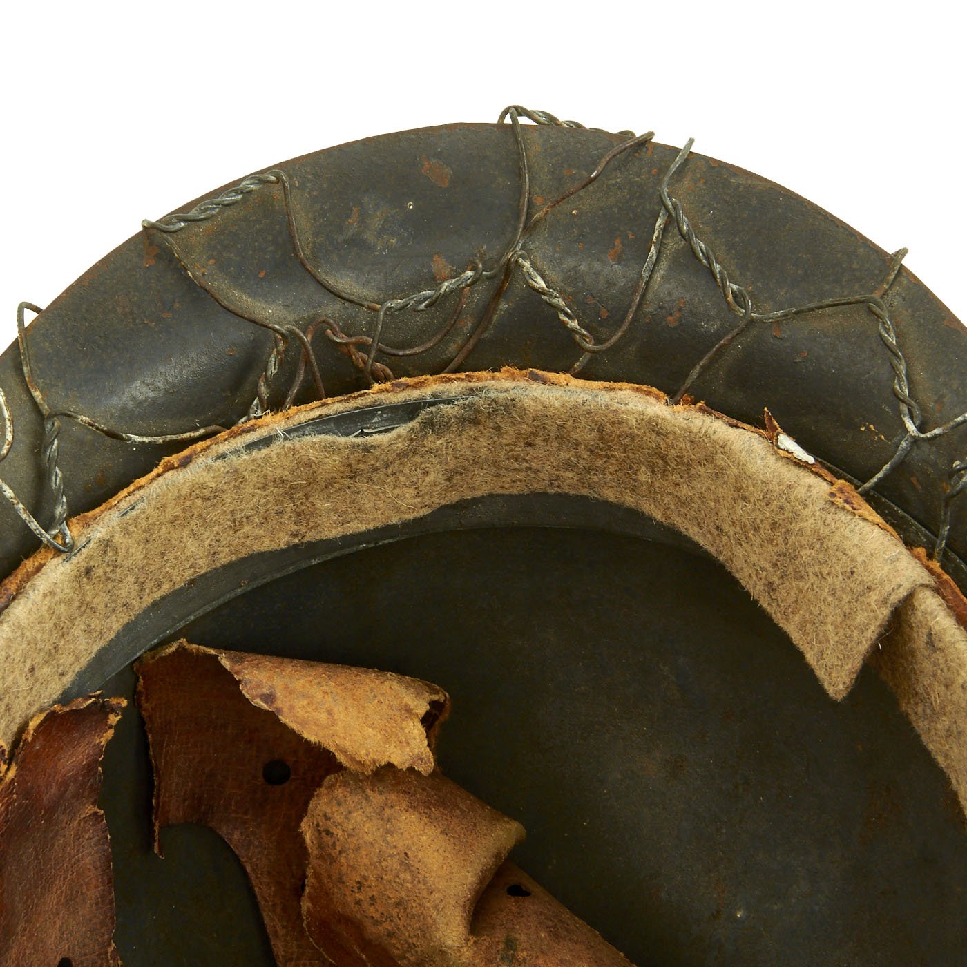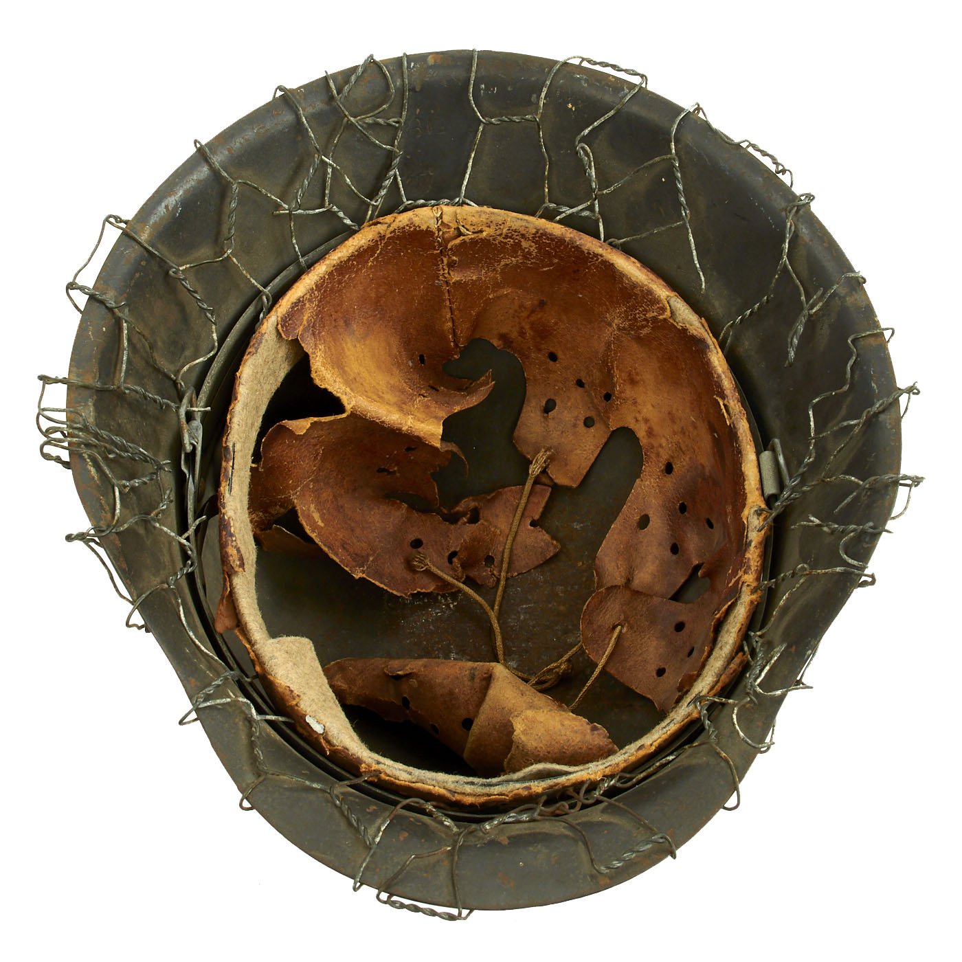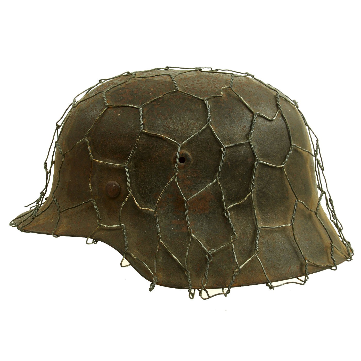 Original Item: Only One Available. This is a very nice all original example of a German WWII M42 helmet, issued to the Heer (Army), with a lovely original Chicken Wire Cover. The wire was used to easily attach foliage and other camouflage items from the area, and could easily be redecorated for a new season. The wire has the correct zinc soldered twist joints, which indicates this is definitely period correct wire. This stamped sheet steel construction helmet retains much of its original paint but does show some chipping, scratches, and rust, typical of a helmet that was used in the field. You can see how the chicken wire has worn the paint itself, showing that the wire has been on the helmet for a long period of use.