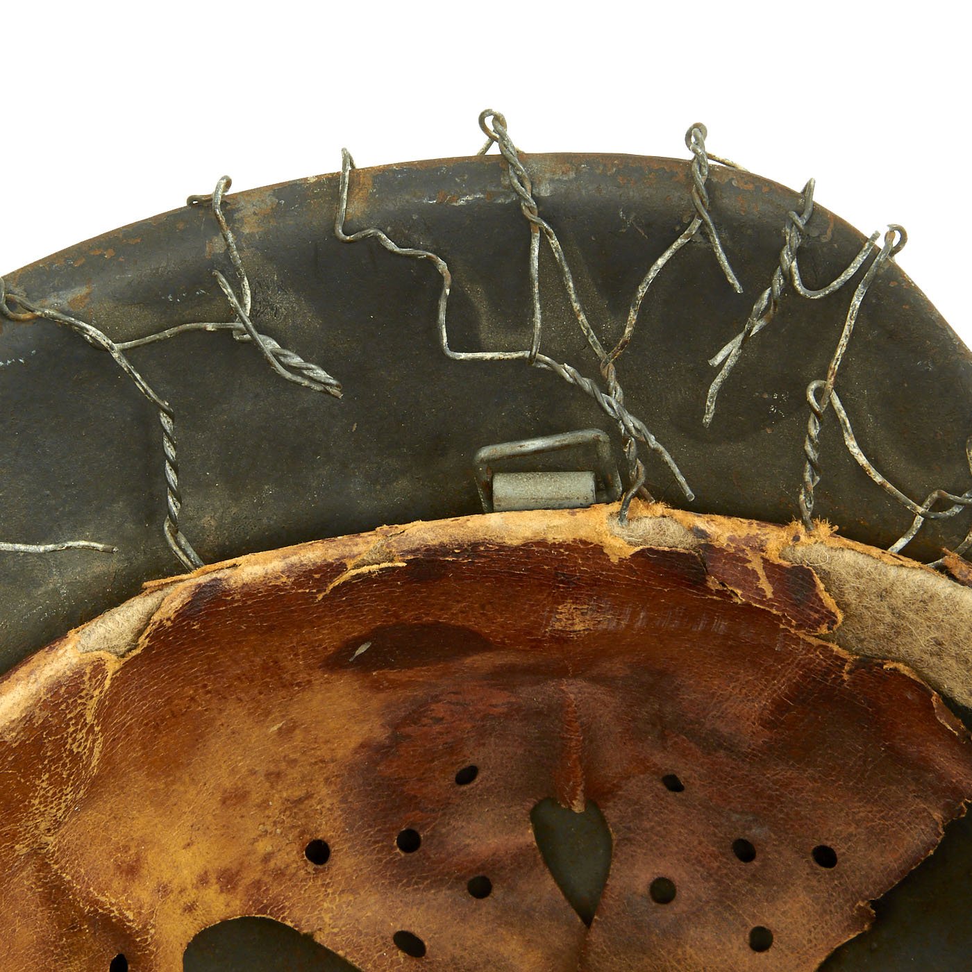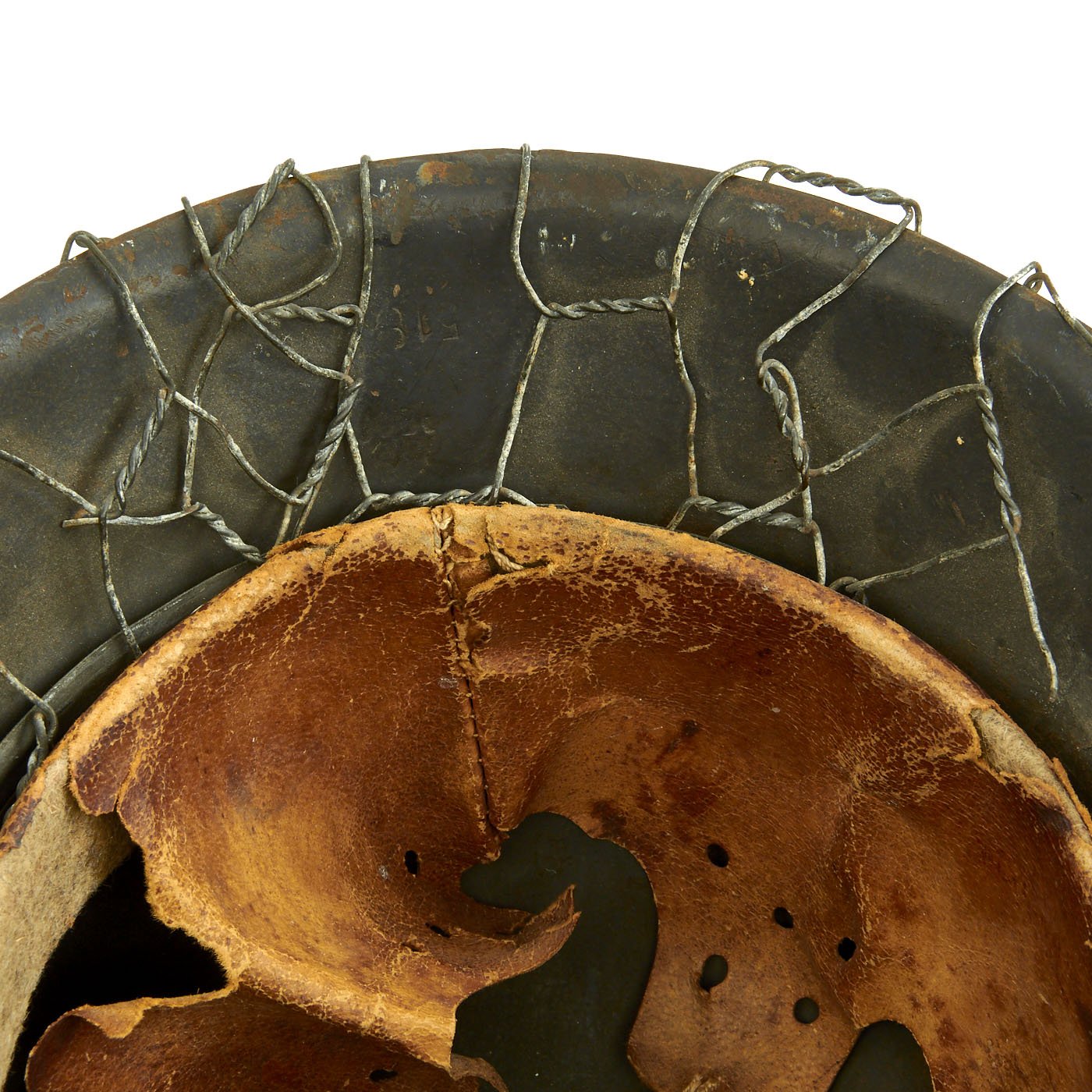 All three liner retaining pins are intact, and still have some of the original paint. The interior of the helmet still has the original M31 leather liner installed, however the leather is quite deteriorated and torn away. It looks like remnants of all 8 fingers are present, with the top tie, but the leather has mostly torn away from the band, and the felt padding is exposed on over 50% of the band. The side of the galvanized steel liner band is marked 66 n.A. / 58, indicating that this is a size 58 liner for a size 66 shell. The other side has the manufacturer and date, part of which is faintly stamped: