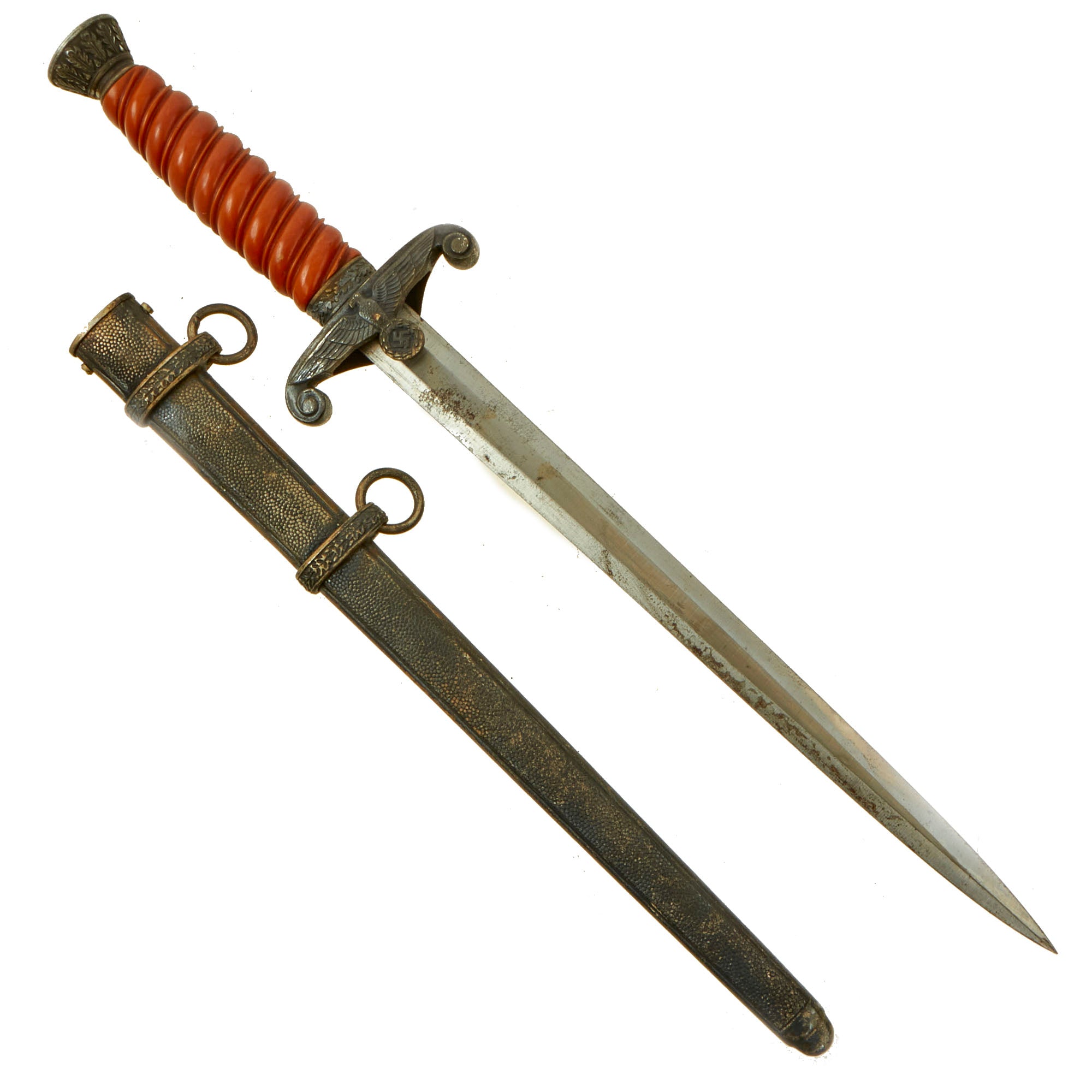 The German Army (Heer) first carried a dagger beginning in 1935. The weapon was worn in lieu of occasions not demanding the wearing of a more formal sword. The dagger design was quite attractive featuring silvered heavy fittings with white or colored grip. The crossguard depicted a Wehrmacht open-winged eagle clutching a wreathed swas.