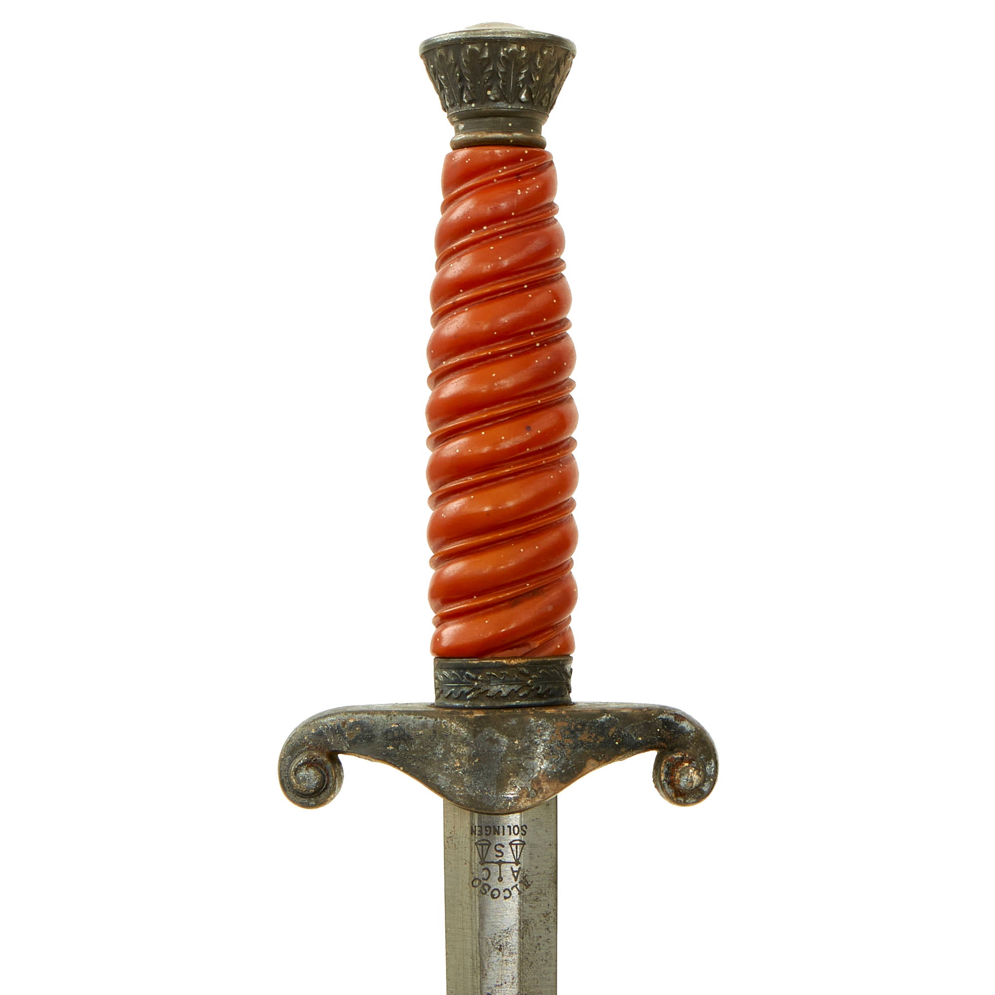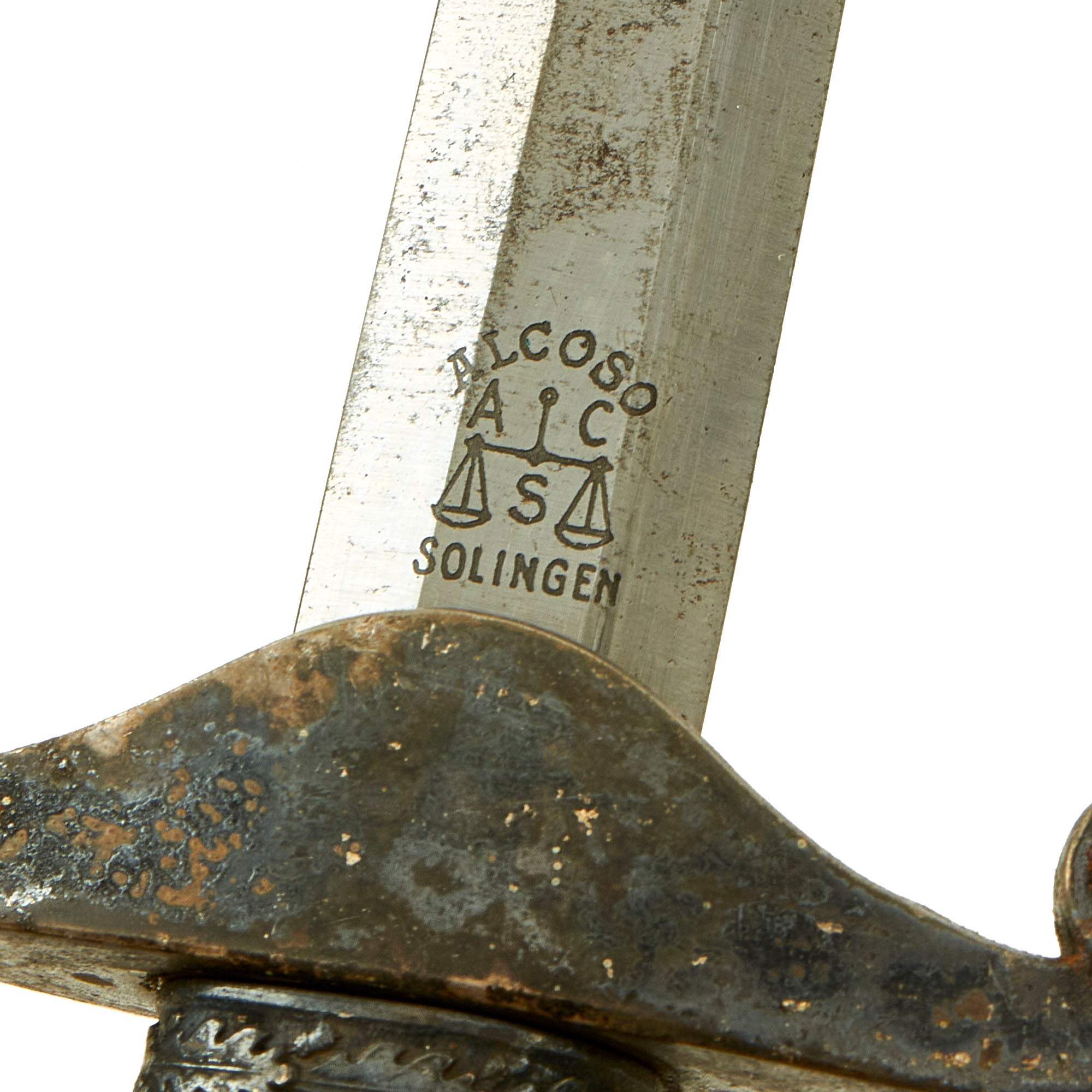 The reverse ricasso is etched with the trademark Alcoso used in 1939-1940. It depicts the scales with the firm's initials, ACS interspersed. Above is the firm's name, ALCOSO, and below the town of business, SOLINGEN, the legendary "City of Blades" in Western Germany.