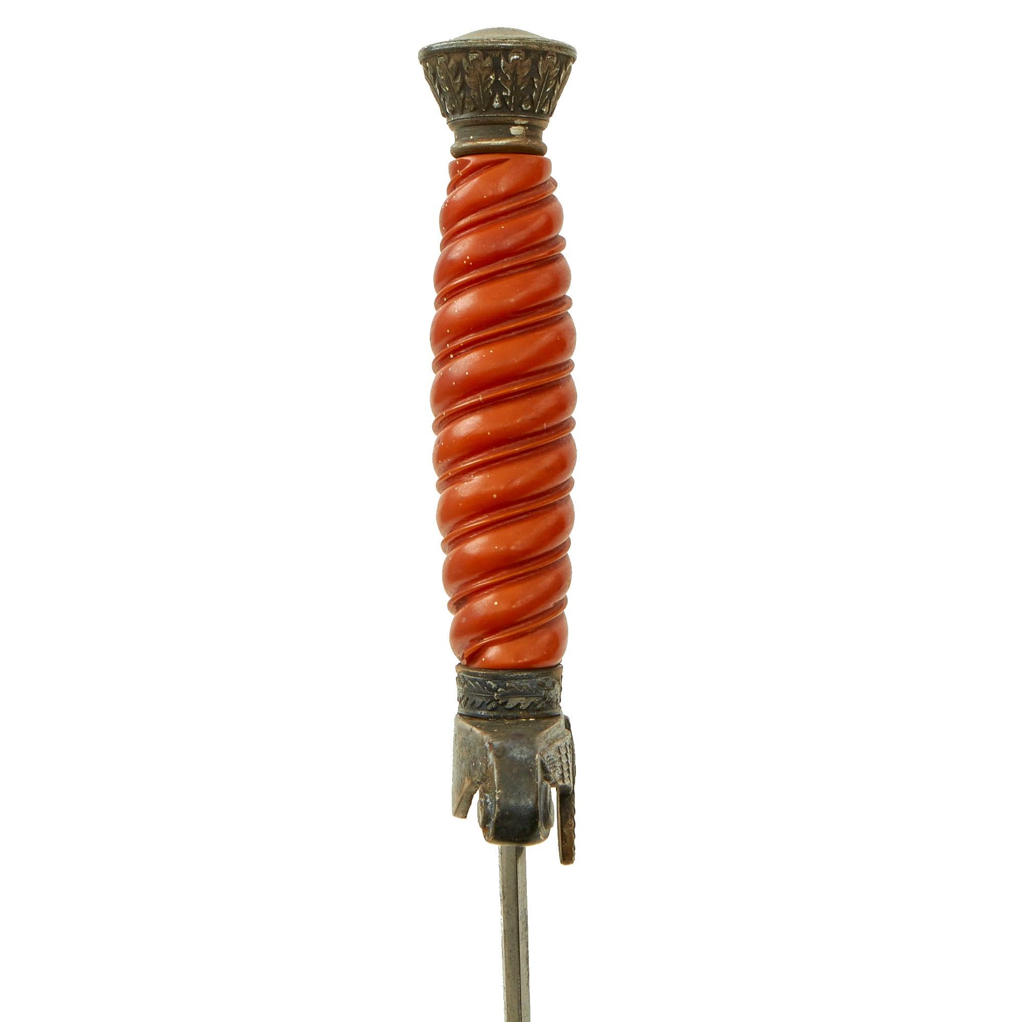 The plated pommel of this dagger is in good condition, showing a bit of wear around the rim, exposing the aluminum base metal. The standing oak leaves and acorns on the sides are crisply detailed and have good black backgrounds. The cross guard also shows much of the original silver plating, with wear through to the base metal on some of the corners. We tested it with a magnet, and it seems to be an iron or steel crossguard, silver plated and then oxidized. There is a bit or rust in areas where the plating has eroded. The details throughout the eagle are sharp throughout the head, breast and wing feathering, talons and wreathed mobile swas. Definitely some interesting fittings!
