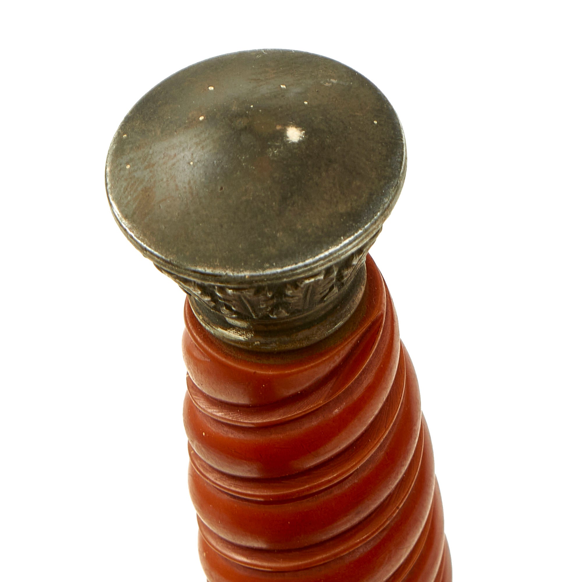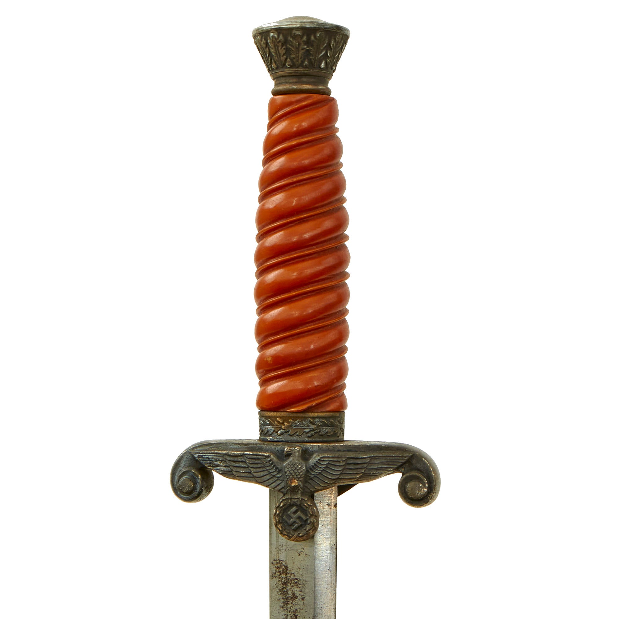 The pommel depicted oak leafing around the outer circumference. The scabbard had panels of pebble designs. Later produced examples were plated with nickel, and late war-made pieces were unplated, finished in a gray color metal. This early war version is quite nice, and in great shape.