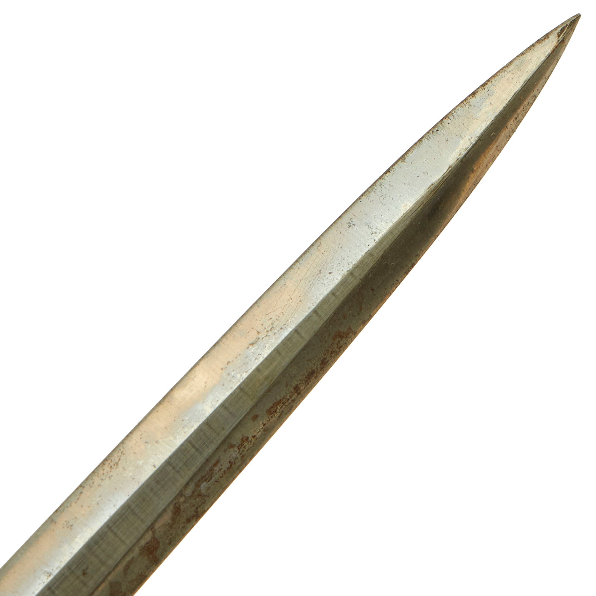 The very good condition blade is mostly bright throughout, strongly showing virtually all of the original factory final grind cross grain. This texture is iconic, and is the definitive identifying characteristic for a real WWII German Blade. It does have a bit of staining in areas, which we have left intact to preserve the cross grain and patina. There also is the usual runner wear on the blade surface, however this is present on just about every dagger out there. Definitely a very nice blade. The edge has correctly not been sharpened, and the needle like tip is still fully intact. The leather blade washer is still intact and in place inside the crossguard.