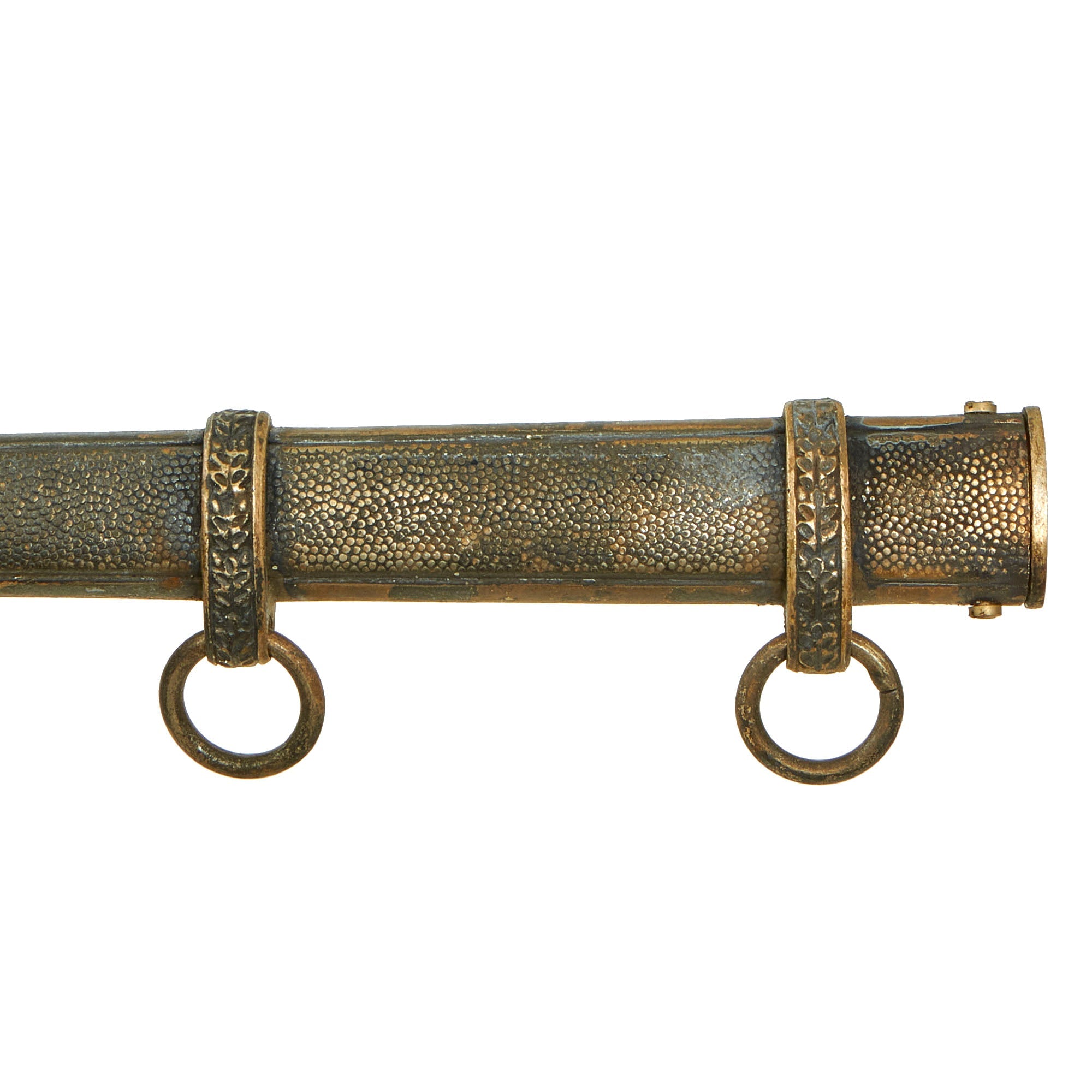 The scabbard is a fine dent-free plated steel example, and still retains about 60% of the blue plating, matching the hilt mount color very well. The sides have very crisp, finely pebble-grained panels. The alloy carrying bands have an excellent pattern of overlapping oak leaves and acorns, with hand enhancing evident on each of the leaves. The throat is the narrow style, retained by "cheese head" screws on the narrow sides of the scabbard. It has a lovely worn look, showing areas of oxidized bare steel, as well as silver that has lost the blue coating.