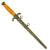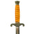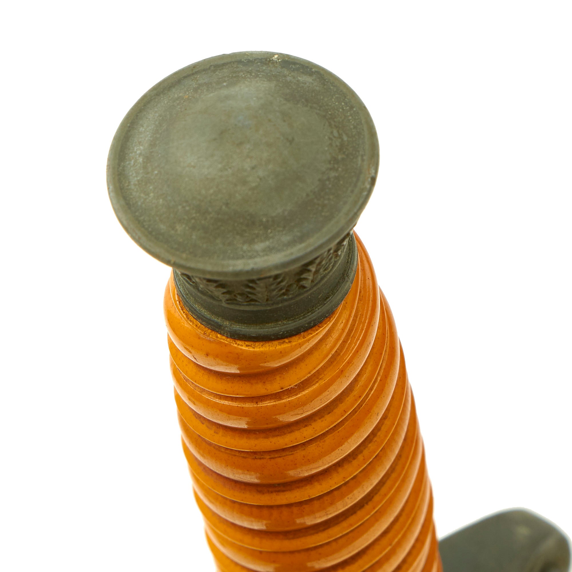 The celluloid grip on this dagger has faded from the original ivory color to a lovely amber color, with no major deterioration present. One side is a bit lighter than the other, so it was probably resting on that side for some time, as the light is what causes the discoloration. The grip is in very good condition, showing only minor scratching on the edges, with the antiquing in the grooves still present. The hilt is still tight on the tang, and the original blade buffer is still present in the recesses of the guard, but it is definitely flattened.