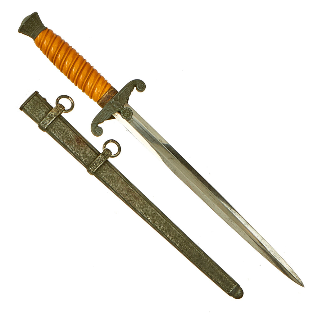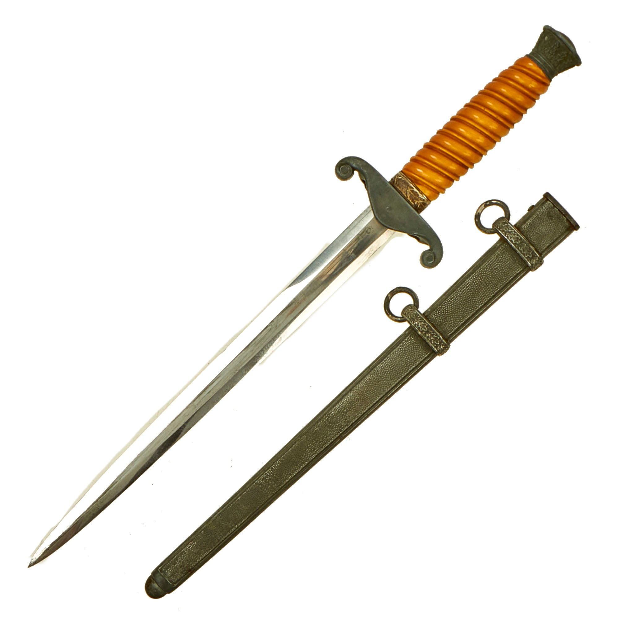 The German Army (Heer) first carried a dagger beginning in 1935. The weapon was worn in lieu of occasions not demanding the wearing of a more formal sword. The dagger design was quite attractive featuring silvered heavy fittings with white or colored grip. The crossguard depicted a Wehrmacht open-winged eagle clutching a wreathed swas.