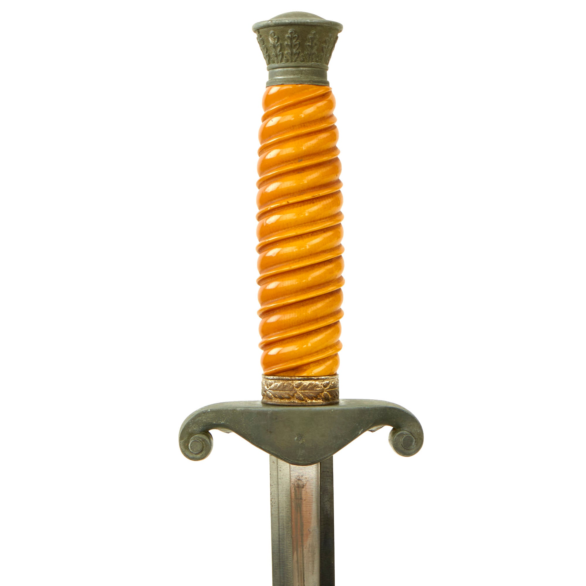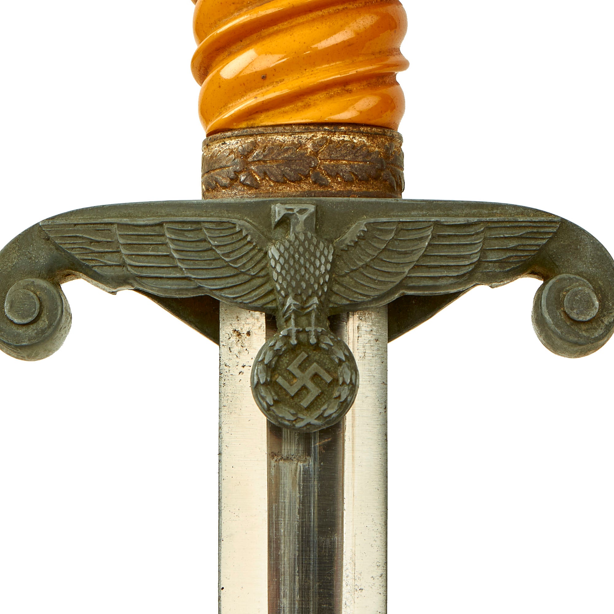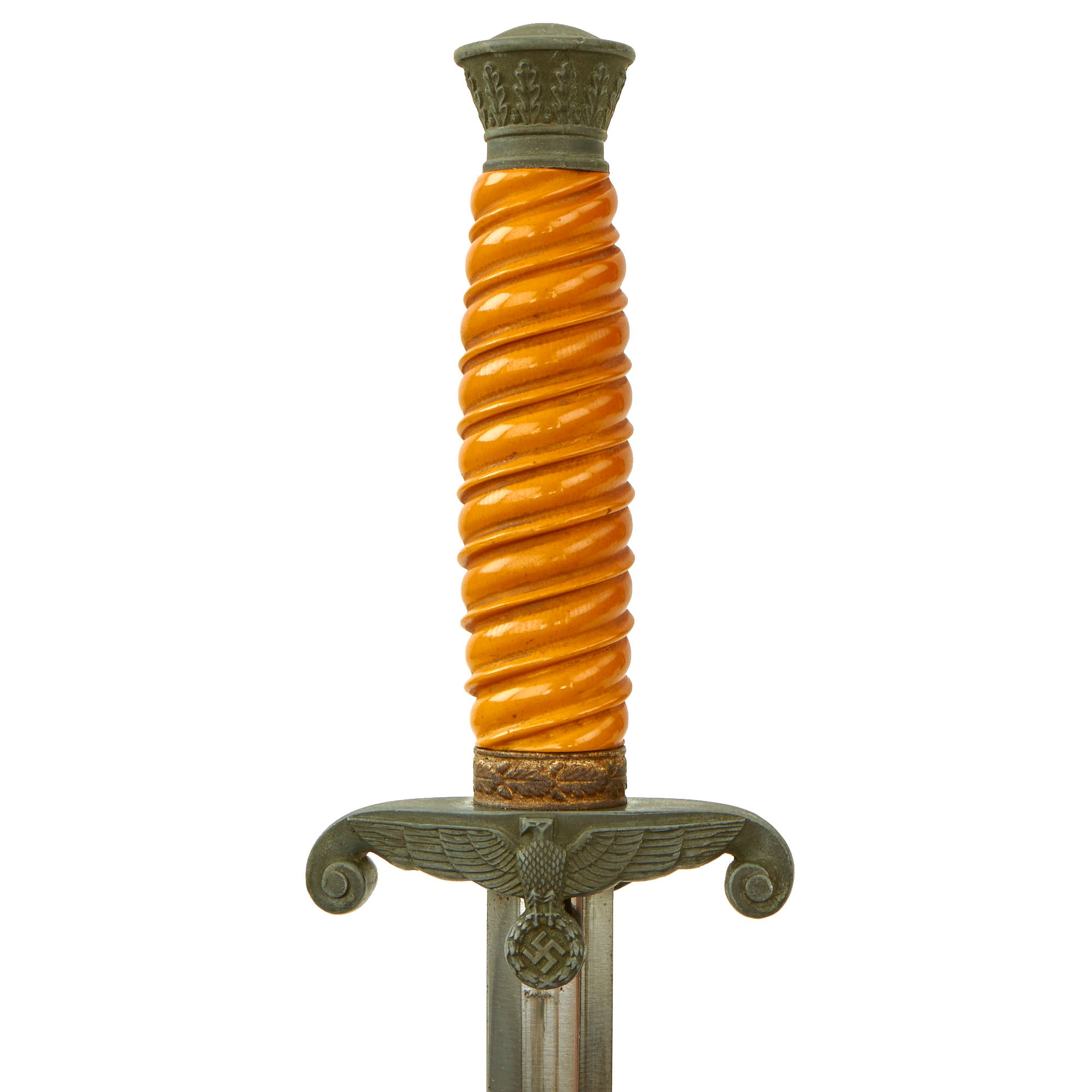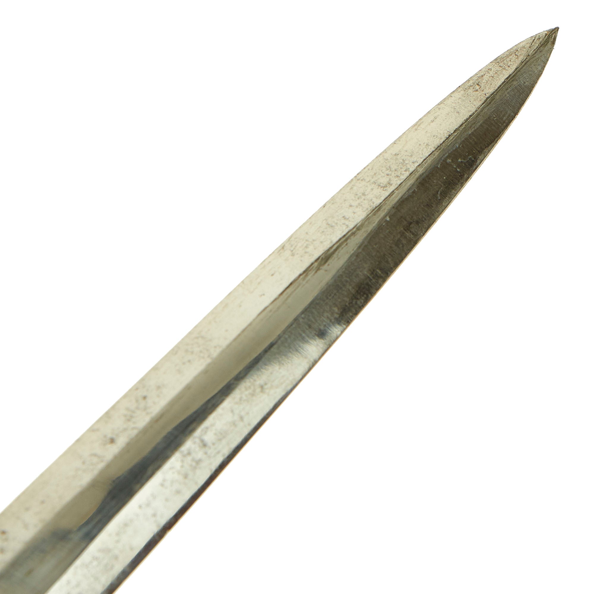 The pommel depicted oak leafing around the outer circumference. The scabbard had panels of pebble designs. Later produced examples were plated with nickel, and late war-made pieces were unplated, finished in a gray color metal. These daggers are often encountered with an aluminum portepee.