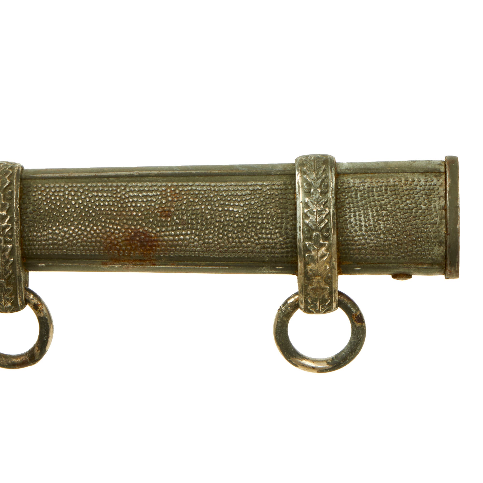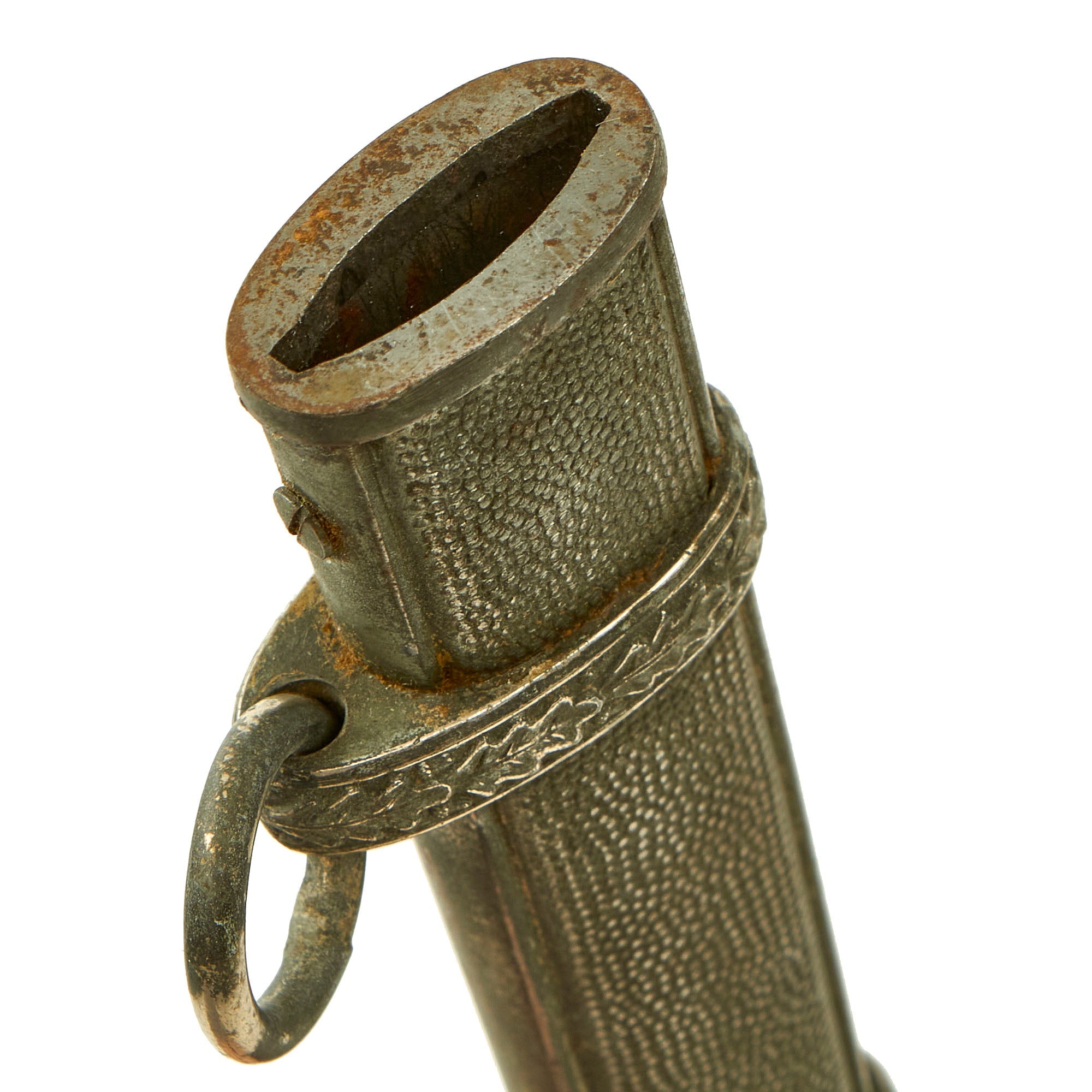 The scabbard is a fine example, and is steel with what looks to be zinc plating, which is very well retained. There is just a bit of wear through on the edges, and over all the scabbard has a lovely gray patinated look. This straight scabbard has very crisp, finely grained panels. The zinc alloy carrying bands have an excellent pattern of overlapping oak leaves and acorns, which are nicely enhanced, but also show some wear. The throat is the thinner style, and has a single "cheese-head" securing screw on the upper narrow side. The scabbard has a great service worn patina overall.