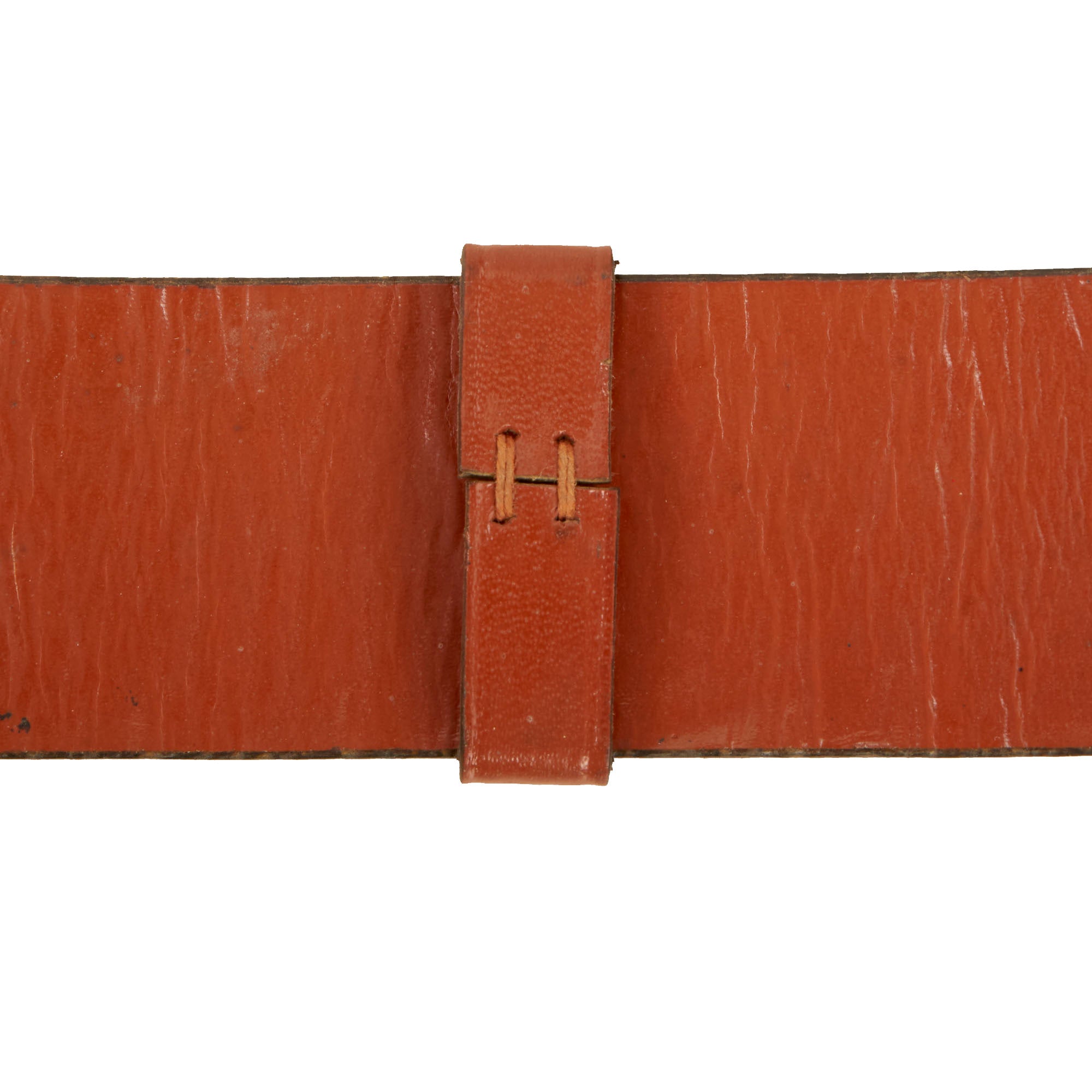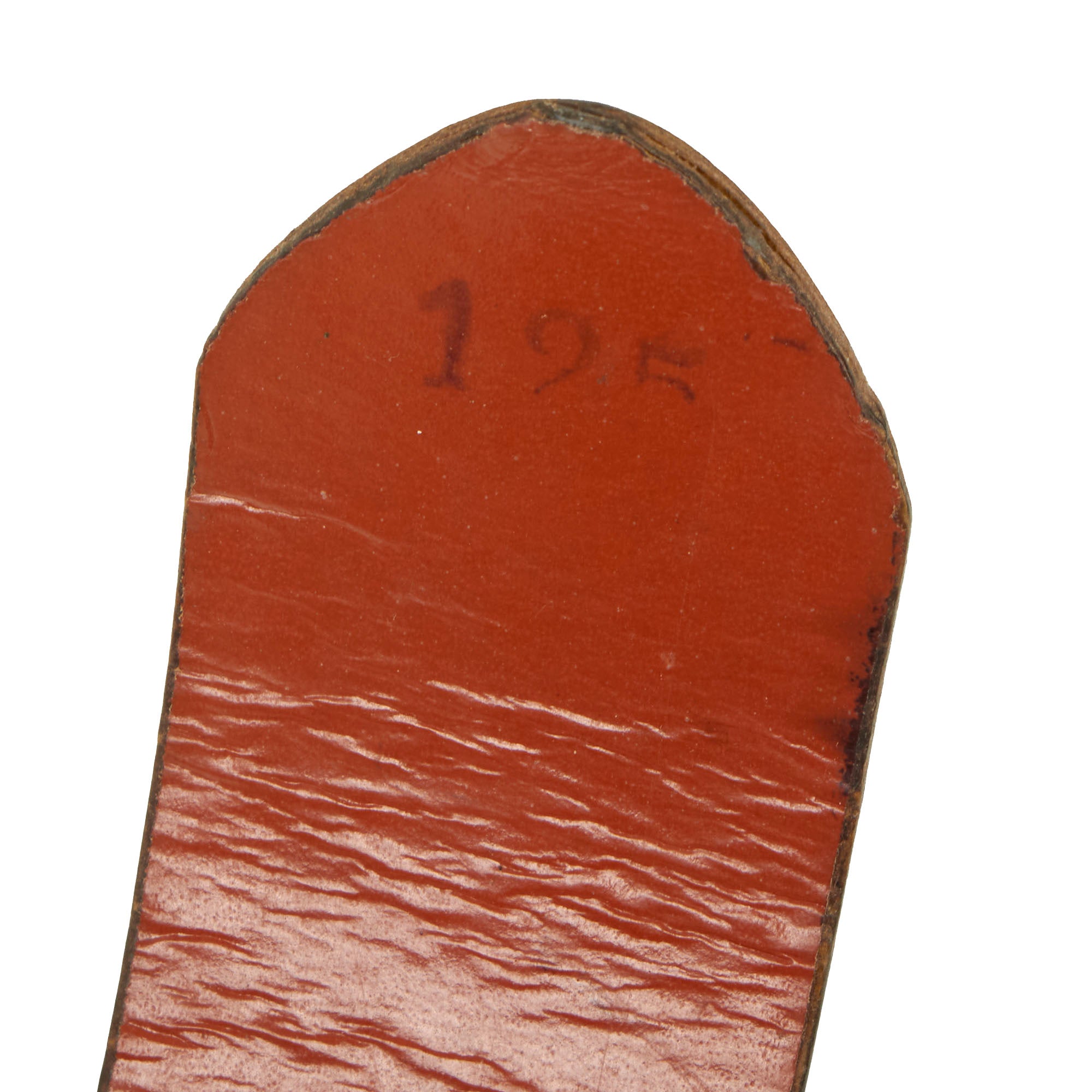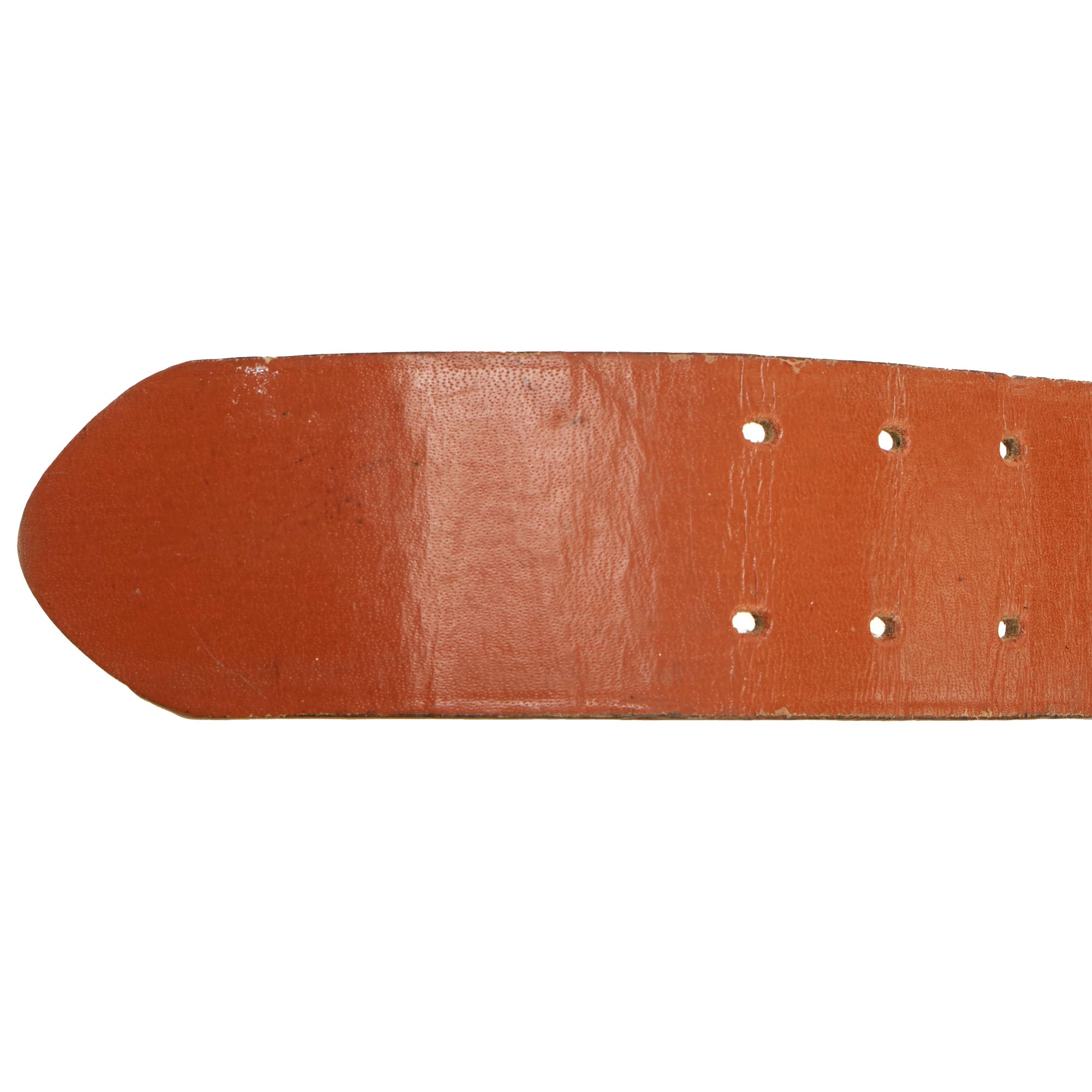 This is a lovely service used condition brown Wehrmacht Heer Army officer's open claw belt, made in the wartime 50mm size and produced using brown Preßstoff in place of genuine leather. It features a standard non-magnetic buckle, which looks to be silvered zinc alloy, probably used to save supplies of aluminum. It conforms exactly to the pattern, though there is no maker mark we can see, as these were often ink stamped, which would then wear away. It does have a faint 125 stamp on the opposite end, for 125cm (49.2 inches). We measured it, and it is adjustable approximately from 36 to 44 inches, so it looks to have shrunken over the years.