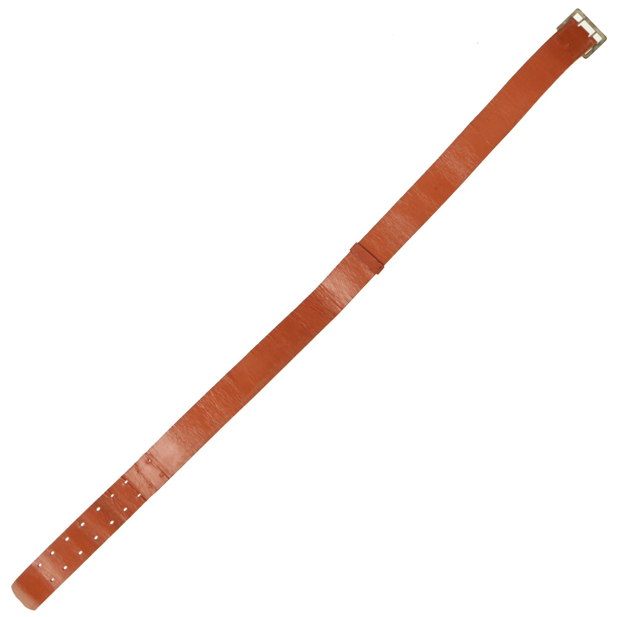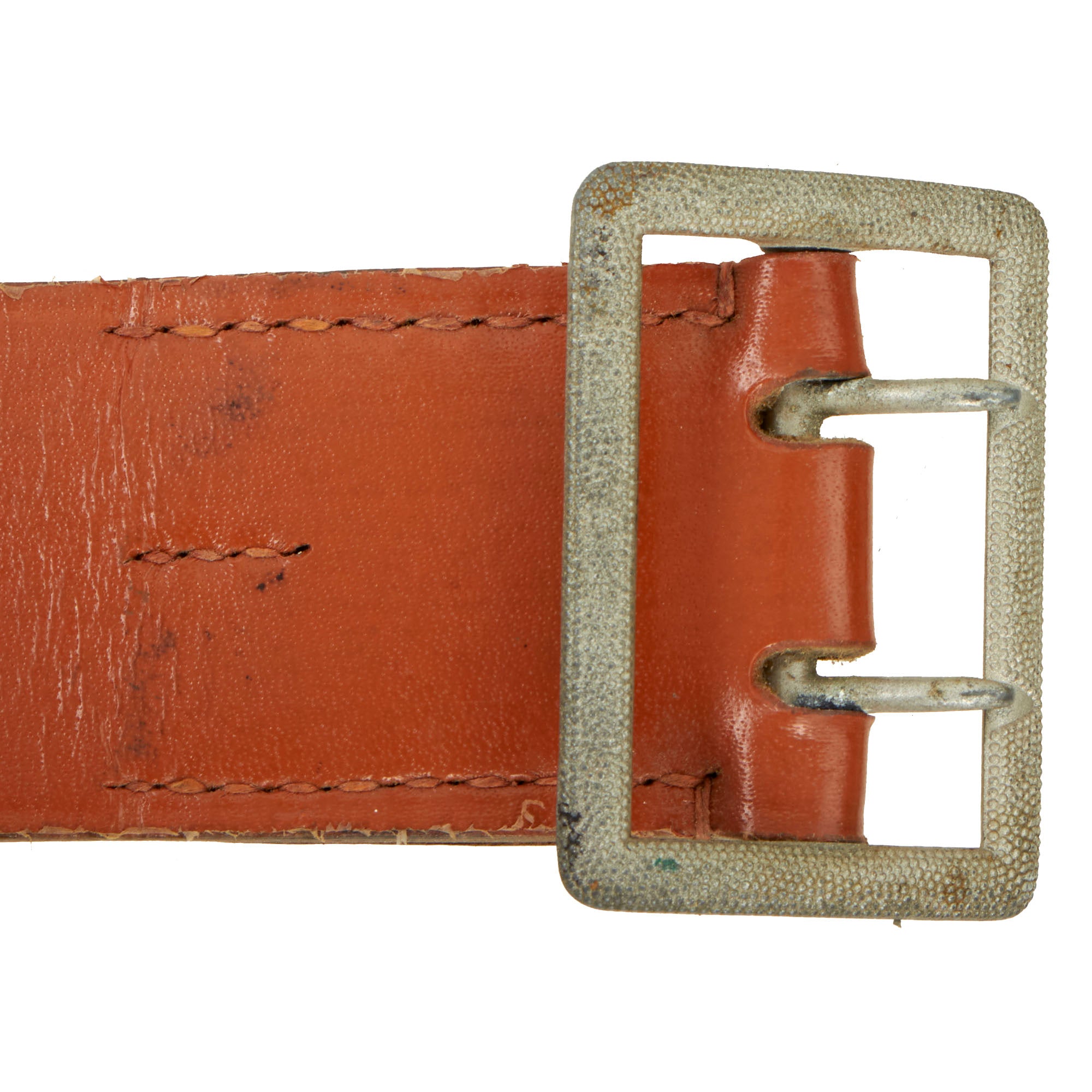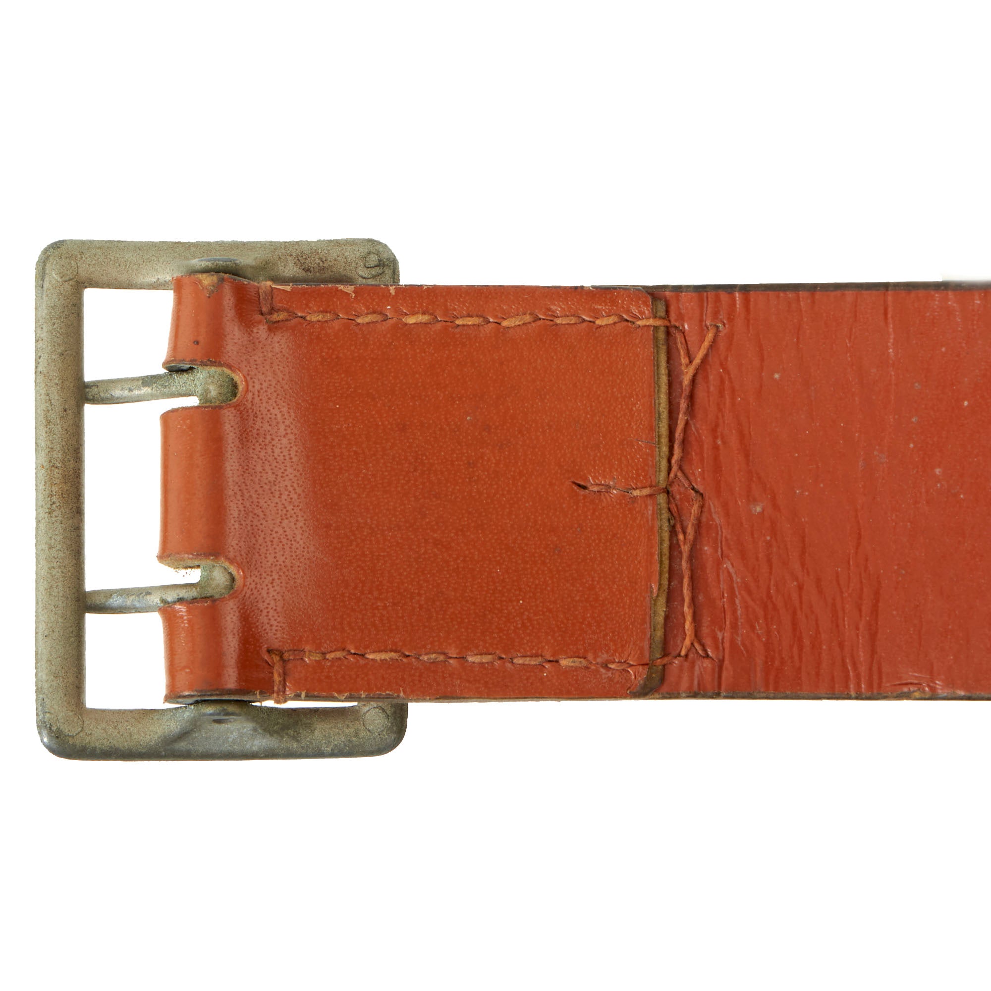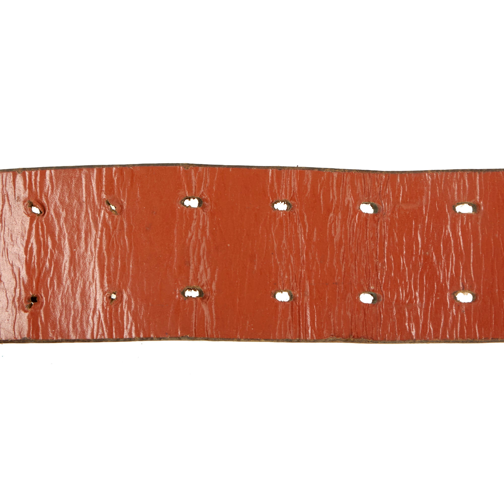 This is a lovely service used condition brown Wehrmacht Heer Army officer's open claw belt, made in the wartime 50mm size and produced using brown Preßstoff in place of genuine leather. It features a standard non-magnetic buckle, which looks to be silvered zinc alloy, probably used to save supplies of aluminum. It conforms exactly to the pattern, though there is no maker mark we can see, as these were often ink stamped, which would then wear away. It does have a faint 125 stamp on the opposite end, for 125cm (49.2 inches). We measured it, and it is adjustable approximately from 36 to 44 inches, so it looks to have shrunken over the years.