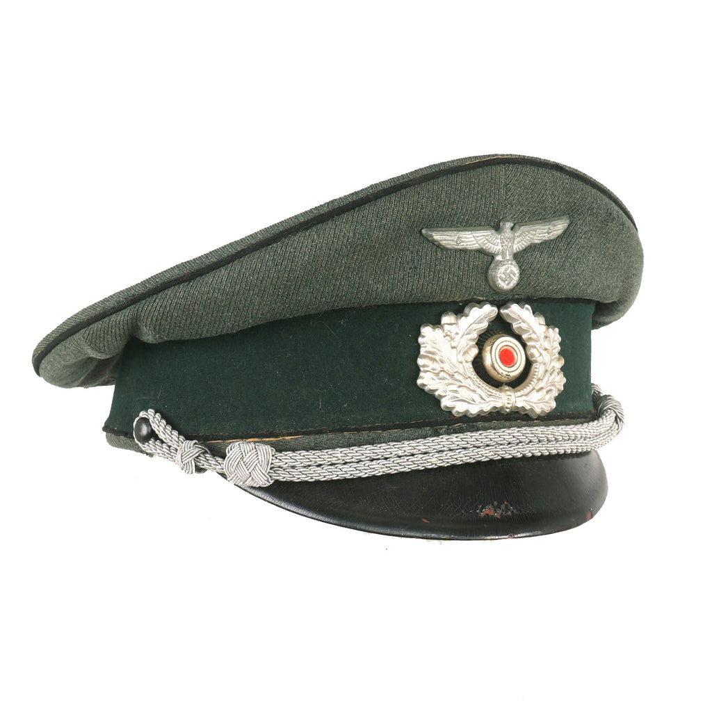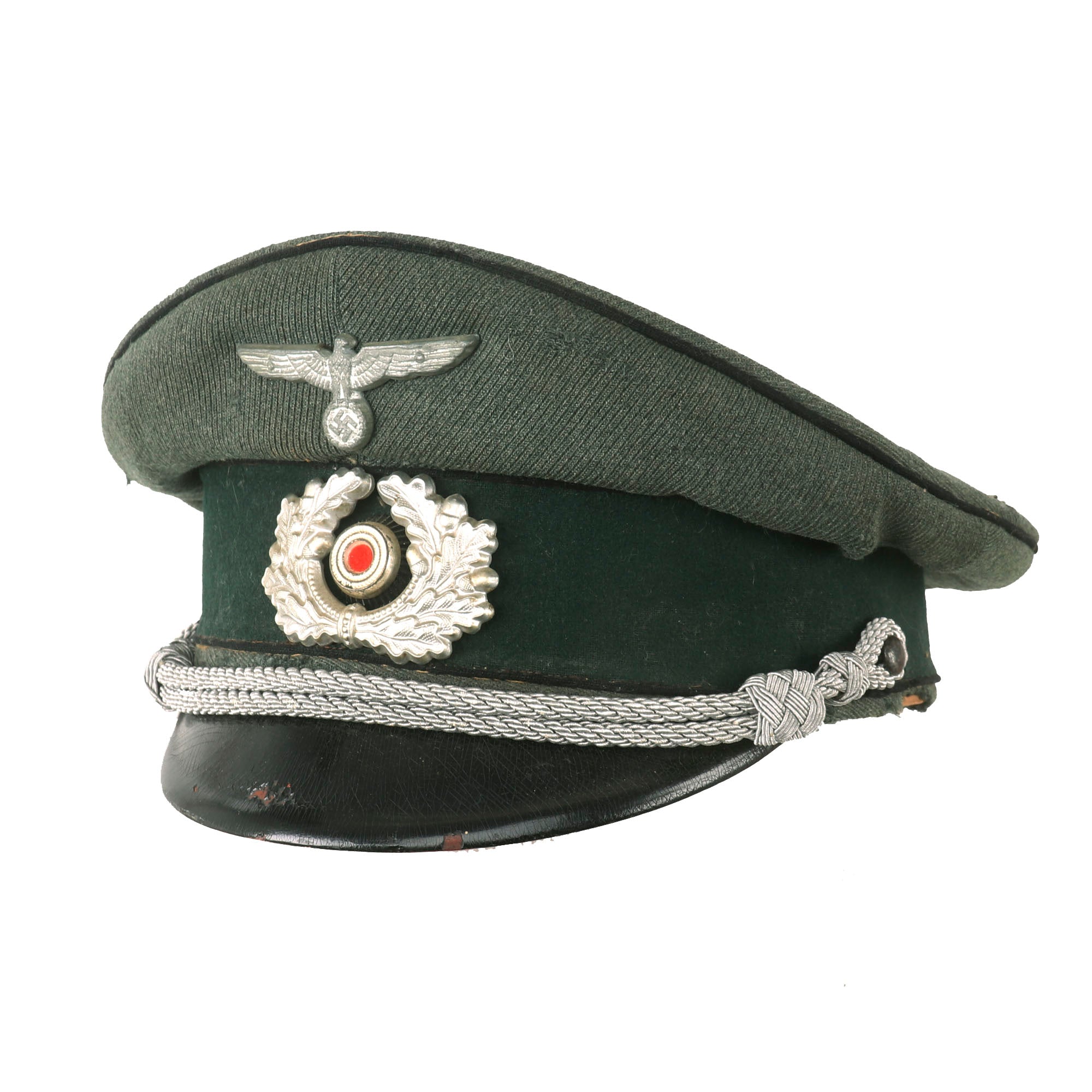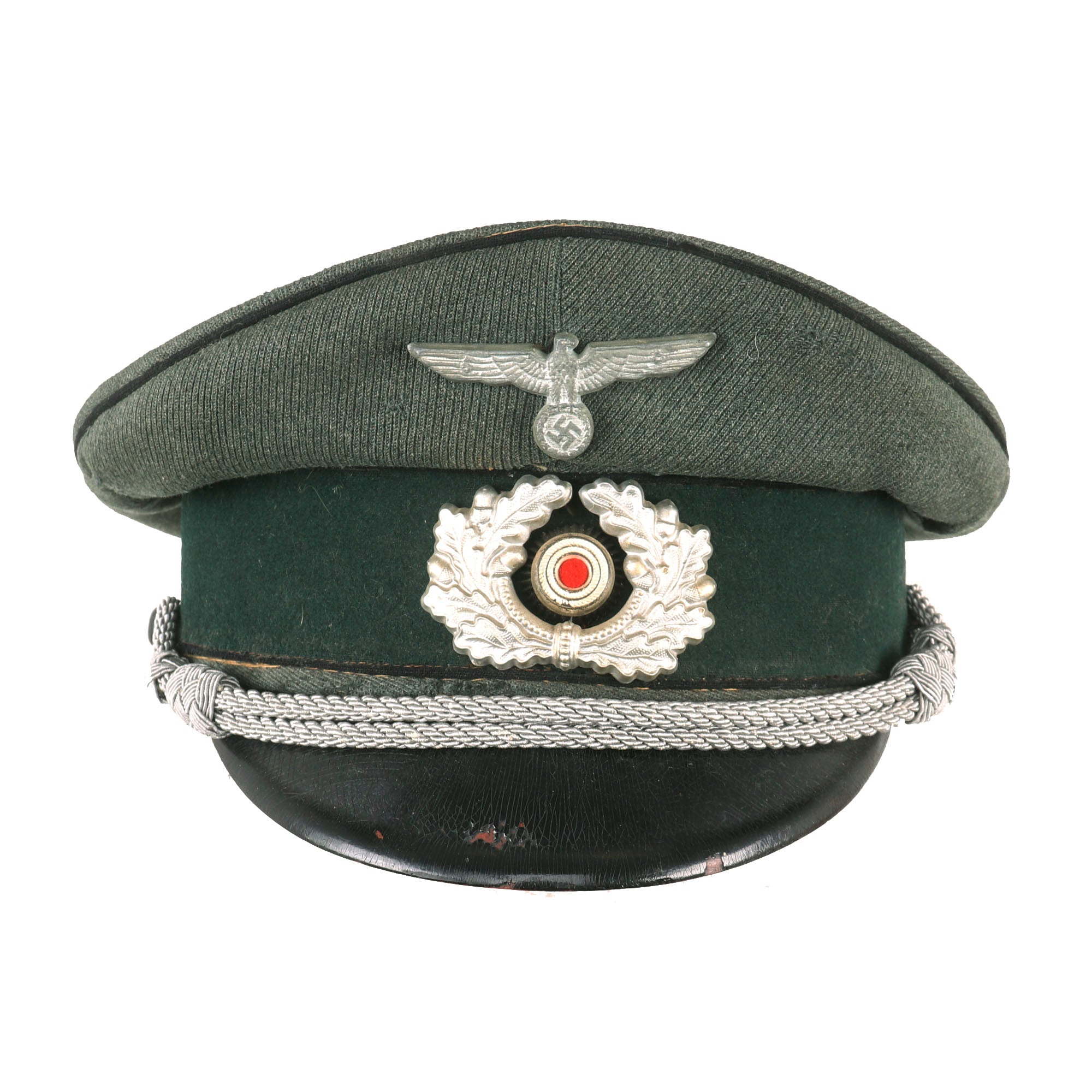 The visor cap (Schirmmütze) was an important part of the headgear worn by German uniformed military, civil, paramilitary and political organizations during the Third Reich. This was the standard cloth headgear worn as a part of the service uniform. Visor caps were worn outdoors as well as indoors, and were often required to be worn by all personnel on duty. Visor caps were made in versions specific to each organization and were often further differentiated through the use of insignia, colored piping, or style of chin cord, to indicate rank, role or branch. The insignia used on these caps ranged from simple stamped metal emblems, to elaborate hand embroidery. Visor caps were issued to enlisted soldiers and NCOs in the military and in some other organizations. Officers had to purchase their own hats, and lower ranks could choose to purchase caps that were of a higher quality than the rather basic, issue examples. The private purchase caps were generally made in very high quality, with fine materials. A wide variety of fabrics were used, from Trikot and doeskin, to heavy wool, or even lightweight white fabric for summer wear. In the military, issue of these caps was generally suspended shortly after the outbreak of the war, but they continued to be worn by some troops until the end of the war.