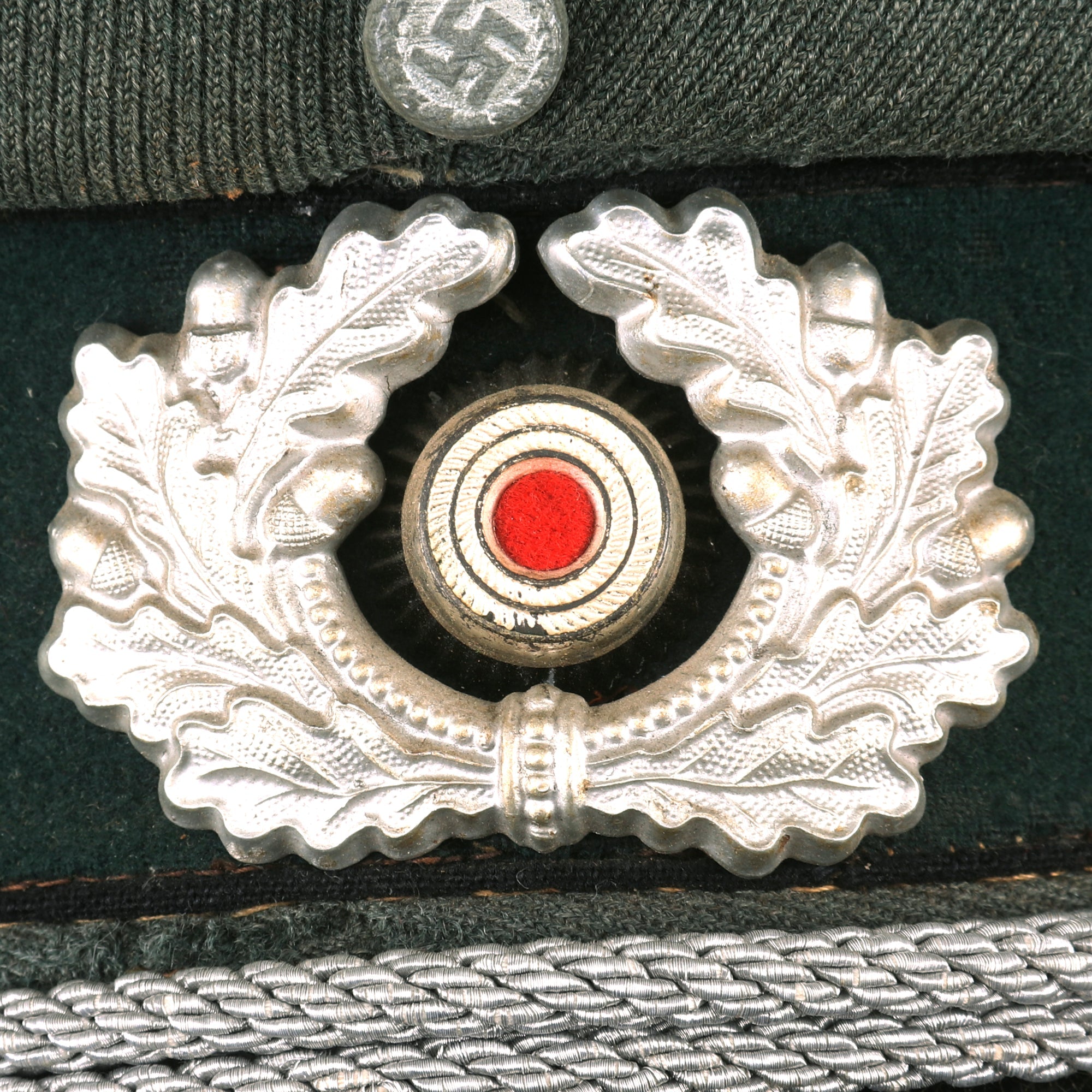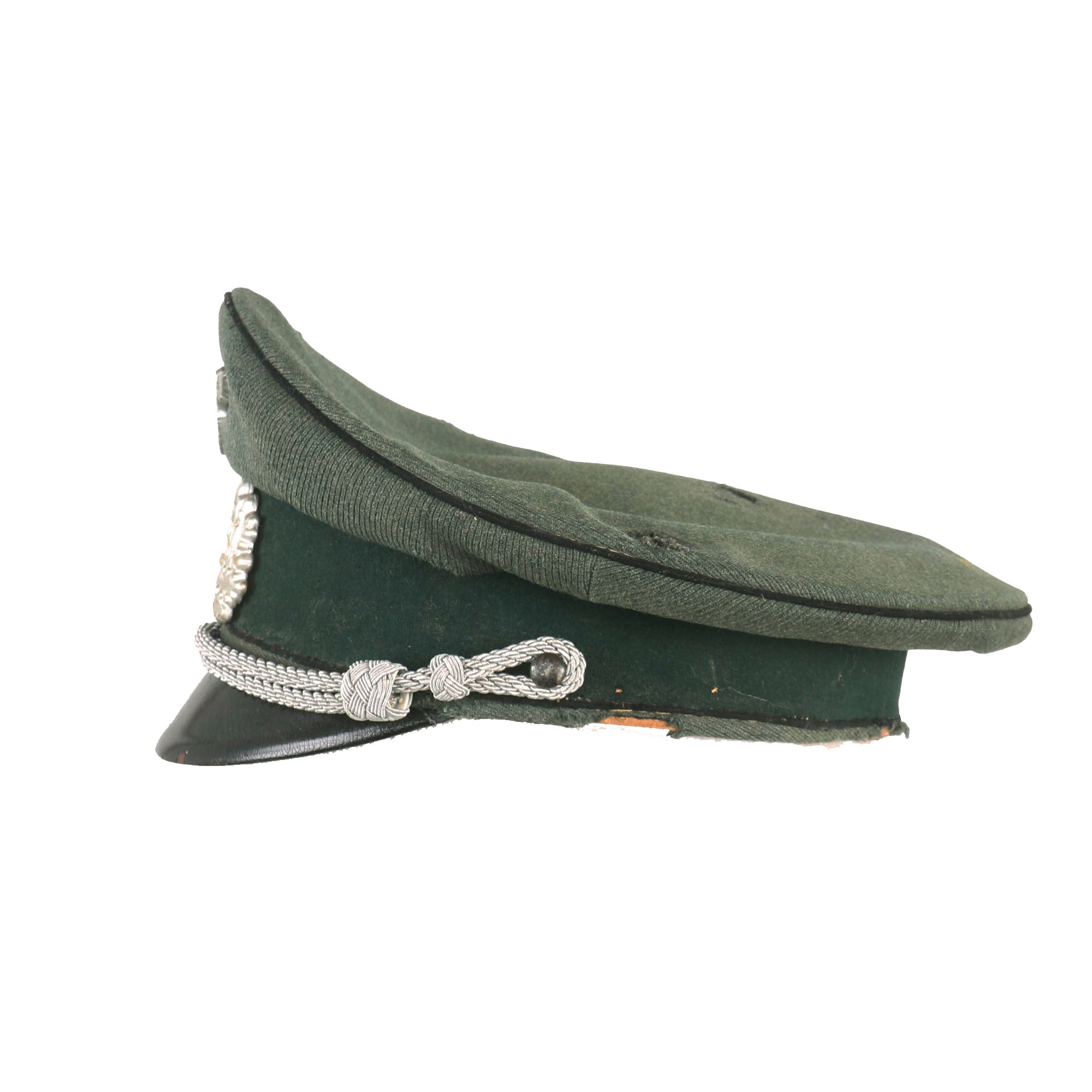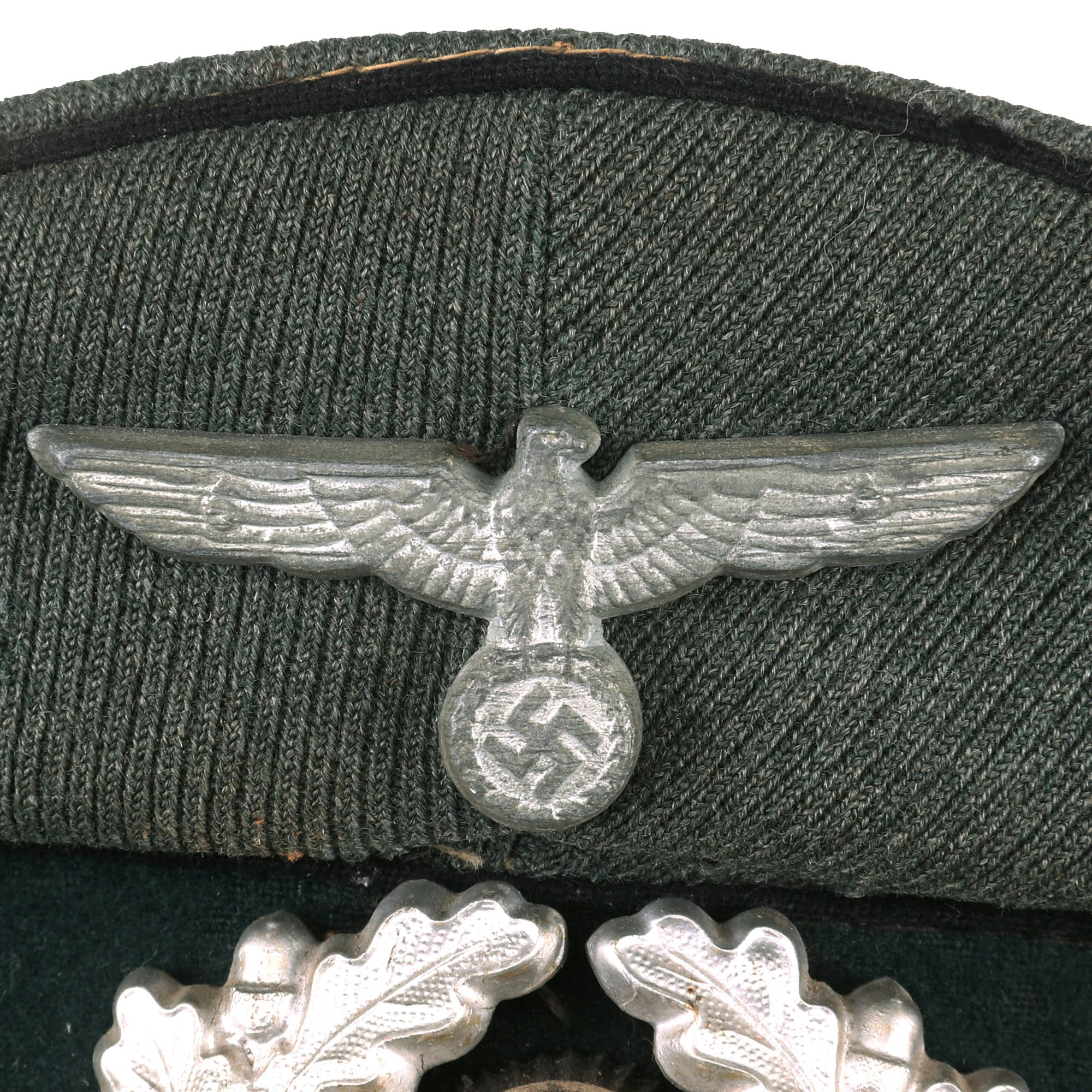 The visor cap (Schirmmütze) was an important part of the headgear worn by German uniformed military, civil, paramilitary and political organizations during the Third Reich. This was the standard cloth headgear worn as a part of the service uniform. Visor caps were worn outdoors as well as indoors, and were often required to be worn by all personnel on duty. Visor caps were made in versions specific to each organization and were often further differentiated through the use of insignia, colored piping, or style of chin cord, to indicate rank, role or branch. The insignia used on these caps ranged from simple stamped metal emblems, to elaborate hand embroidery. Visor caps were issued to enlisted soldiers and NCOs in the military and in some other organizations. Officers had to purchase their own hats, and lower ranks could choose to purchase caps that were of a higher quality than the rather basic, issue examples. The private purchase caps were generally made in very high quality, with fine materials. A wide variety of fabrics were used, from Trikot and doeskin, to heavy wool, or even lightweight white fabric for summer wear. In the military, issue of these caps was generally suspended shortly after the outbreak of the war, but they continued to be worn by some troops until the end of the war.