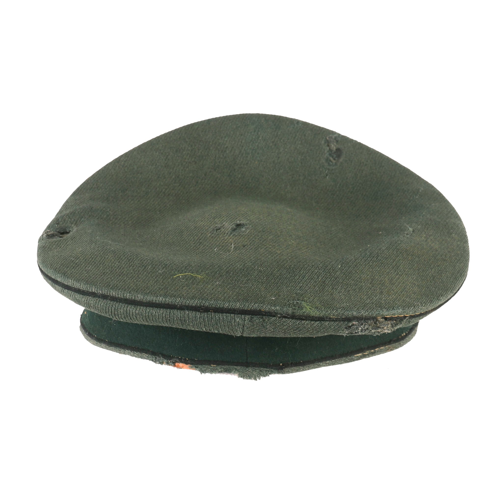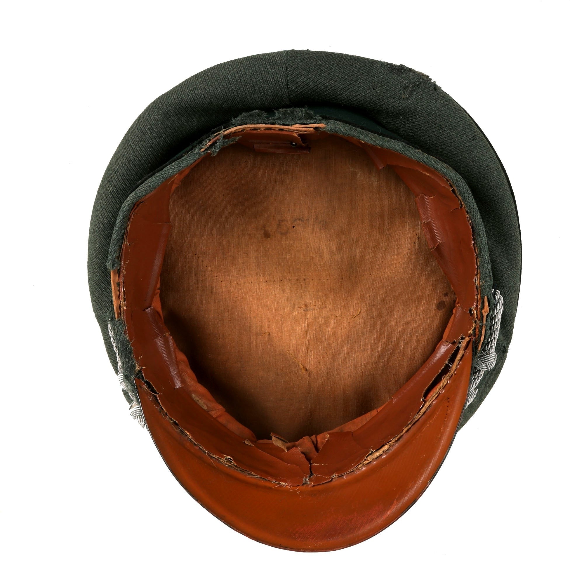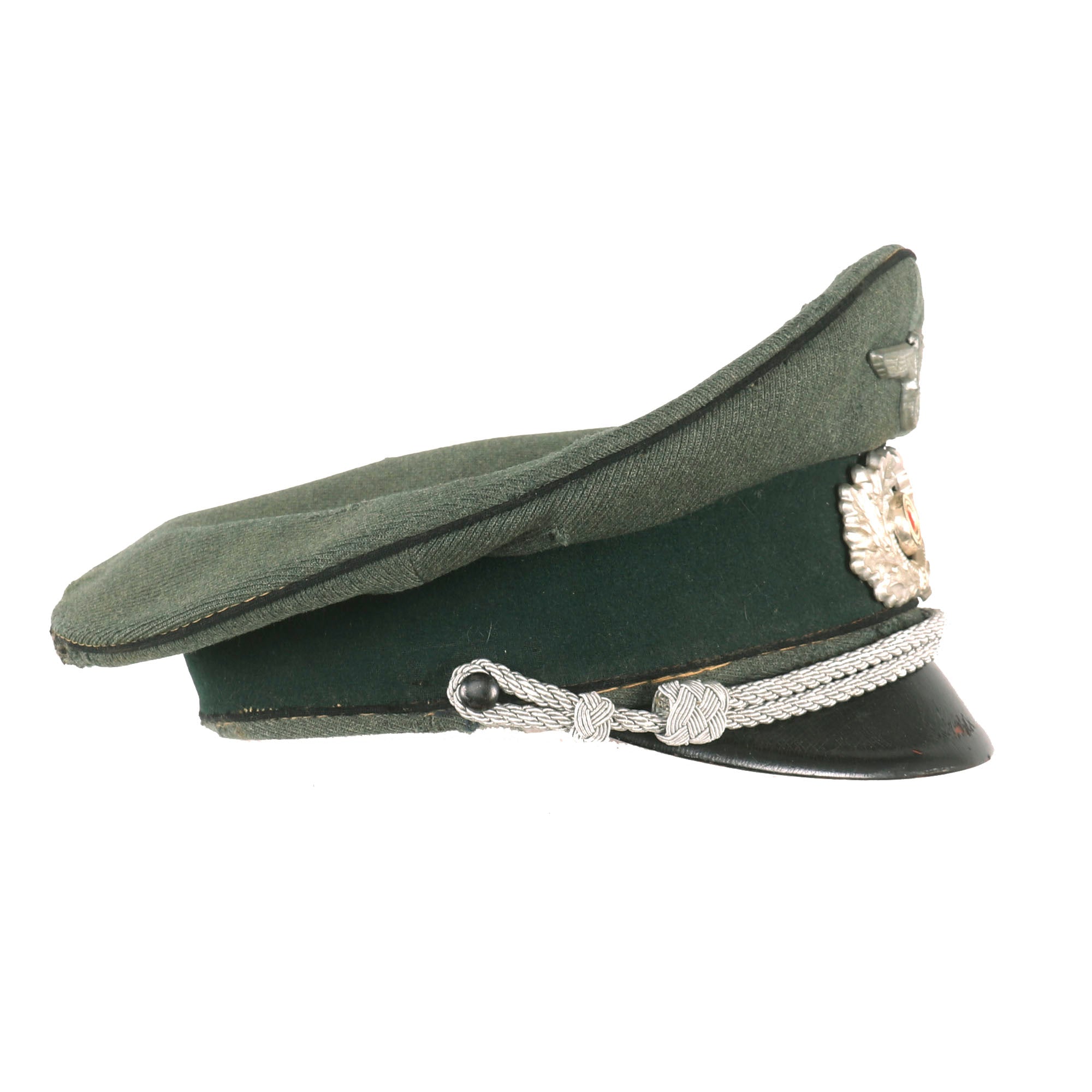 Original Item: Only One Available. This cap is a very nice service used example of a German WWII Wehrmacht Heer Pioneer Officer Schirmmütze visor cap. The crown stiffener has been removed, giving it the lovely "saddle form" crushed shape which we all love. It features the typical feldgrau (field gray) "whipcord" weave wool construction with a dark bottle-green (flaschengrün) "badge cloth" band and a traditional high forward crown. It also has matching Schwarz (Black) piping along the top edge and flanking either side of the band. This is the Waffenfarbe (Corps Color) for the Pioniere (Combat engineers), as well as Assault, Armored, Fortress, and Railway engineers. It has the correct silver bullion chin strap, indicating that it is for an officer, though the chin strap is attached to black enamel buttons, so it may have been "field upgraded" from an EM/NCO cap.