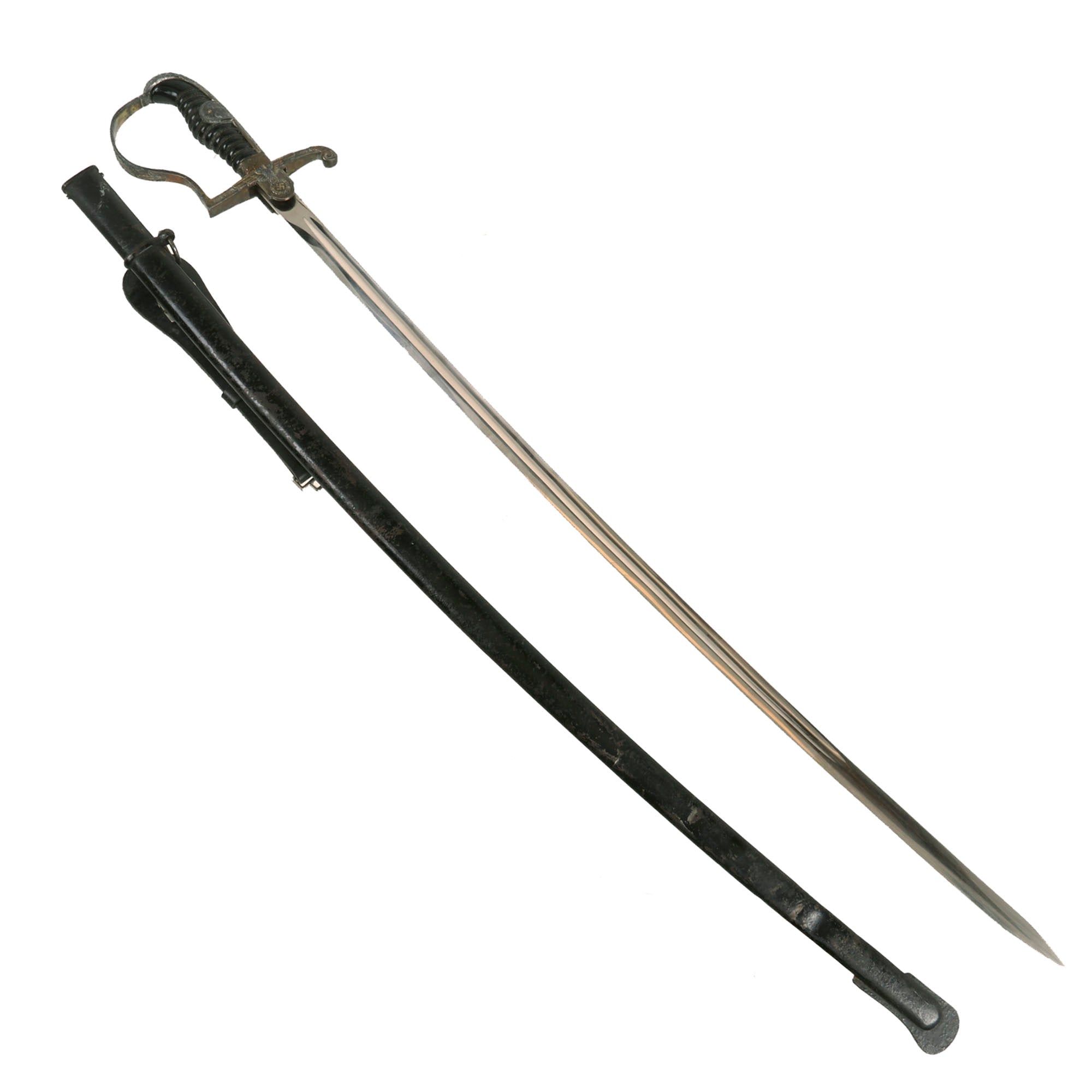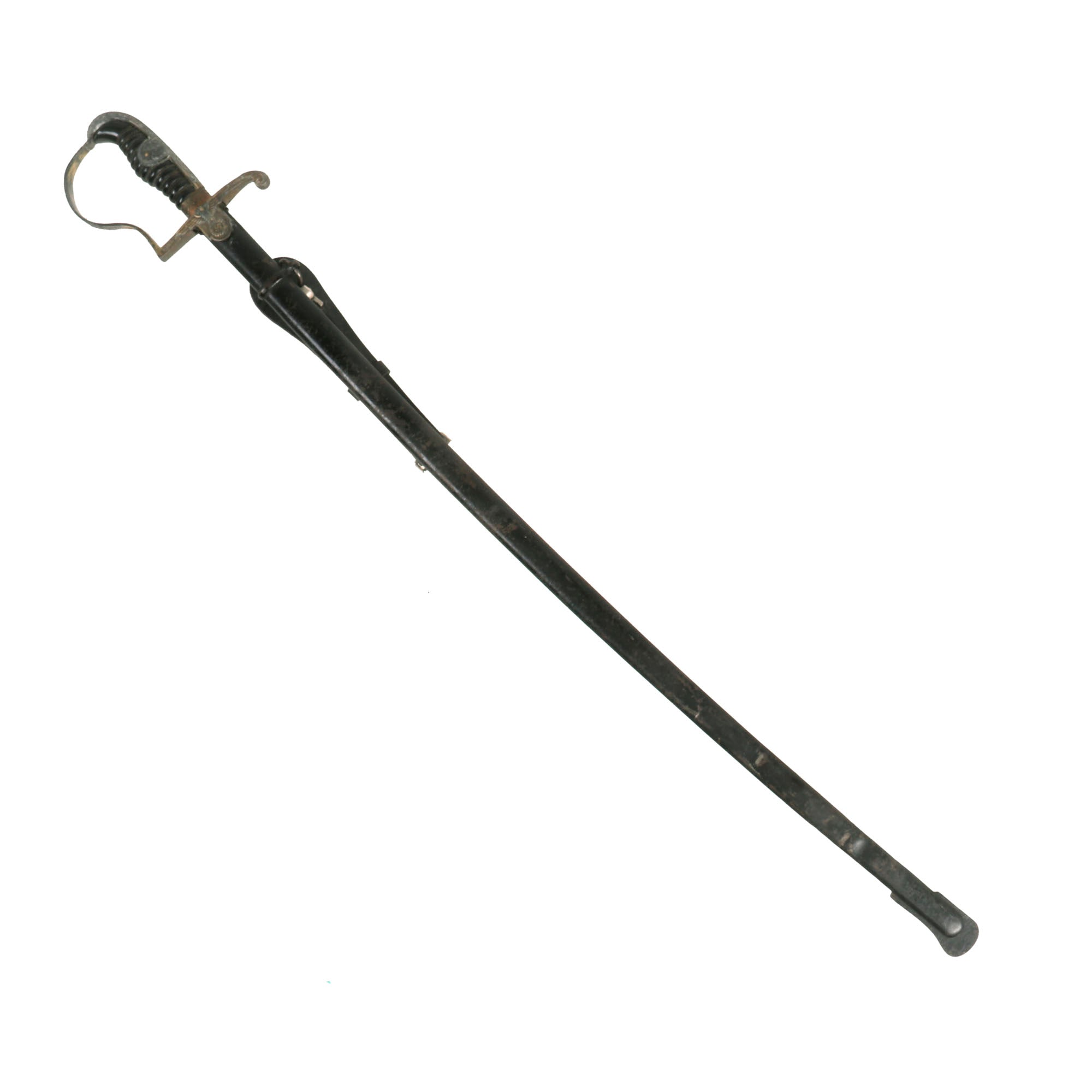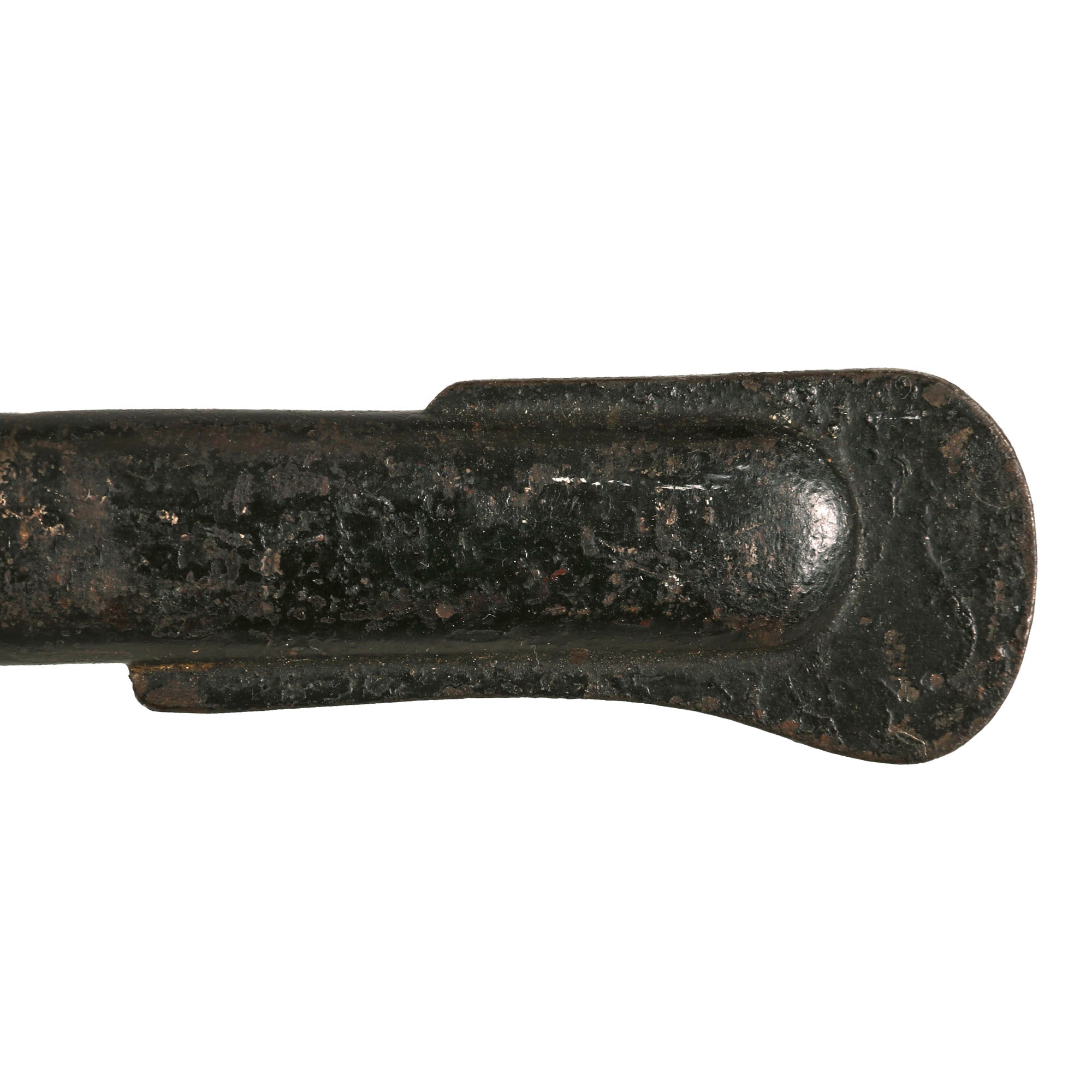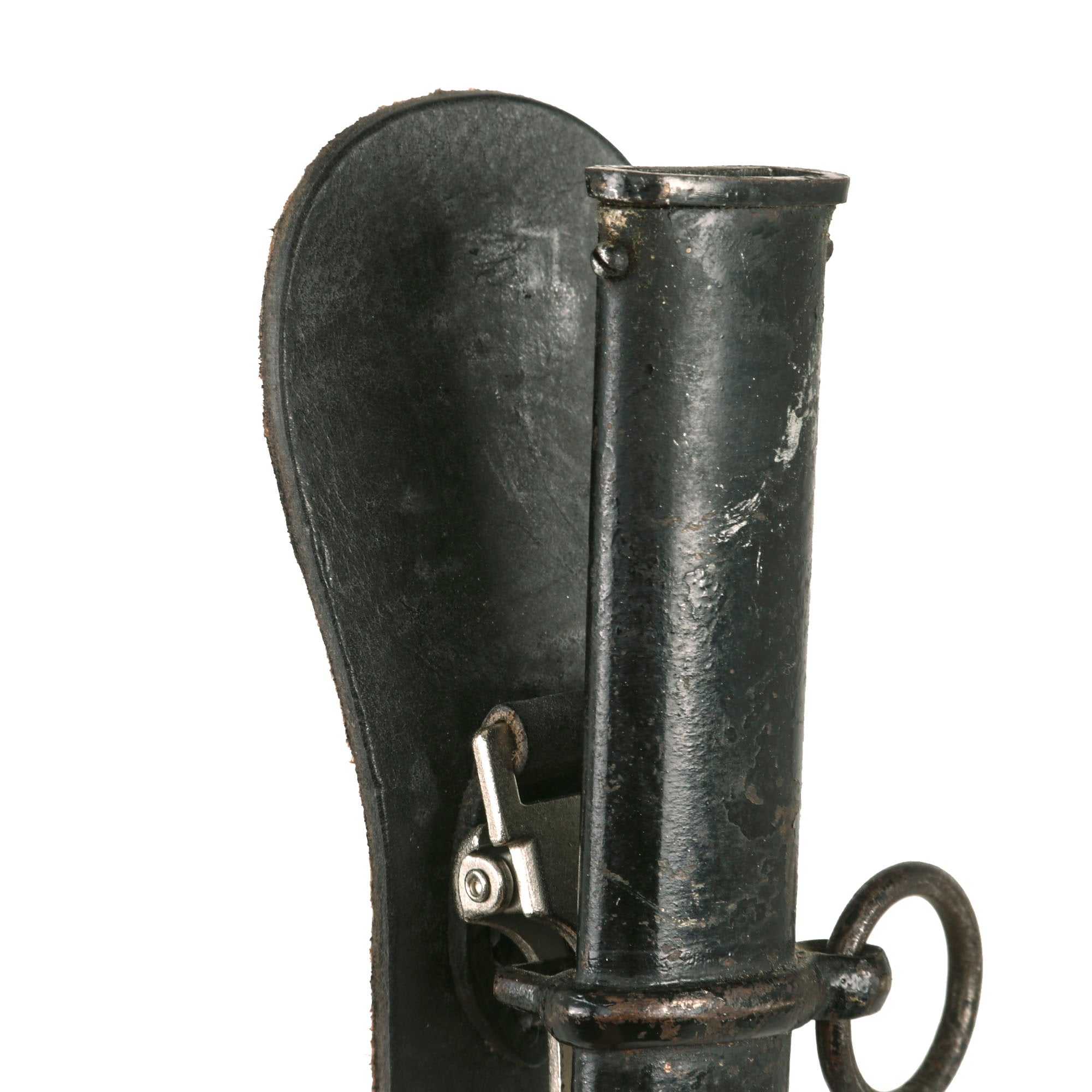 The included scabbard is still in very good condition, and does not have any major dents or bends that we can detect in the steel body. The black enamel paint is still in good shape, however it definitely does show some light wear and oxidation from age. There is checking and crazing throughout, only possible due to years of age. The scabbard still retains the original hanger ring and flat loop to hook on the belt hanger.