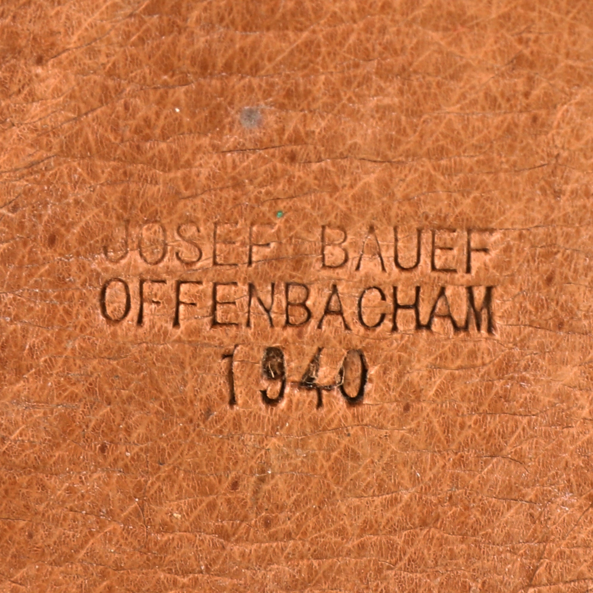 Attached to the scabbard when we received it is a very nice "teardrop" leather sword hanger, of the type that would be attached to a clip on the inside of the tunic, and then fed out through the pocket hole. It is in unissued condition, and we have considered that it may be a high end replica. It is marked on the back with.